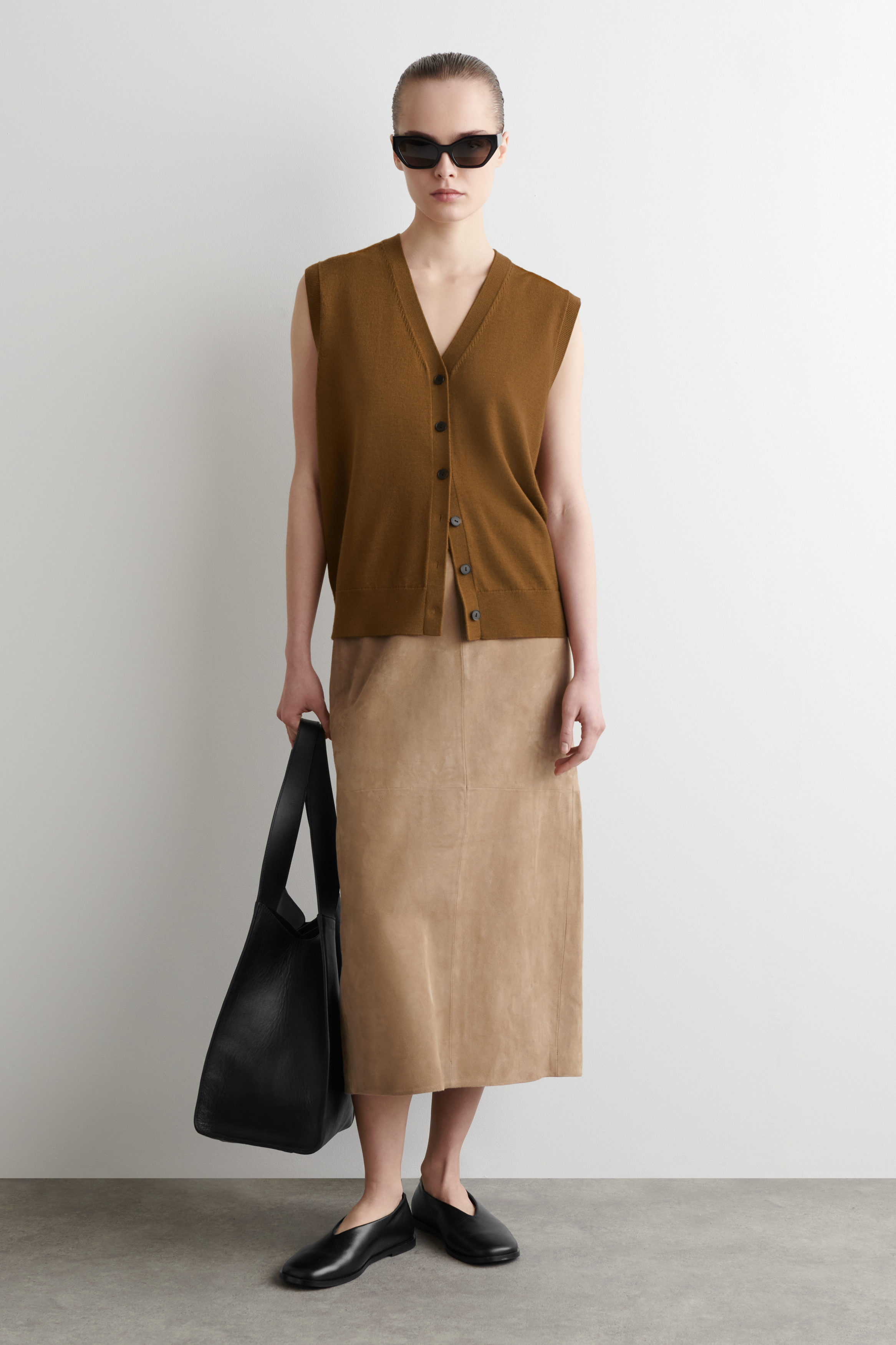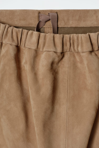 En modern nytolkning av en klassiker – denna midikjol är tillverkad av förstklassig, mjuk mocka och har en rak silhuett. Den är detaljerad med färgmatchade sömmar, en diskret dragsko i den delvis elastiska linningen som ger en bekväm passform. Våra stylister föreslår att du bär den med andra plagg i mocka, som den matchande skjortan.