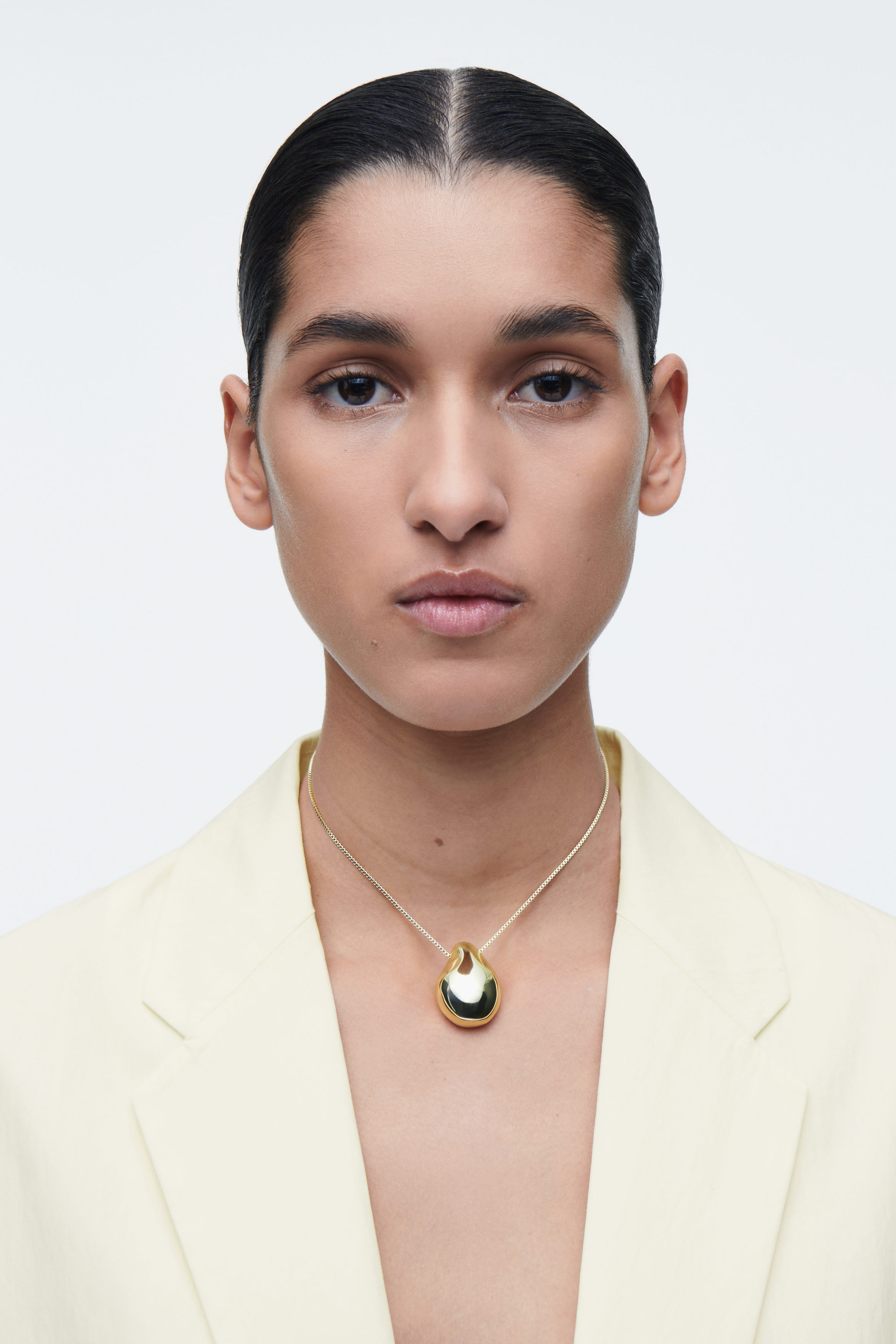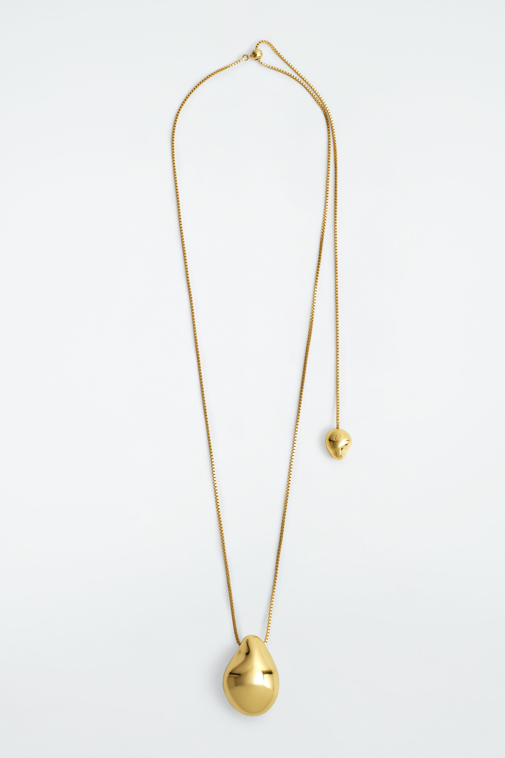 Detta droppformade hänge är tillverkat av guldpläterad, återvunnen mässing och är lika stilrent som iögonfallande. Berlocken hänger från en tunn veneziakedja med reglerbar längd och ger en elegant finish till varje outfit.