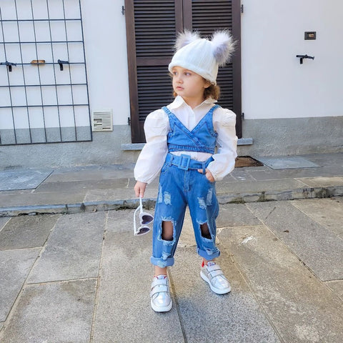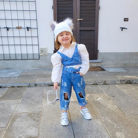 This denim vest is a great cover-up addition for this season. Updating your girl's classic outfits makes her look more stylish and keeps her warm.  Featuring a white long sleeve shirt and a denim vest. This outfit comes with matching ripped jeans. Get ready for a street-style basic.