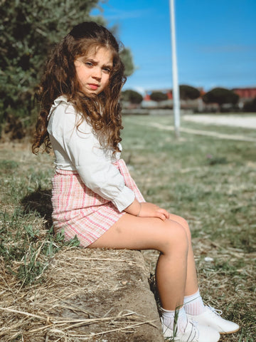 Update your little one's wardrobe with this peter pan collar outfit. This chic peter pan lace collar fastens up with front buttons down and elastic frilled cuffs. Comes in a set of suspender skirt. The skirt features a cotton blend composition and supportive shoulder straps for added versatility and styling.