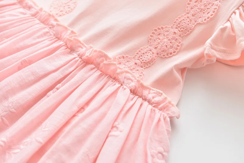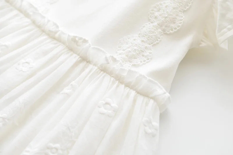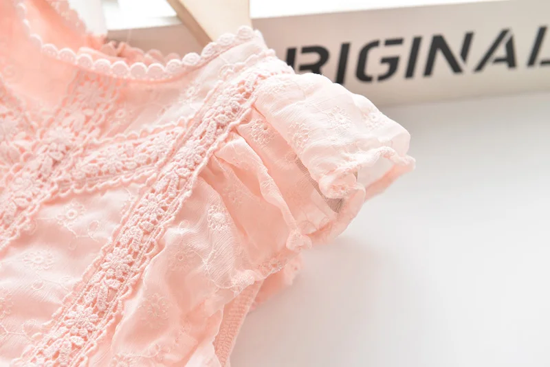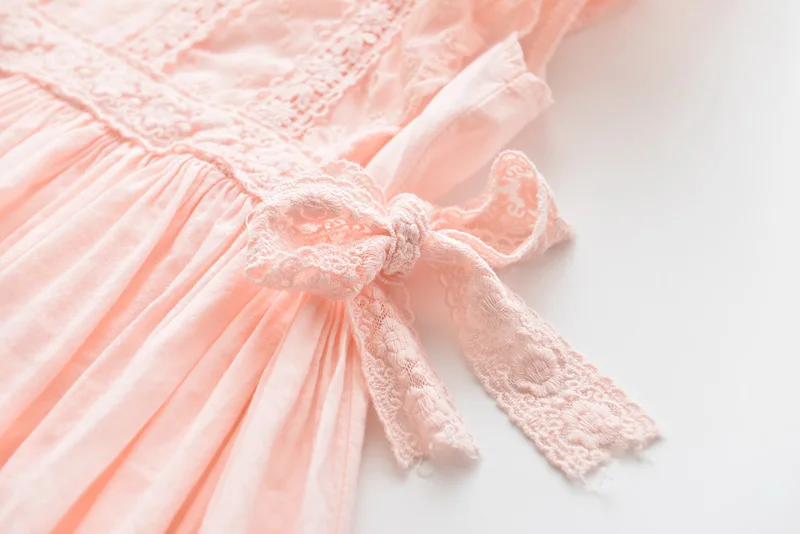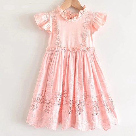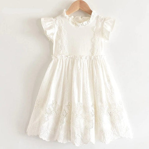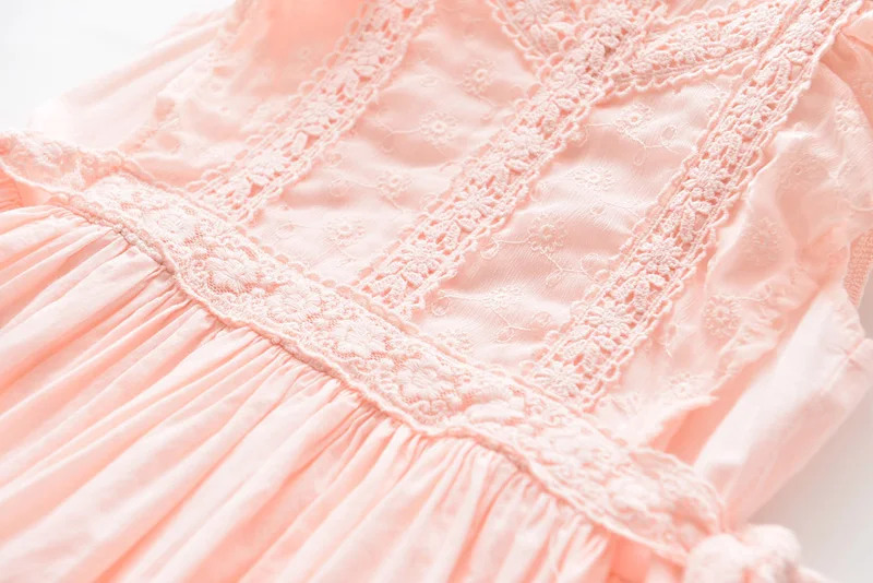 Perfect for any special occasions, this beautiful lace embroidery dress features a detailed lace design on its front, ruffles sleeveless, and a ribbon tie on both sides waist. It is soft and comfy to wear.
