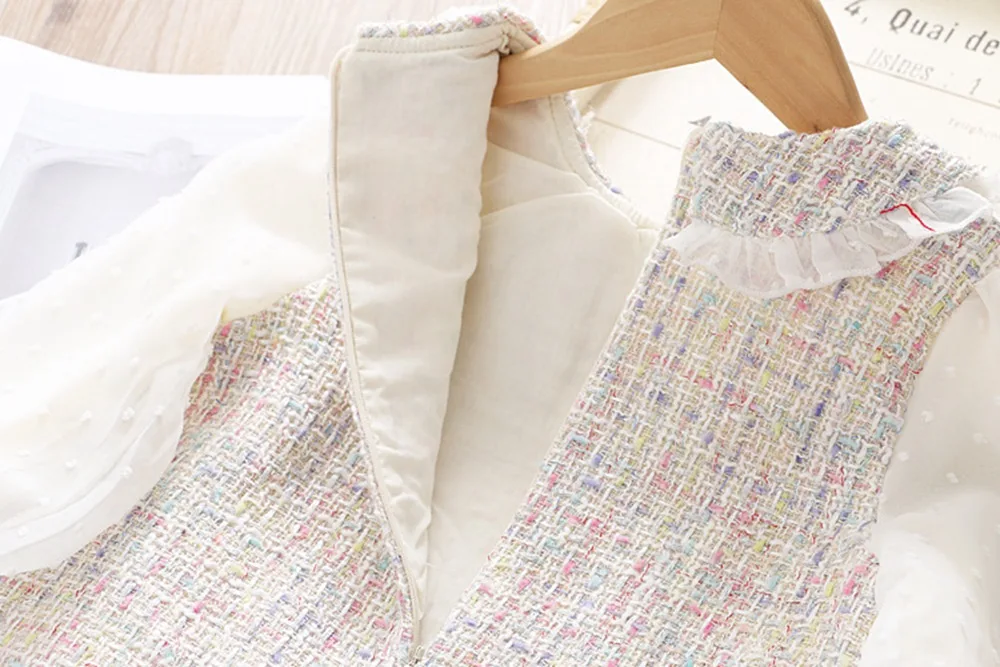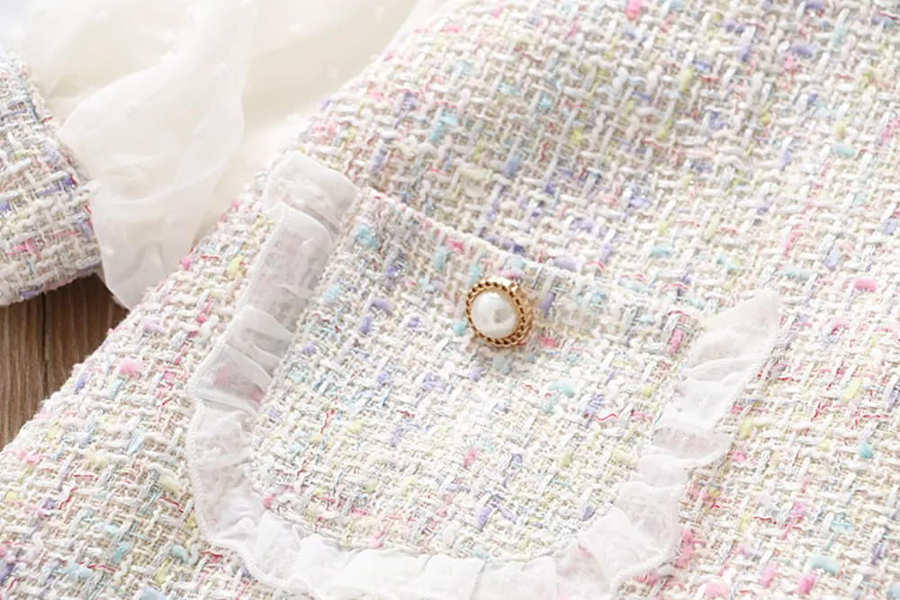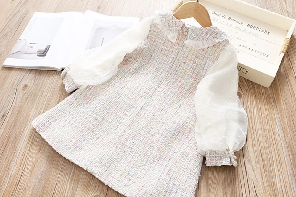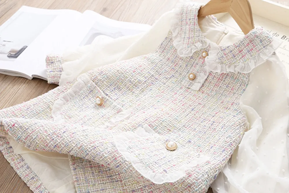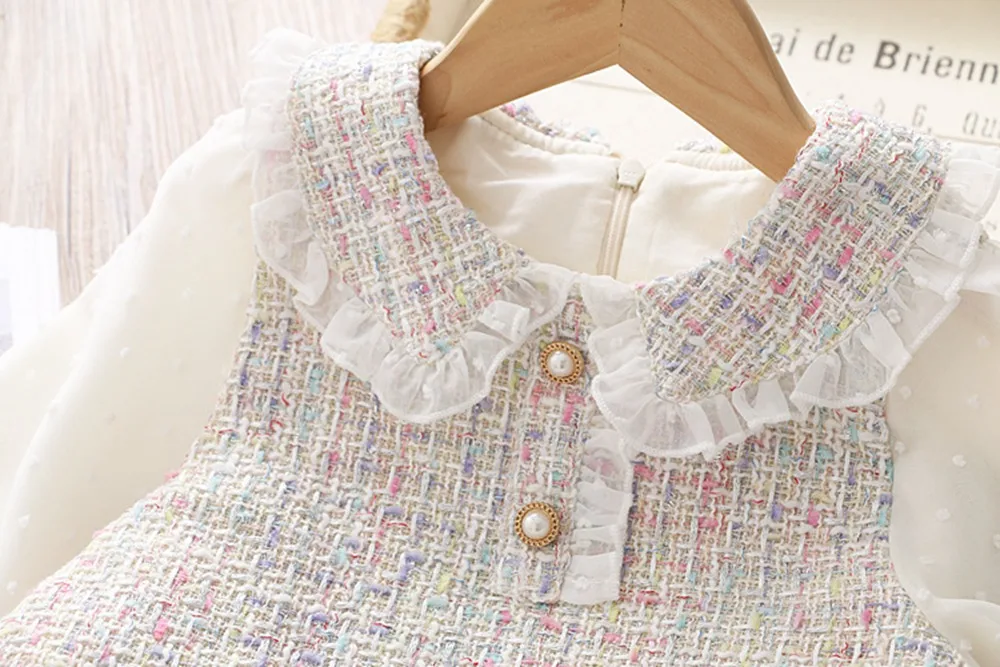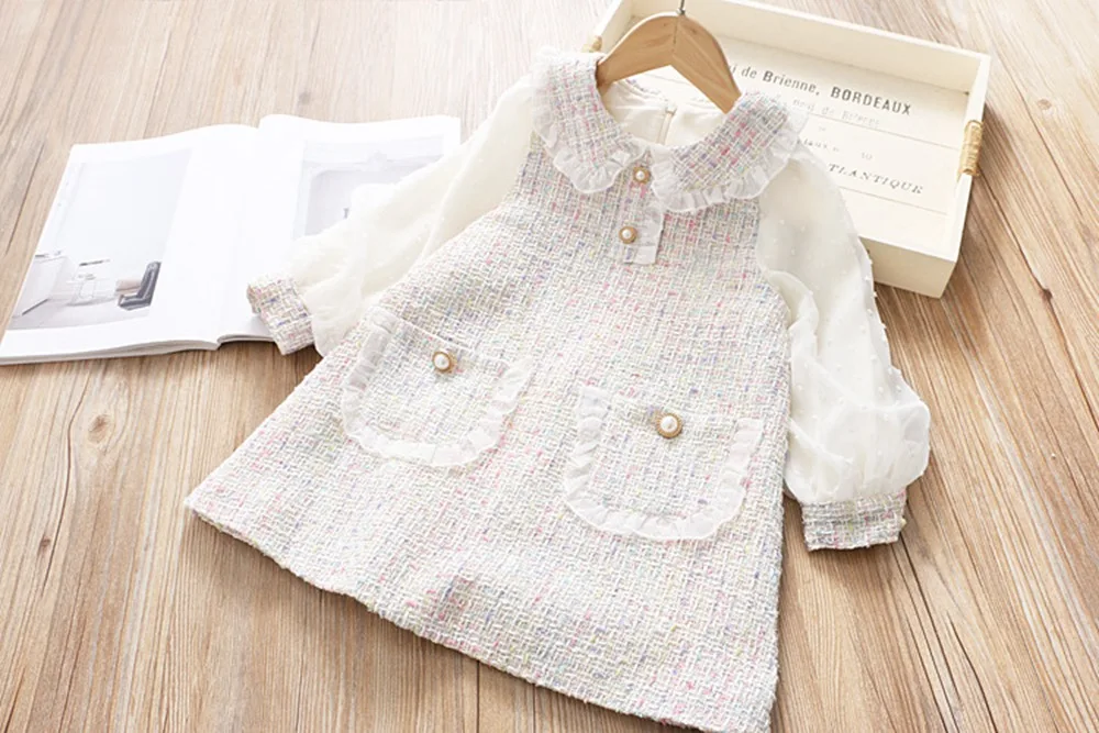 This long-sleeve lace dress will be a perfect addition to her occasion wear wardrobe. This sweet and playful dress features a peter pan collar with lace, knee-length with pearl buttons that add a touch of charm. The perfect dress for parties and special family occasions.