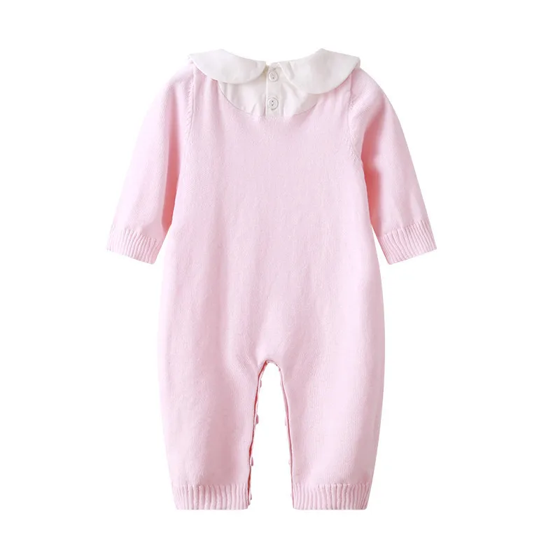 Sweet and simple romper for your little ones. Your baby will feel fabulous and cuter wearing this comfy romper. It features a peter pan collar, and a detailed design on the front with a closure button between legs. Give your little one a cozy cuddle romper.