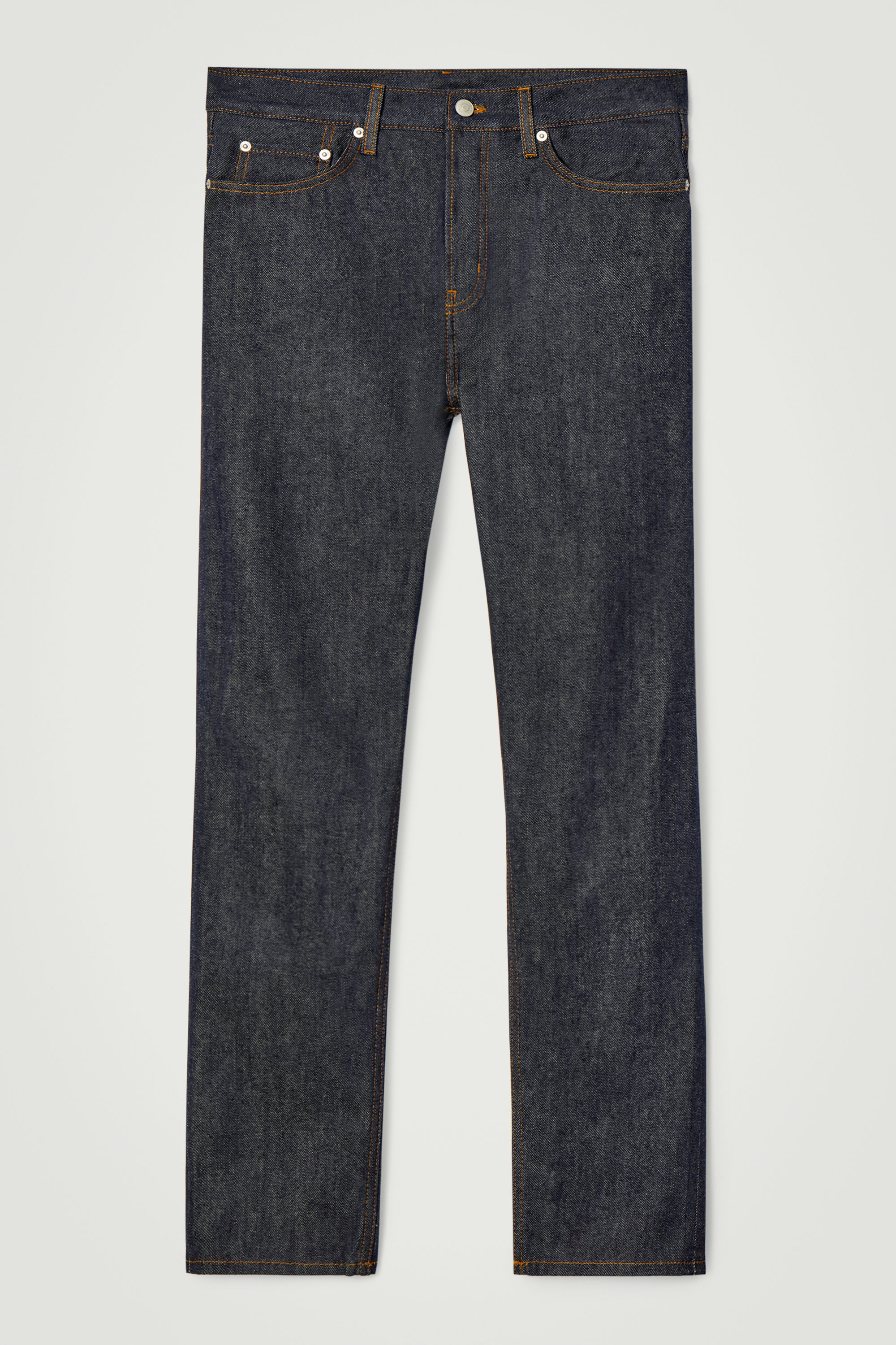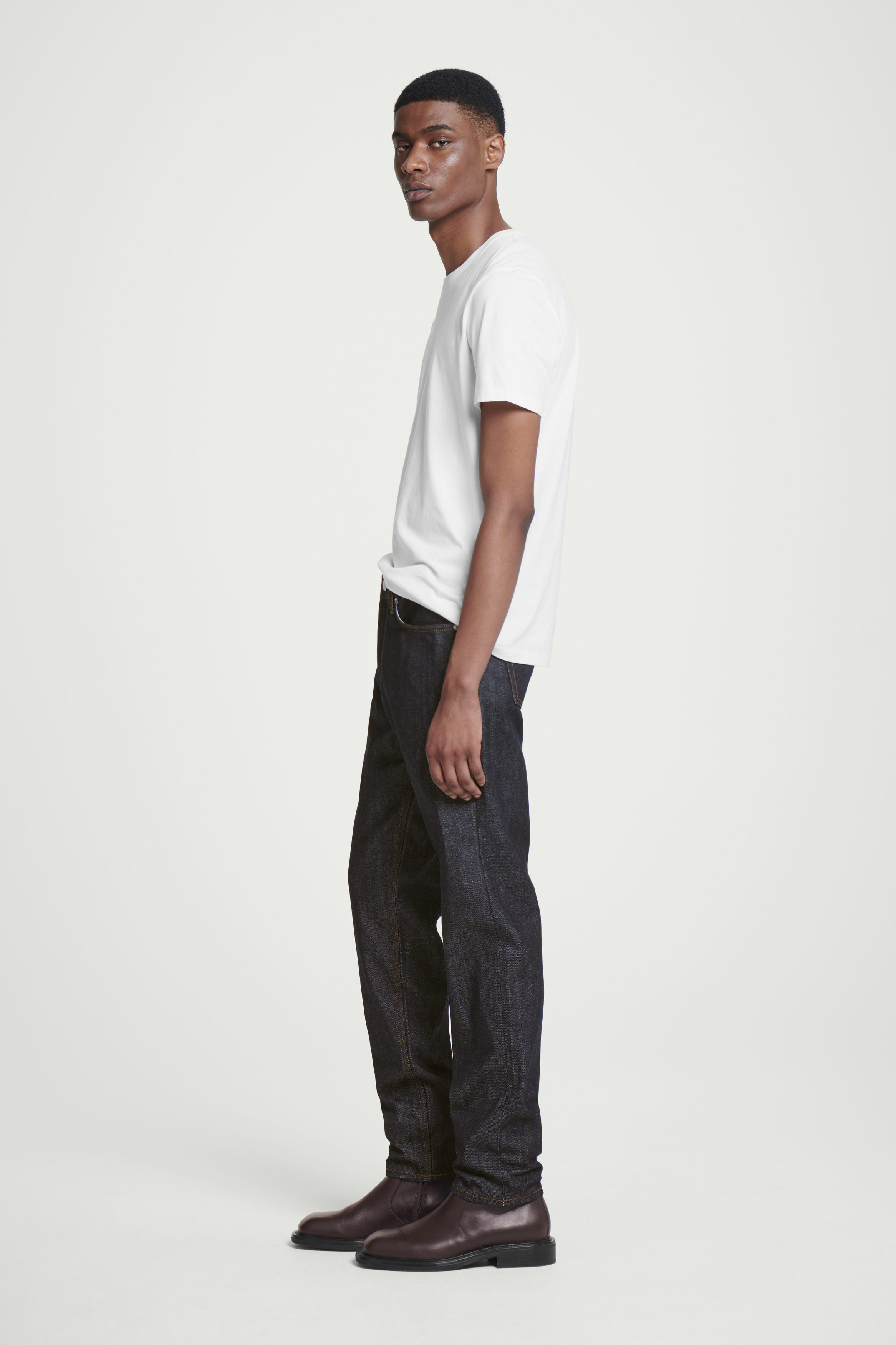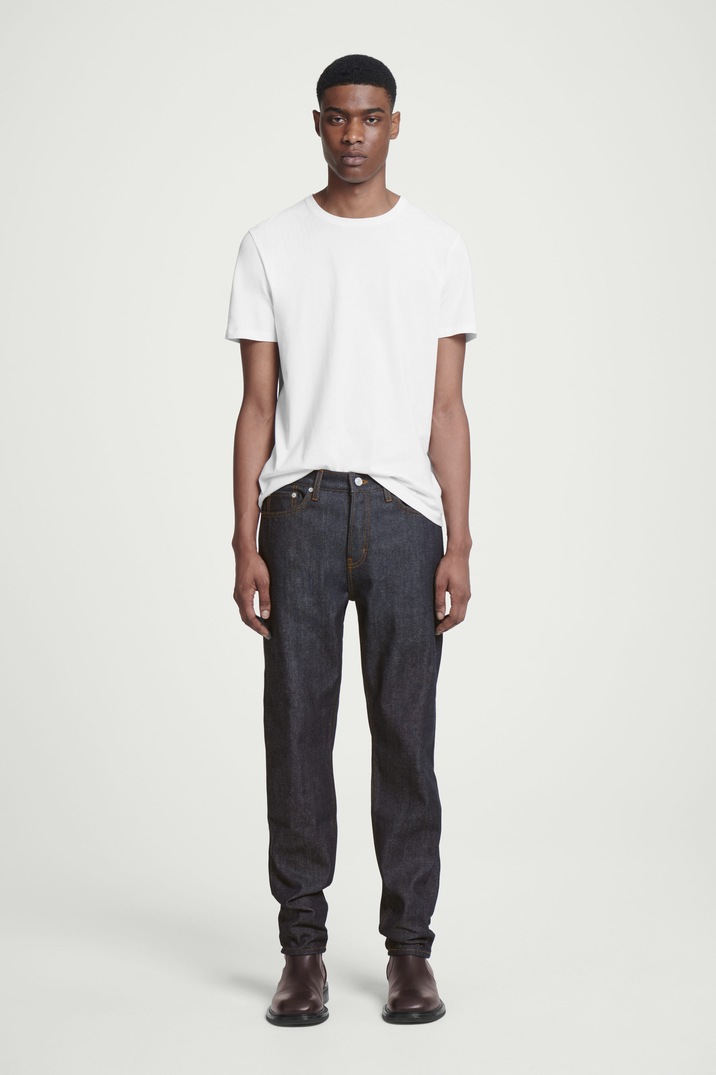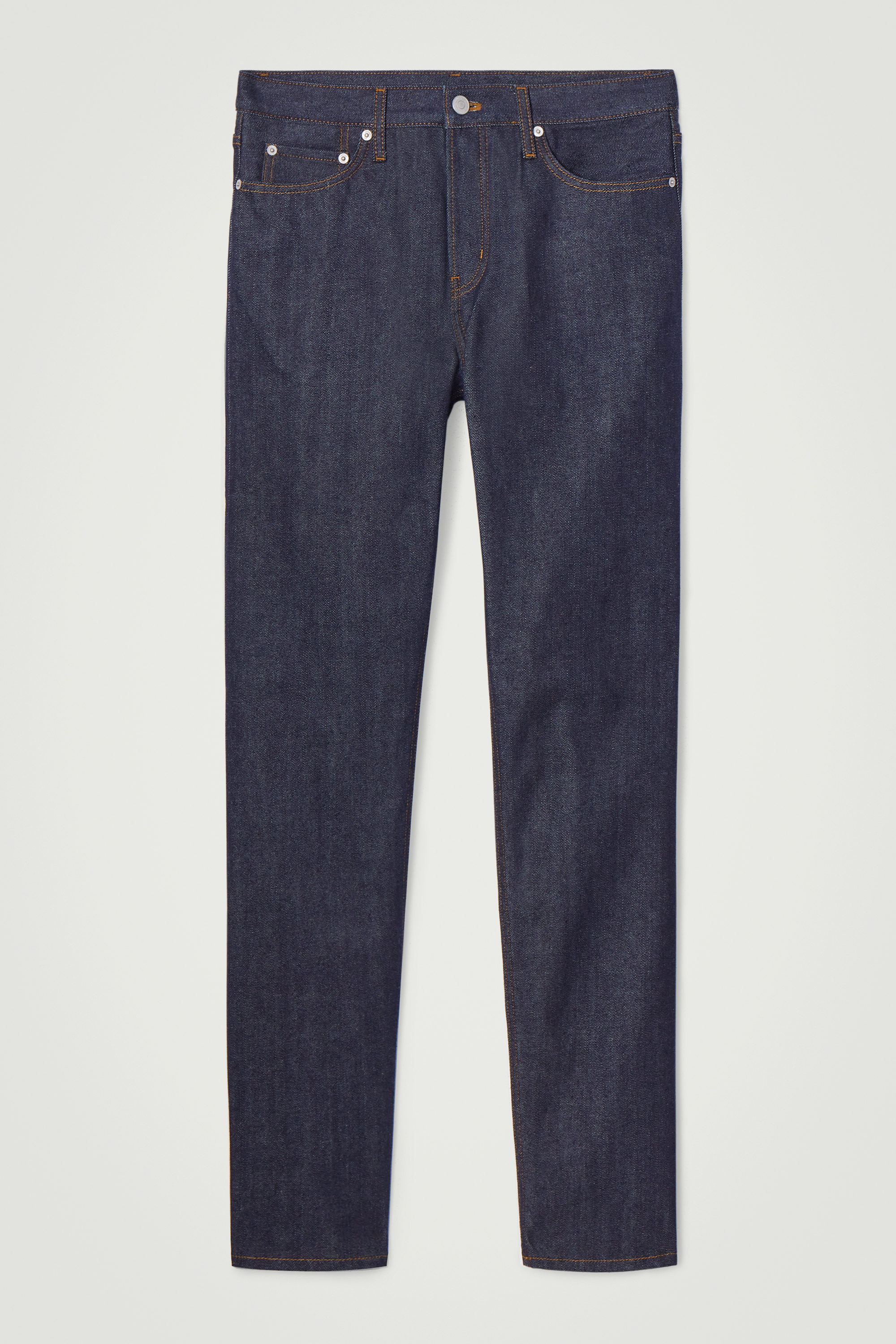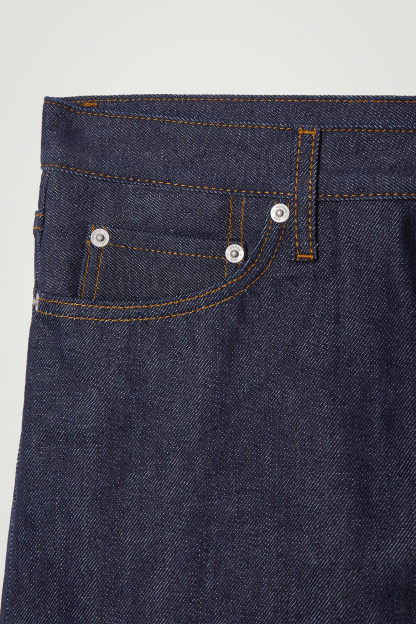 Jeans i klassisk cthtos-modell, sydda av 12 oz-denim (340 g/m2) som lämnats rå för att bevara den djupt indigoblå färgen. Tyget bleks, mjuknar och formar sig efter dina konturer med varje användning. Jeansen har exklusiva selvedgekanter och den medelhöga linningen balanseras med avsmalnande ben mot vristen.