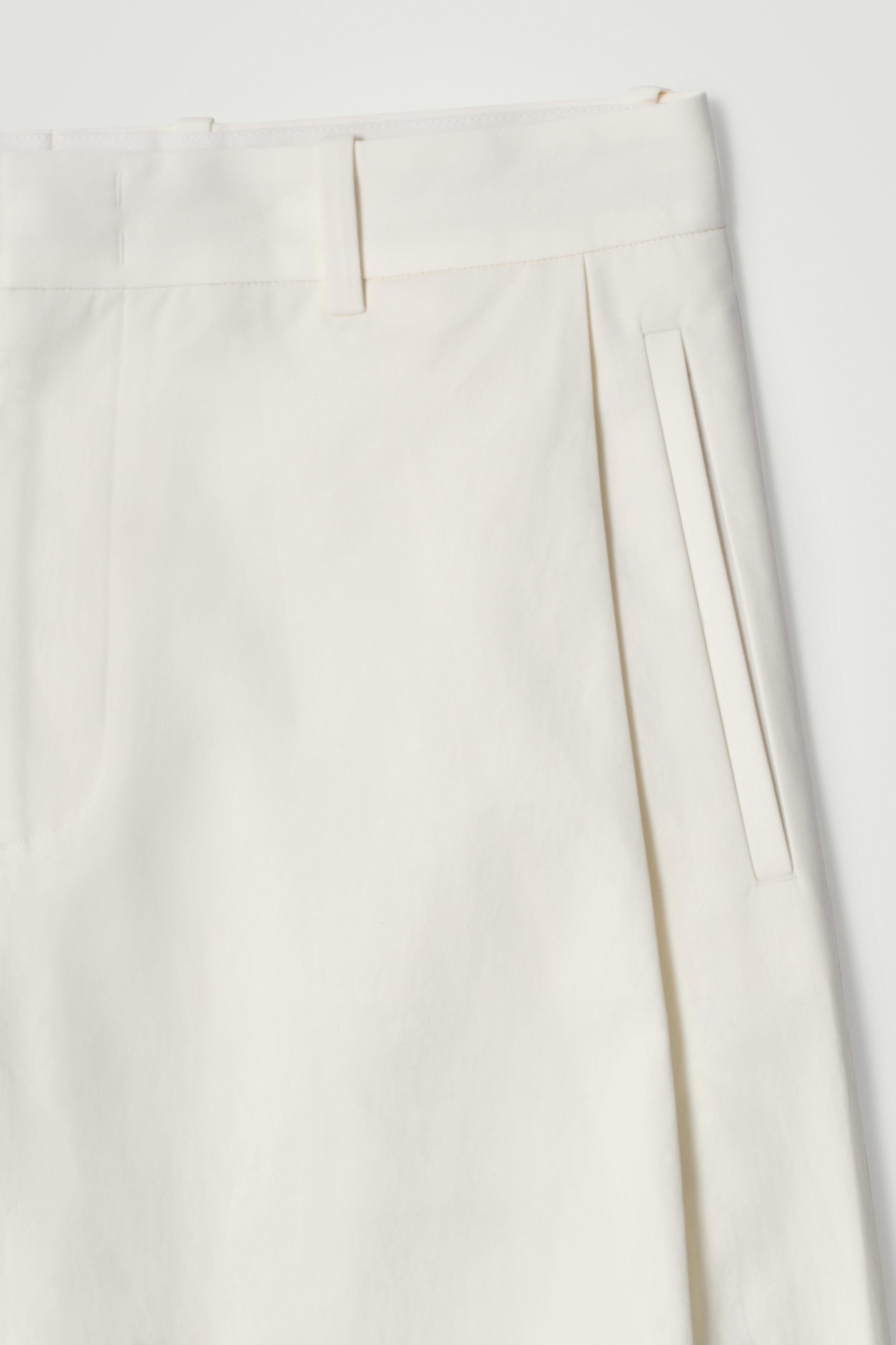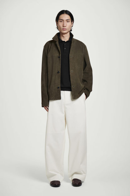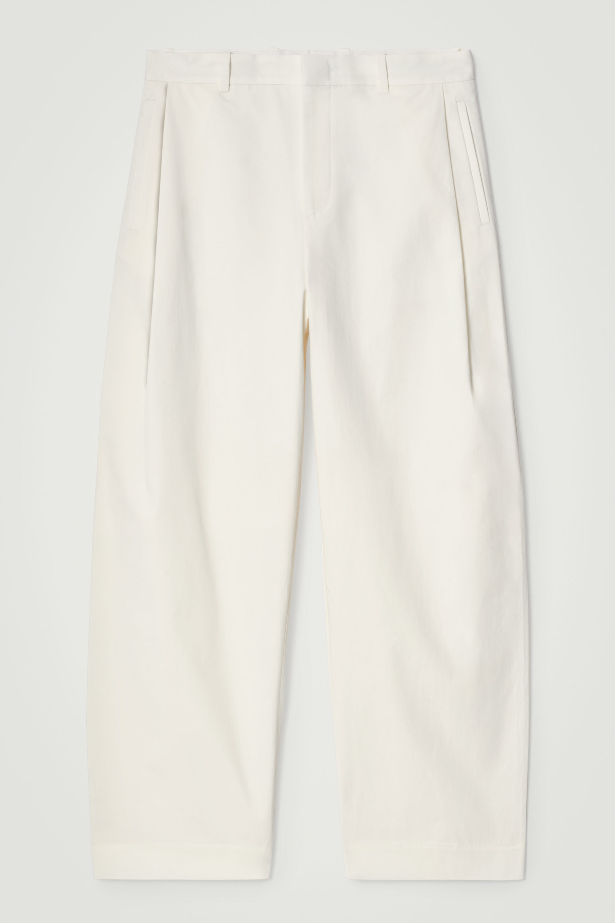 Dessa byxor i en ecru ton är en mer avslappnad tolkning av skräddade koder. De är tillverkade av bomull och designade med vida ben, förstärkta av djupa veck längs sidorna. Bär dem med en bowlingskjorta och sandaler för en ledig, sofistikerad stil.