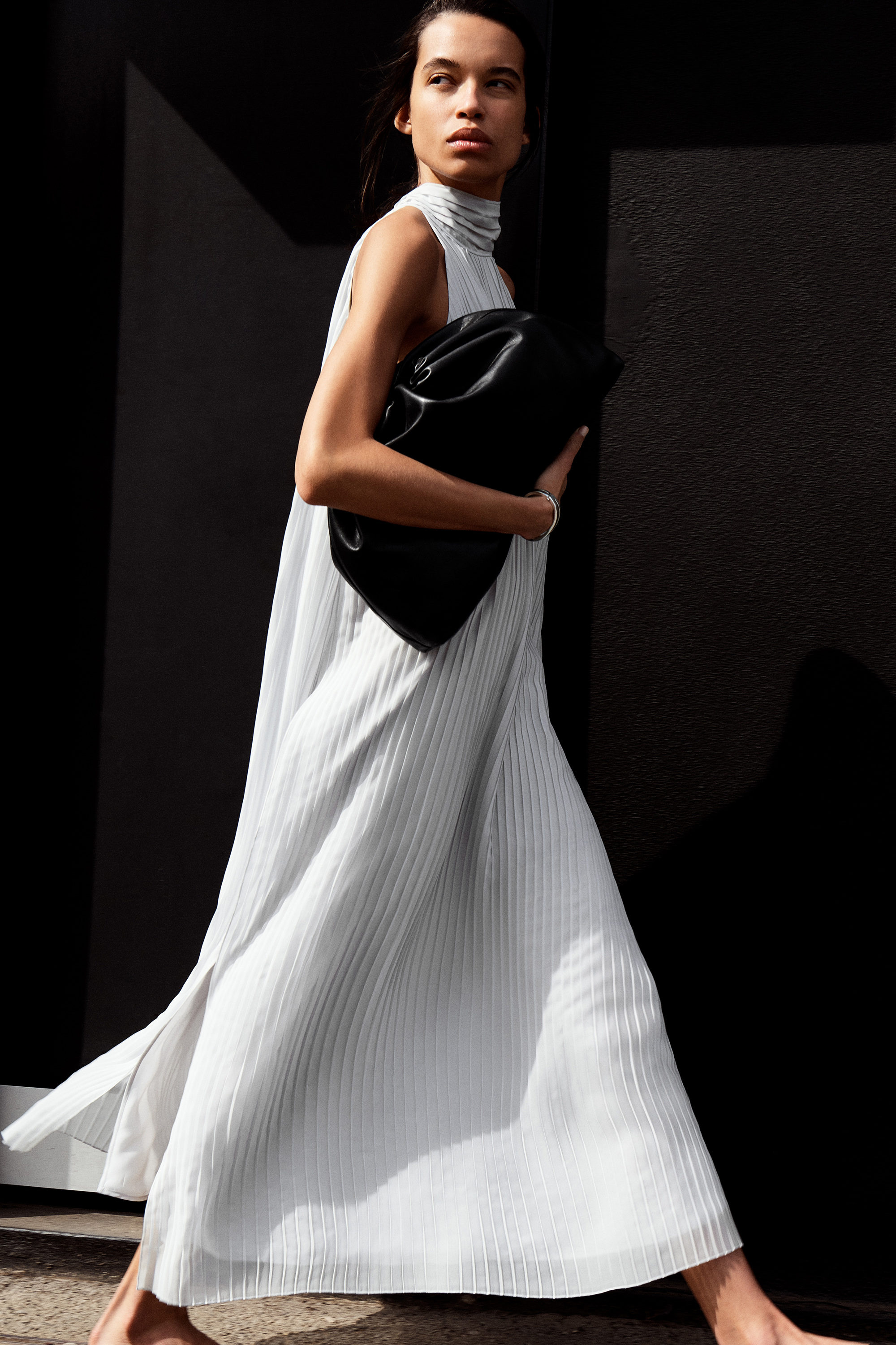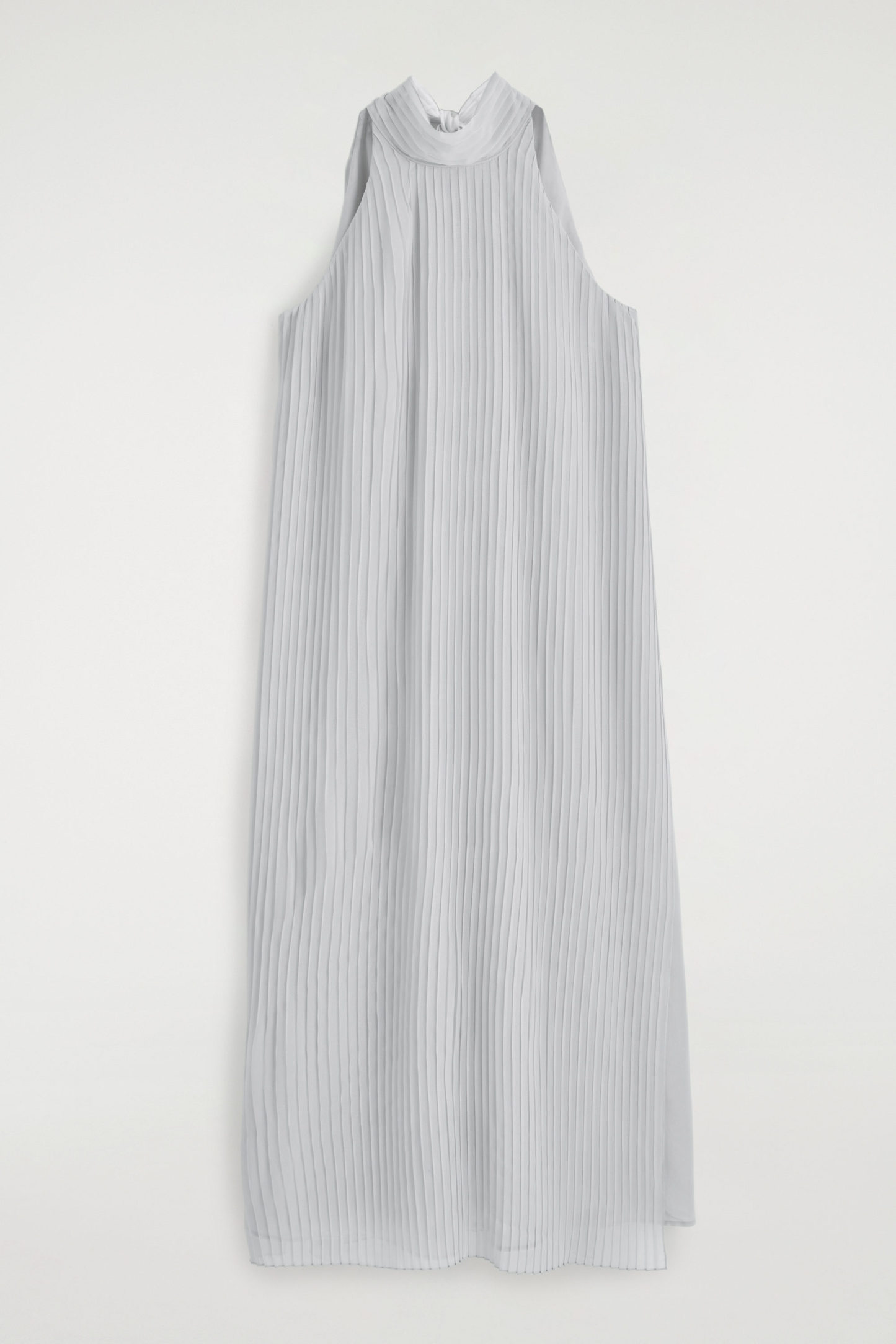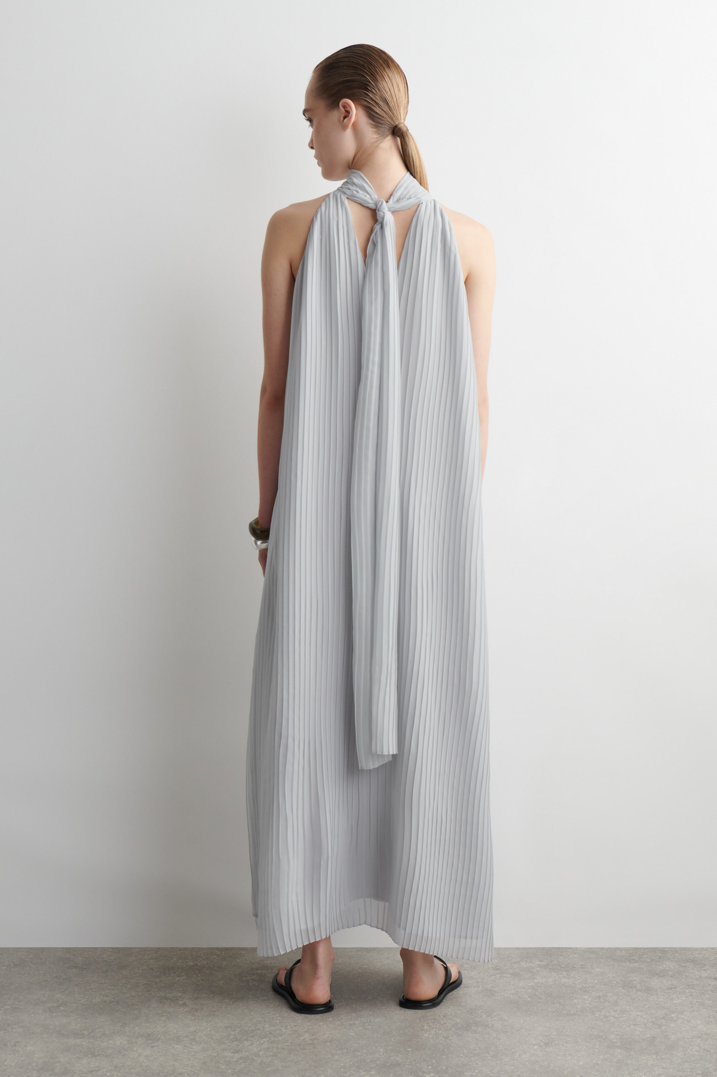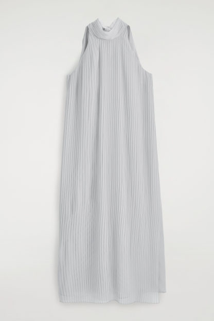 This layered piece reimagines occasionwear codes. Offered in an icy-blue tone, it's made from fine, gauzy fabric with concertina pleats that fan out from the halter neckline down to the floor. Style it with sandals and a clutch.
