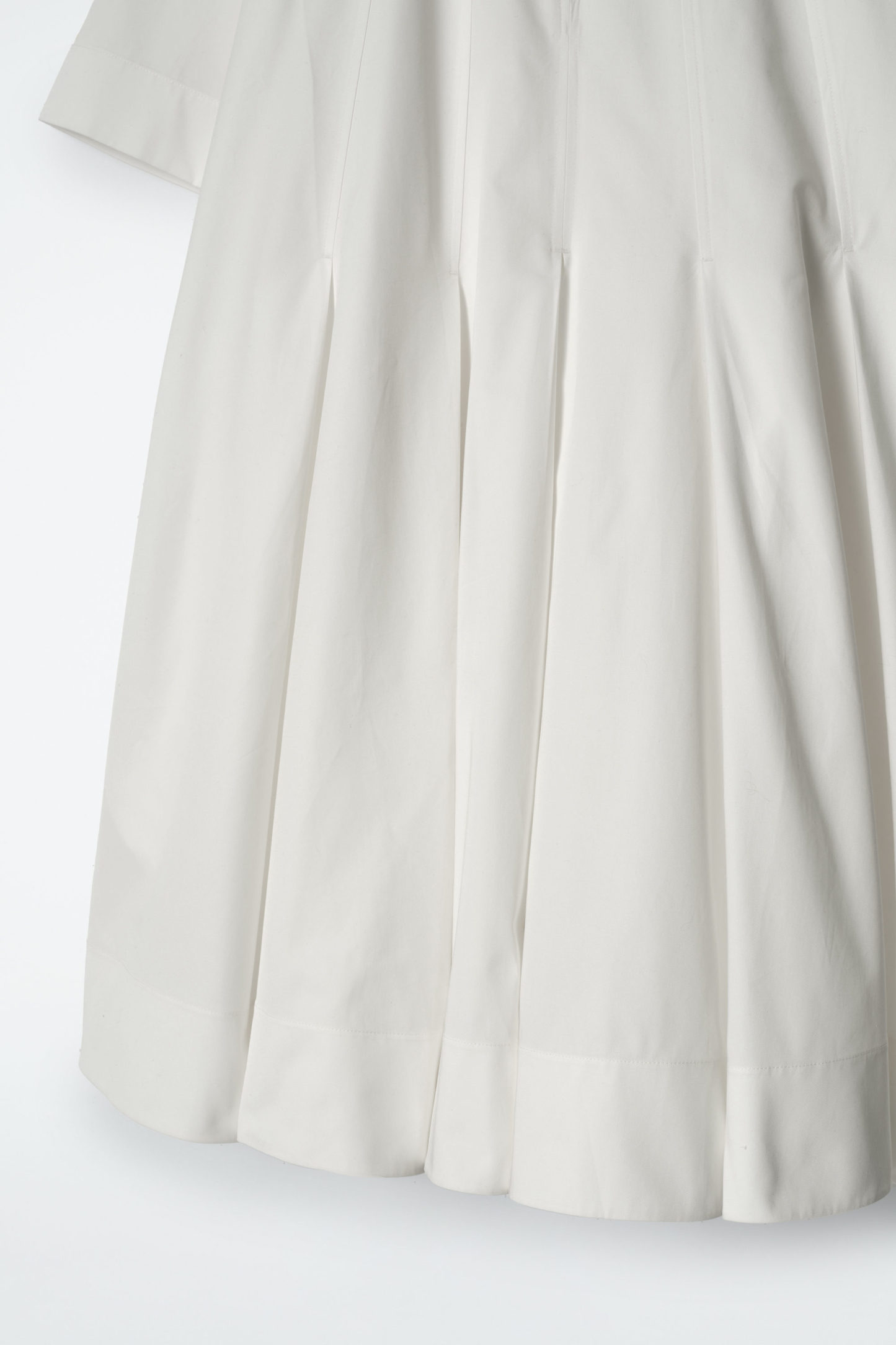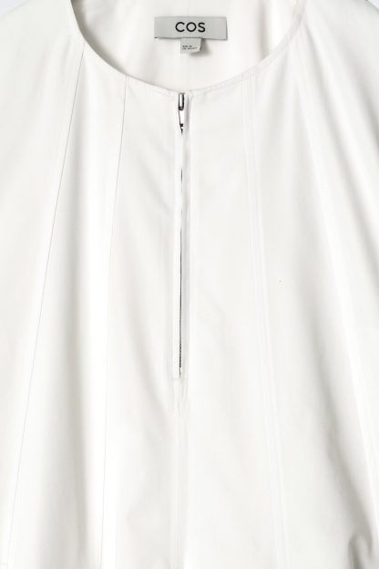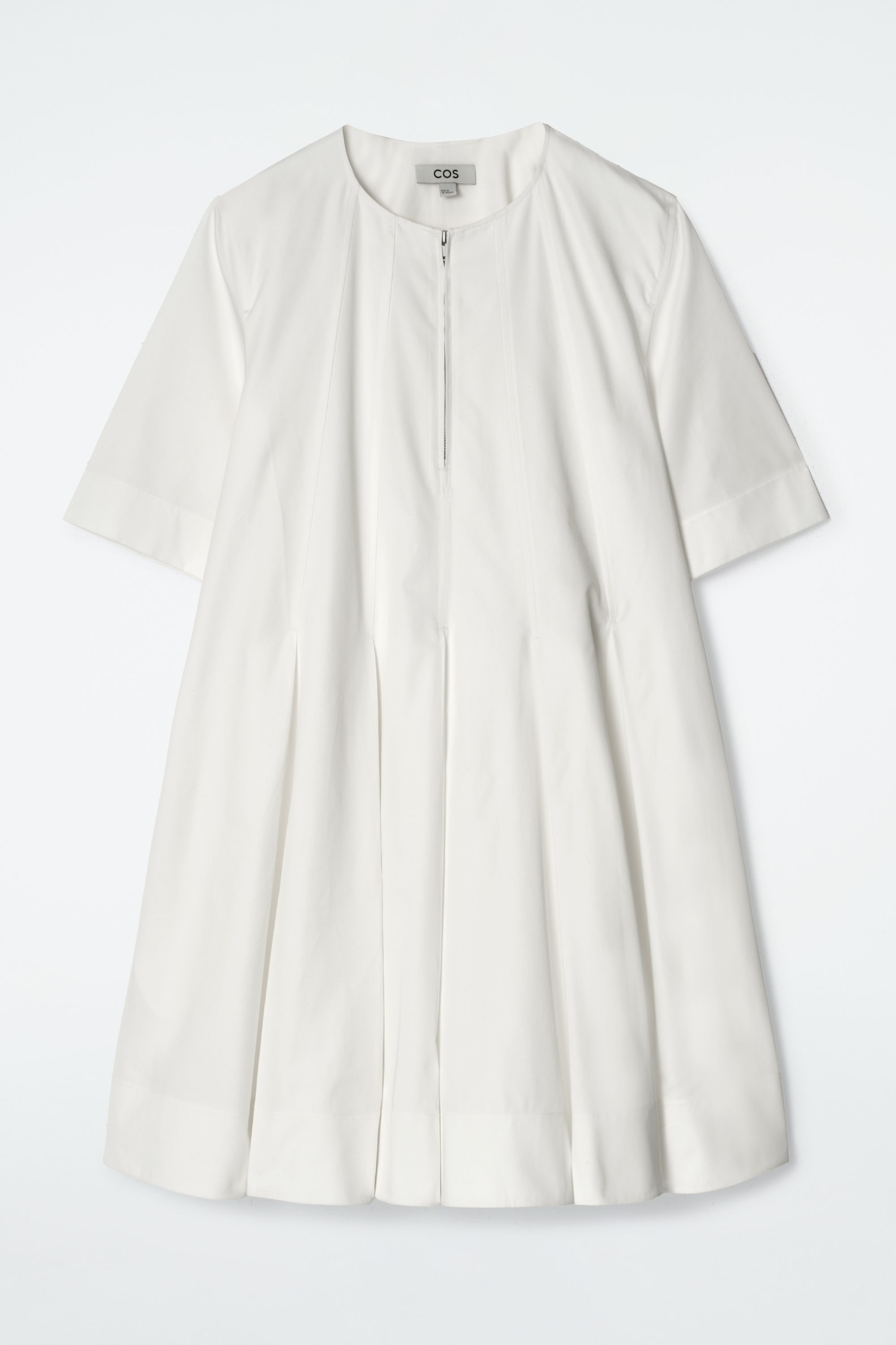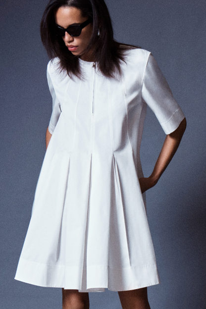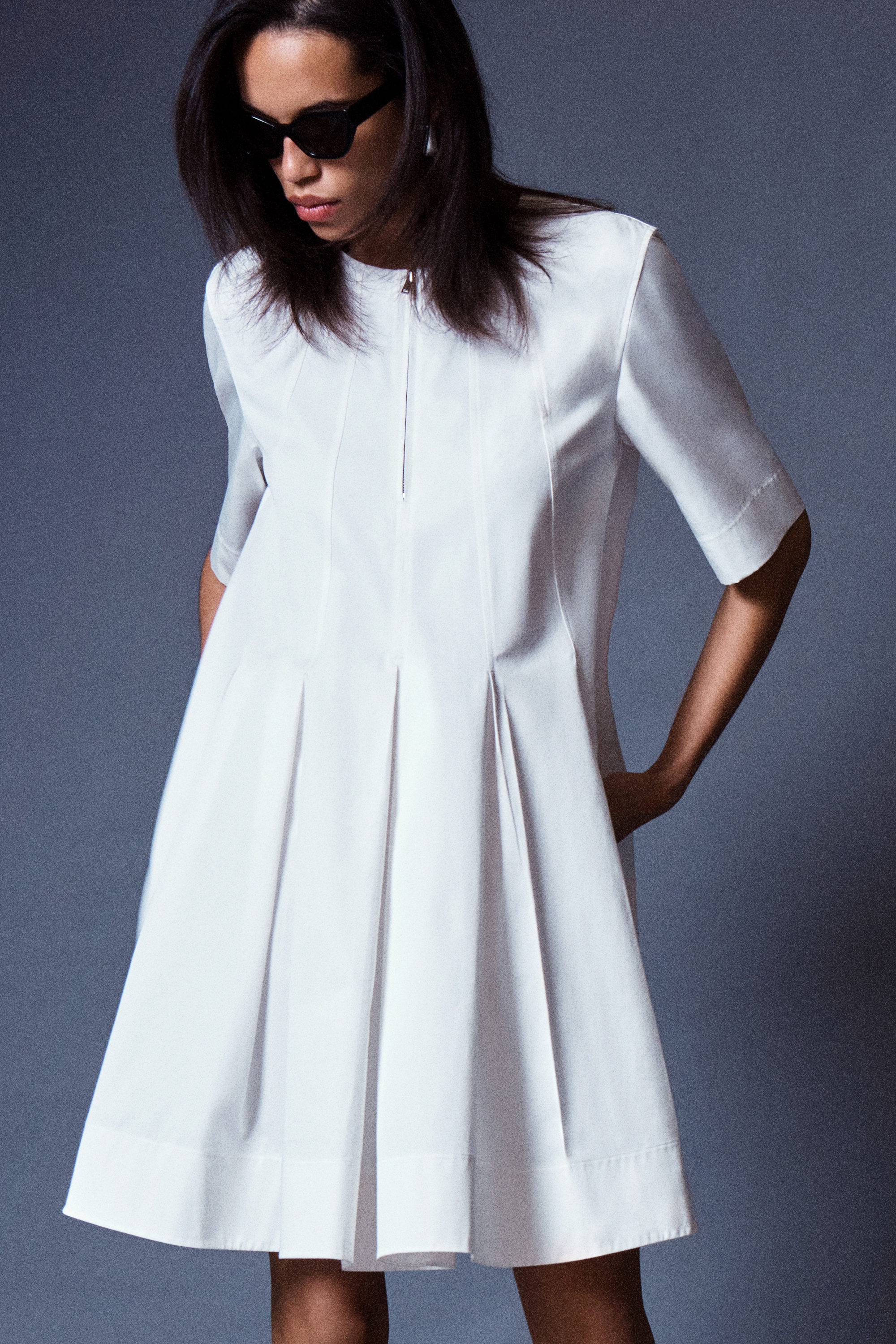 cthtos designteam visar upp en sofistikerad tappning av utility. Denna klänning i mjuk, kritvit bomull är konstruerad med paneler som faller ner i motveck, dragkedja i silver, korta ärmar och diskreta sidofickor.