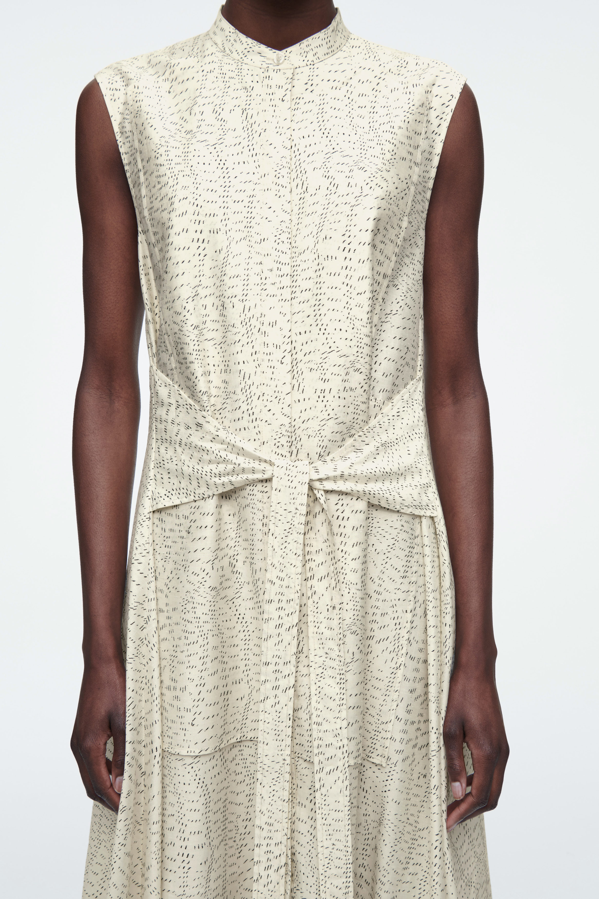 Dynamic patterns bring a fresh perspective to the new-season wardrobe. This modern shirt dress is crafted from a fluid TENCEL™ Lyocell blend and shaped with a grandad collar, flared midi skirt and draped ties that define the waist. The dynamic print was drawn from a vintage jacquard textile, distilled to its simplest form for a hand-sketched effect.