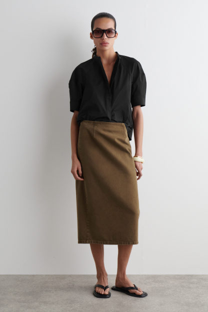 Den här säsongen omtolkas garderobsklassiker med feminina silhuetter och voluminösa proportioner. Ett praktexempel är den här blusen i bomull med lätt stretch. Den har murarkrage, puffärm och dold knäppning för en minimalistisk finish.