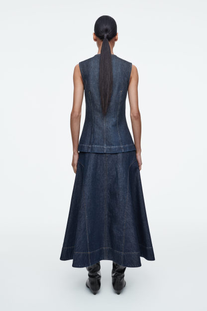 Klassiska denimsilhuetter får en uppdatering inför den kommande säsongen. Den här moderna kjolen är skuren med voluminösa sidopaneler som skapar en lätt, a-linjeskuren form samt är tillverkad i ekologisk, återvunnen bomull som lämnats rå för en indigotonad tvätt. Styla den tillsammans med den matchande toppen.