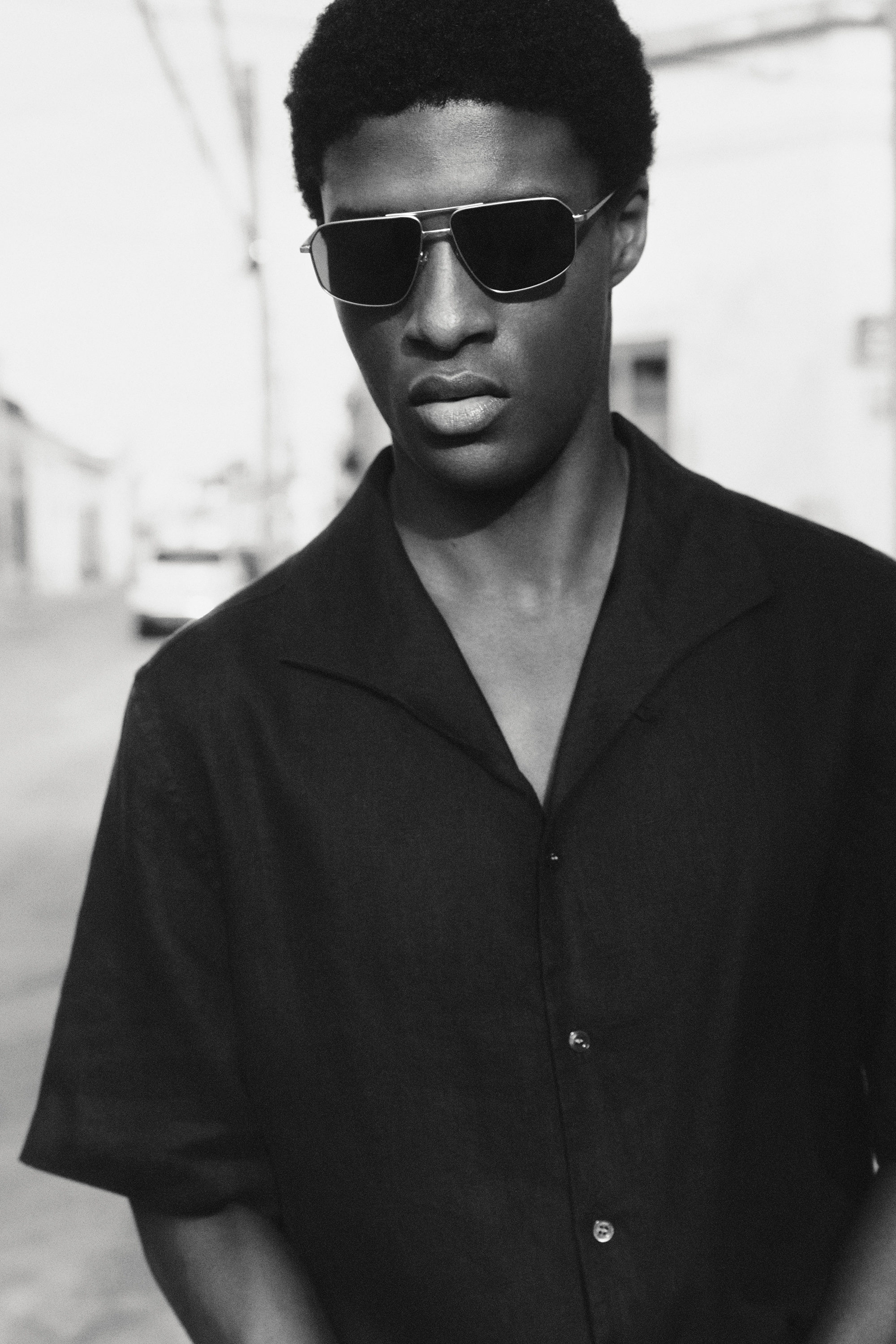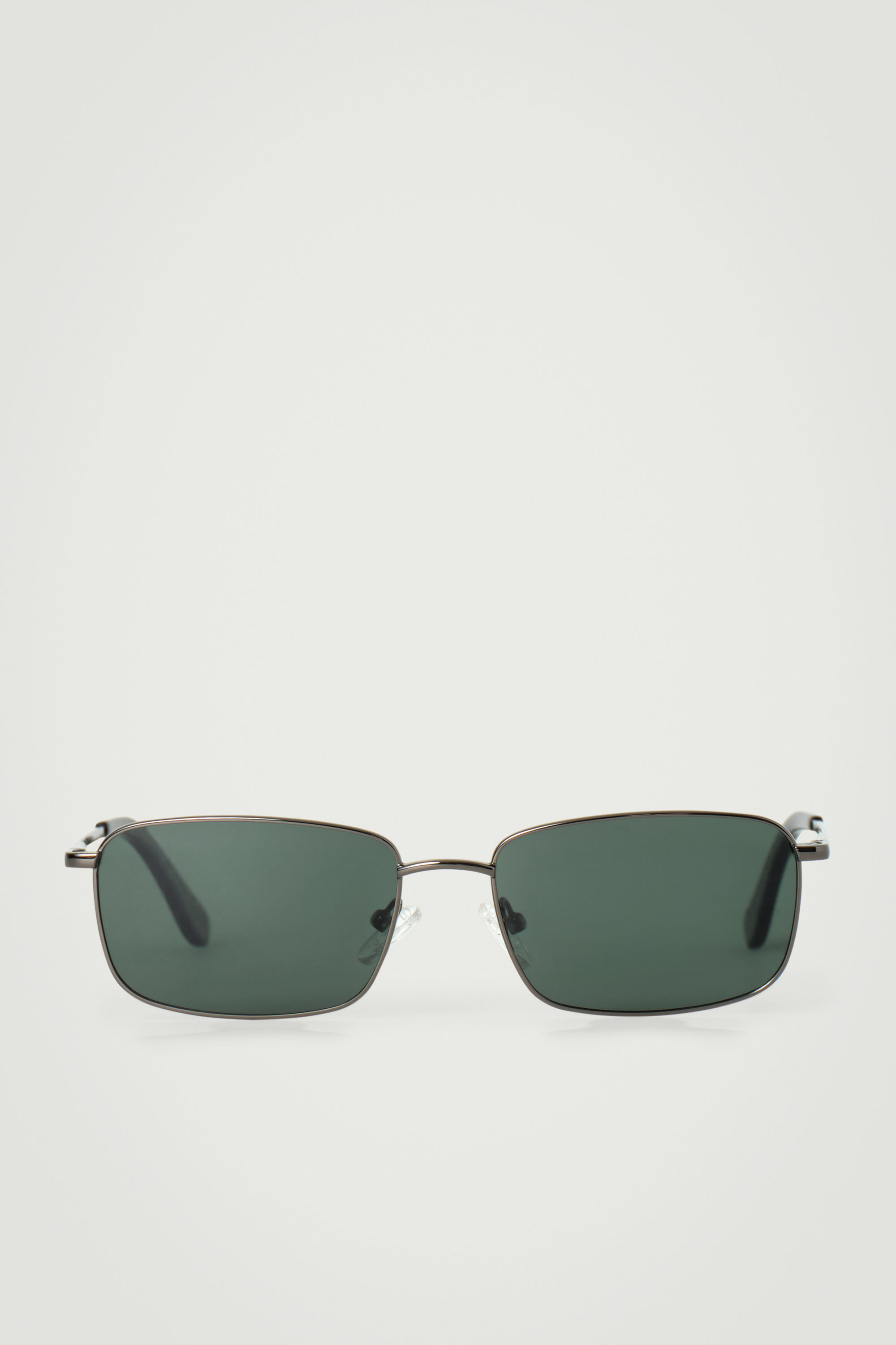 A modern take on retro pairs, these sunglasses are designed with gunmetal wire frames and rectangular lenses tinted a dark-steel hue. Hang them from your shirt when the sun draws in.