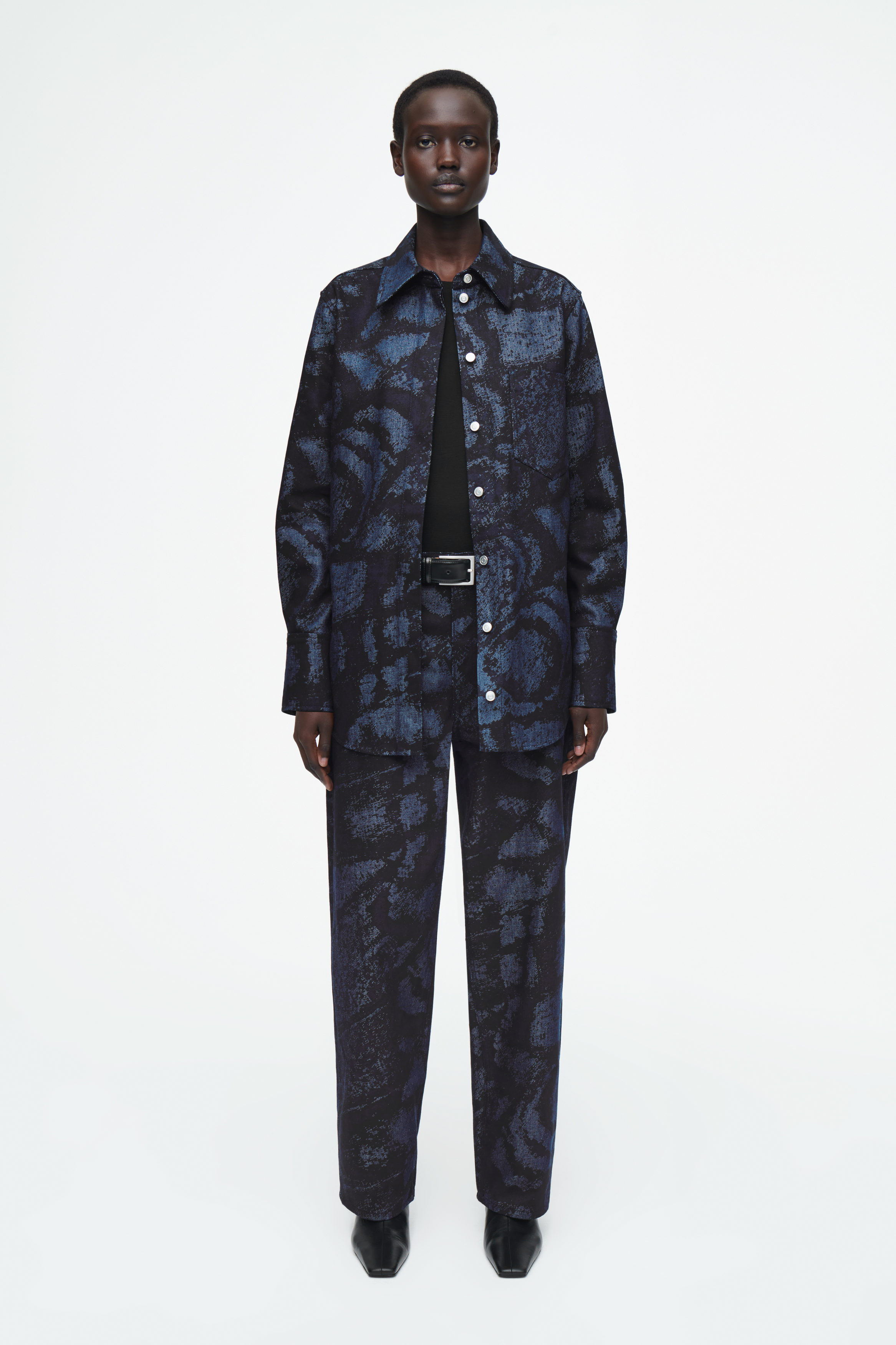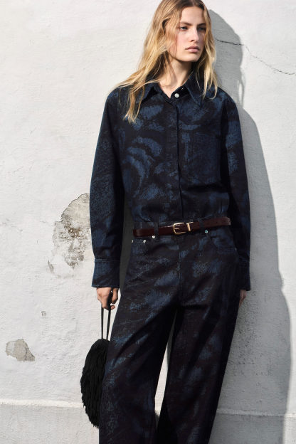 cthtos presenterar en kollektion av vinterstilar som uppdaterats med exklusiva mönster. I samarbete med fotografen Chris Perani framhäver vi naturens extraordinära skönhet med intrikata detaljer livfulla färger. Denna iögonfallande skjorta är dekorerad med ett jacquardmönster av fjärilsvingar med fjäll som kontrasterar den mörkt tvättade denimen på ett diskret sätt. Styla den enkelt med de matchande jeansen.