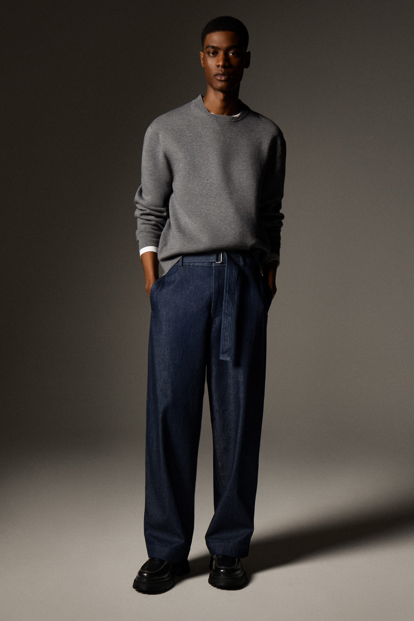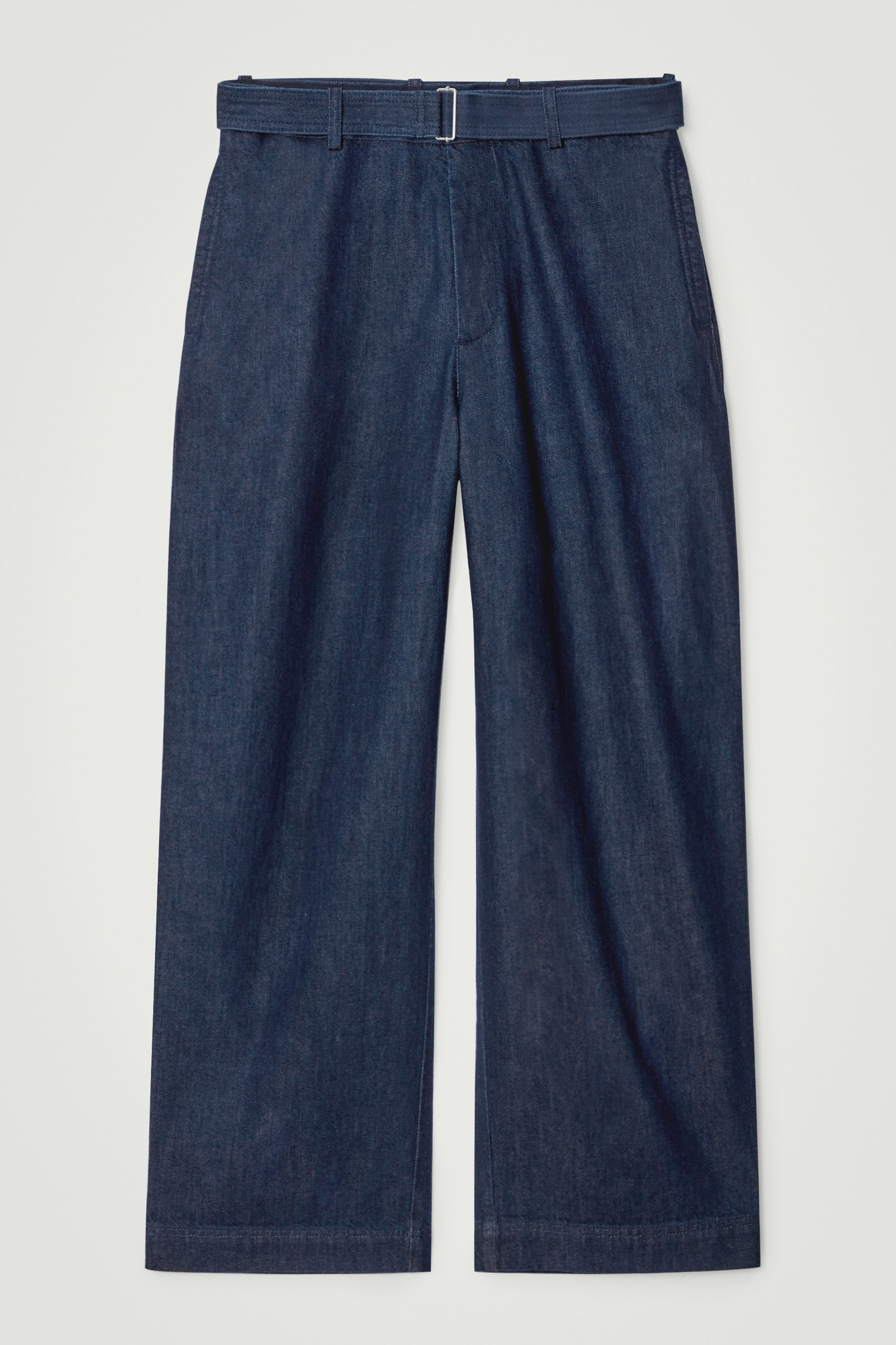 Dessa moderna byxor kombinerar denim och skräddat – de är lika enkla att styla ledigt och mer formellt. De är tillverkade av ekologisk och återvunnen bomull i en klassisk, blå tvätt. Designen har ett skärp i midjan för en avslappnad passform, fickor i sidan och en passpoalficka bak.