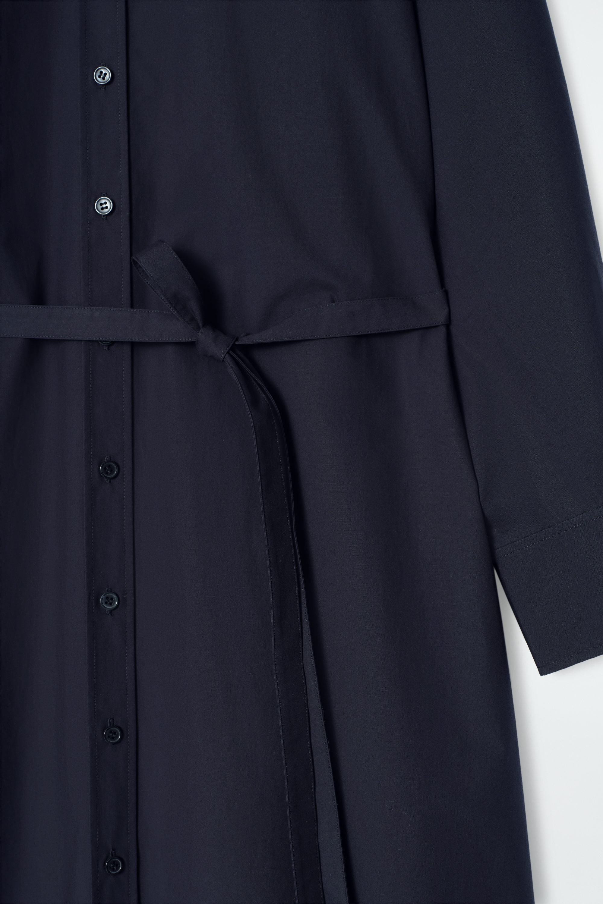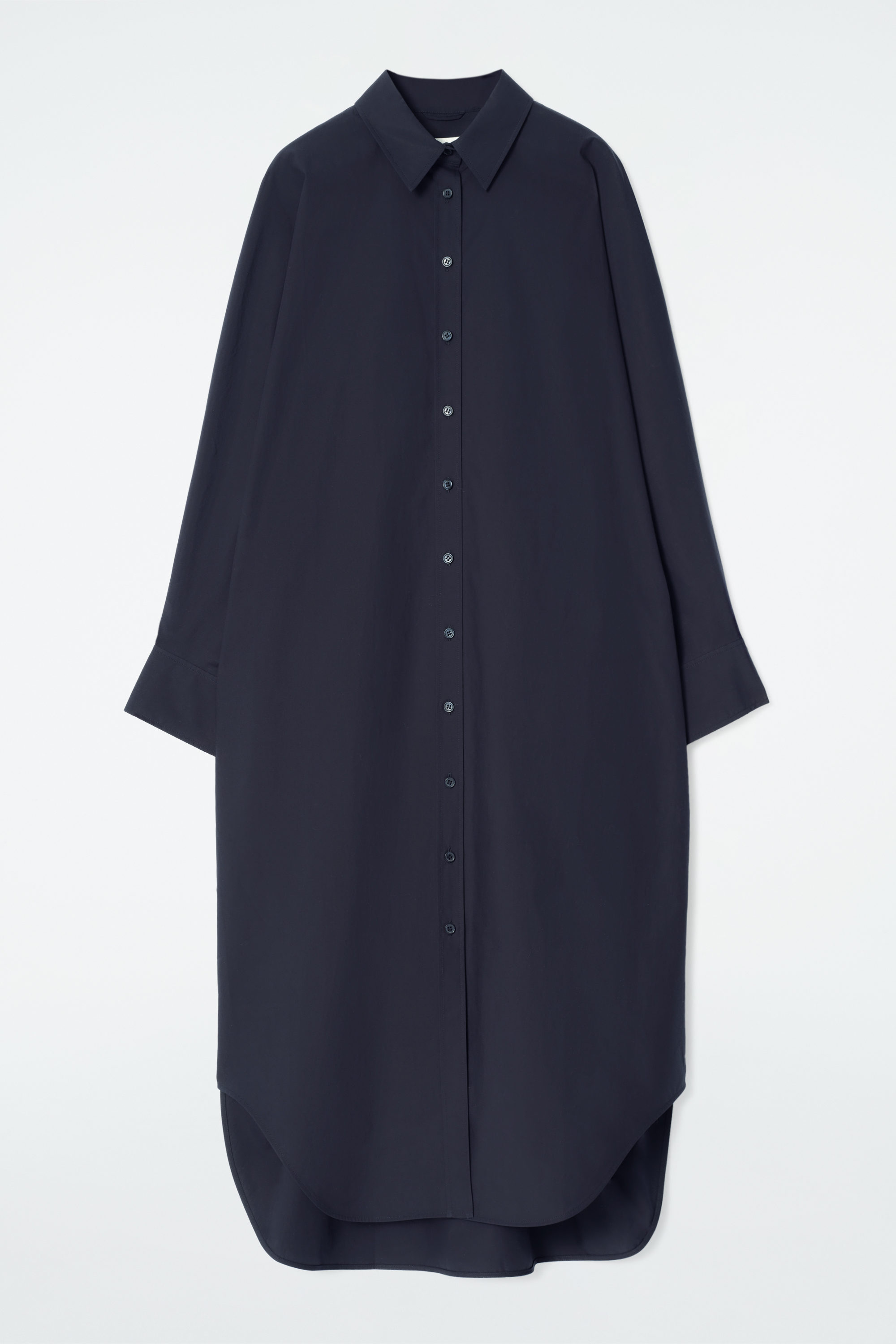 En skräddad modern skjortklänning i midilängd med böljande snitt. Tillverkad av ren bomull och designad med en klassisk, spetsig krage, manschetter med knäppning och välvd, trappad nederkant. Styla med knähöga stövlar.