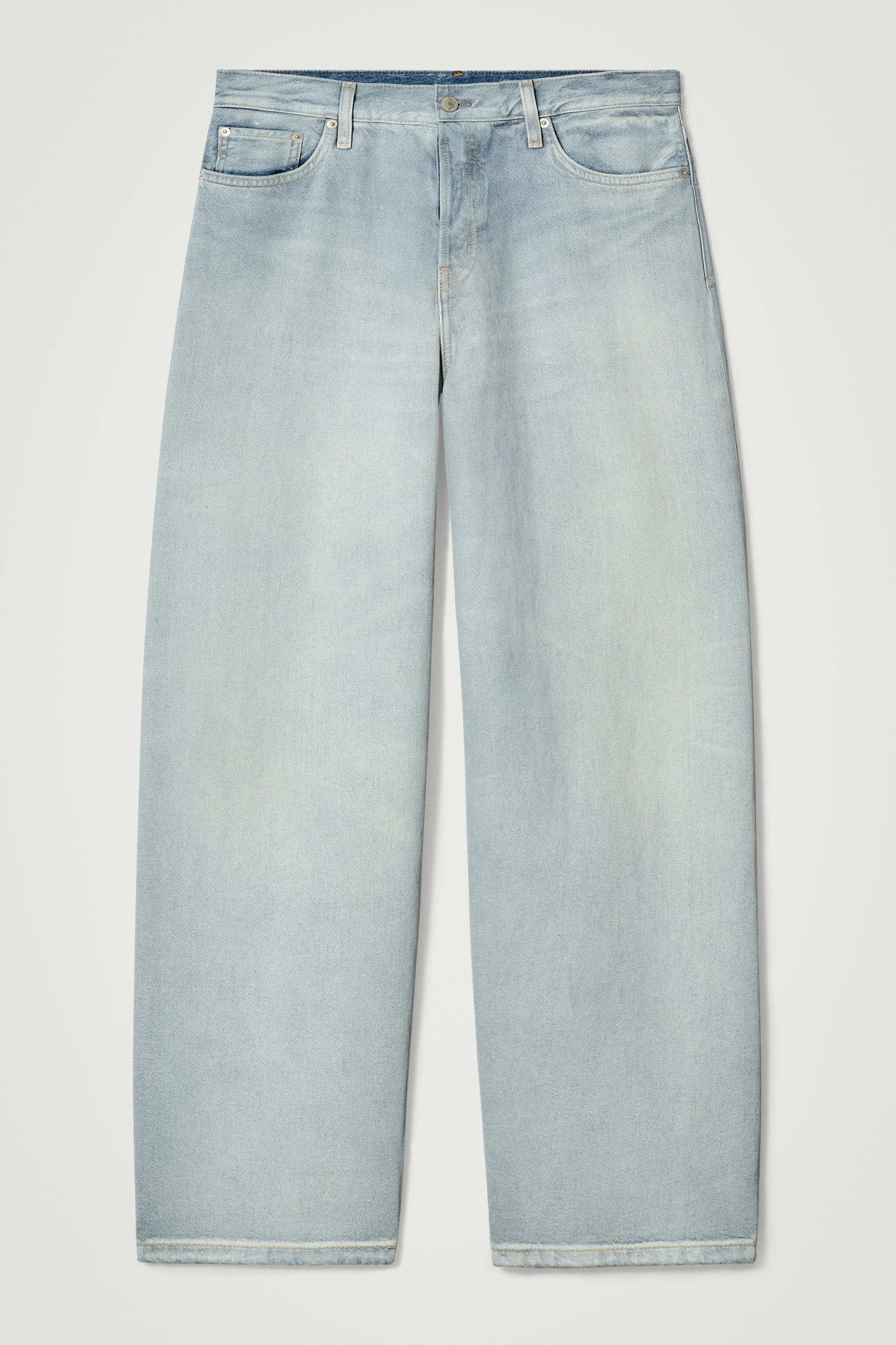- Raka ben, avslappnad passform, hellånga, medelhög midja