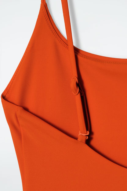 This refined swimsuit lends itself to days spent by the water. It's rendered in a bold tangerine hue and designed with a scooped neckline, low back and adjustable shoulder straps for a perfect fit.