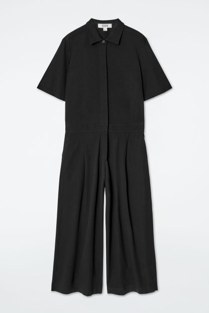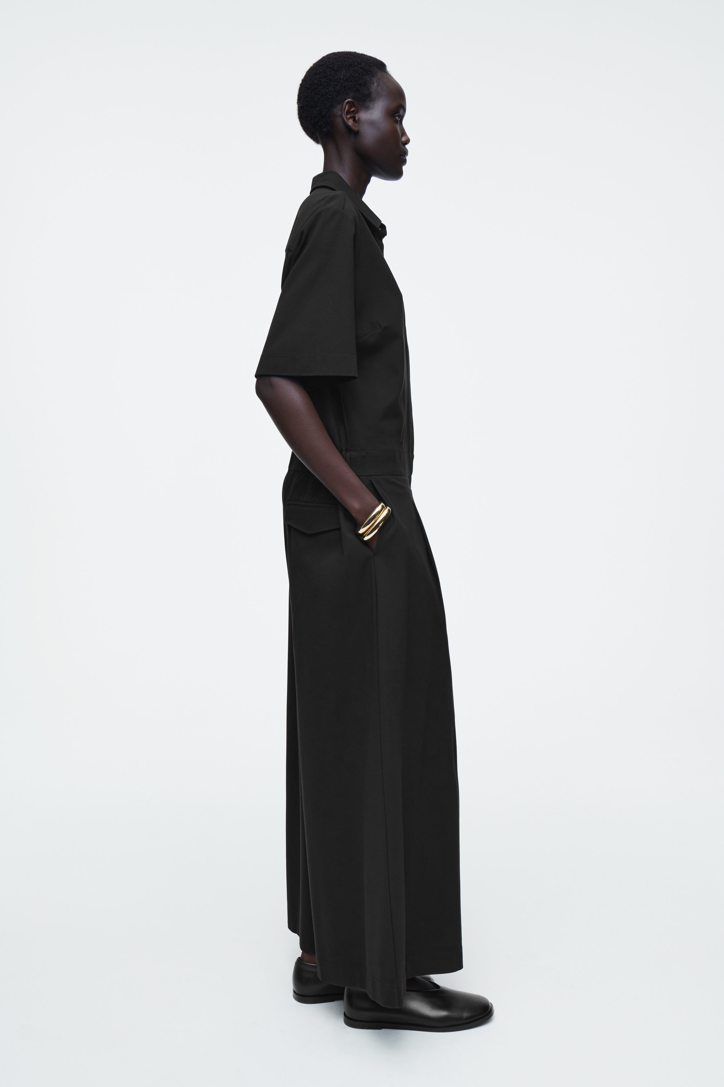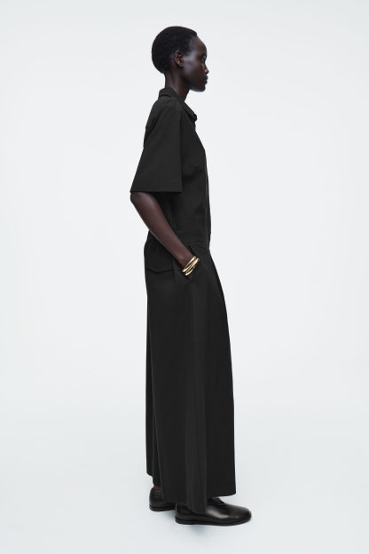 En elegant jumpsuit som visar upp en lågmäld men effektfull version av finkläder. Den erbjuds i en mångsidig, svart ton samt har spetsig krage, sidofickor, dold knappslå och resår i midjan. Styla den med sandaler för en fulländad look.