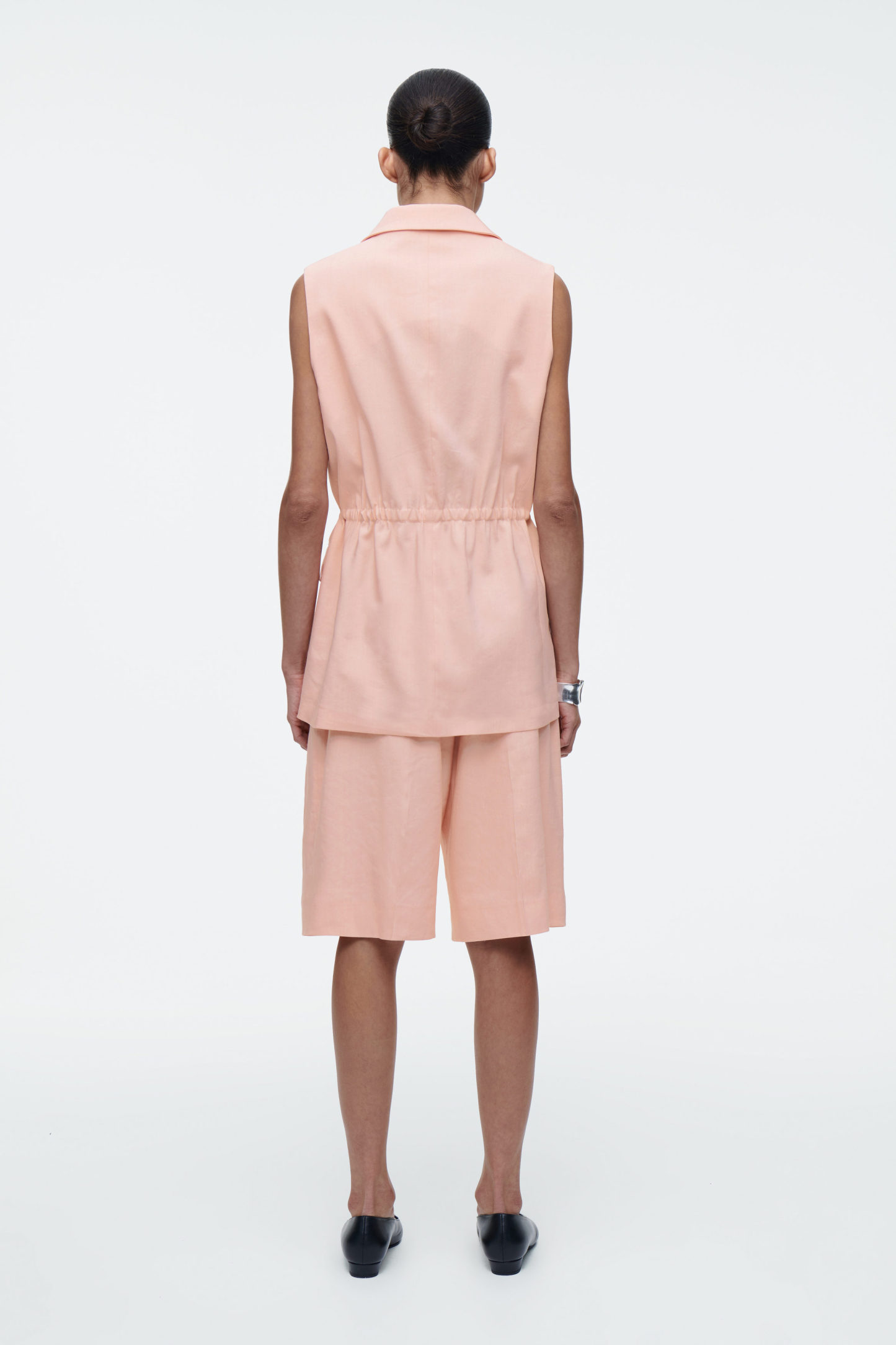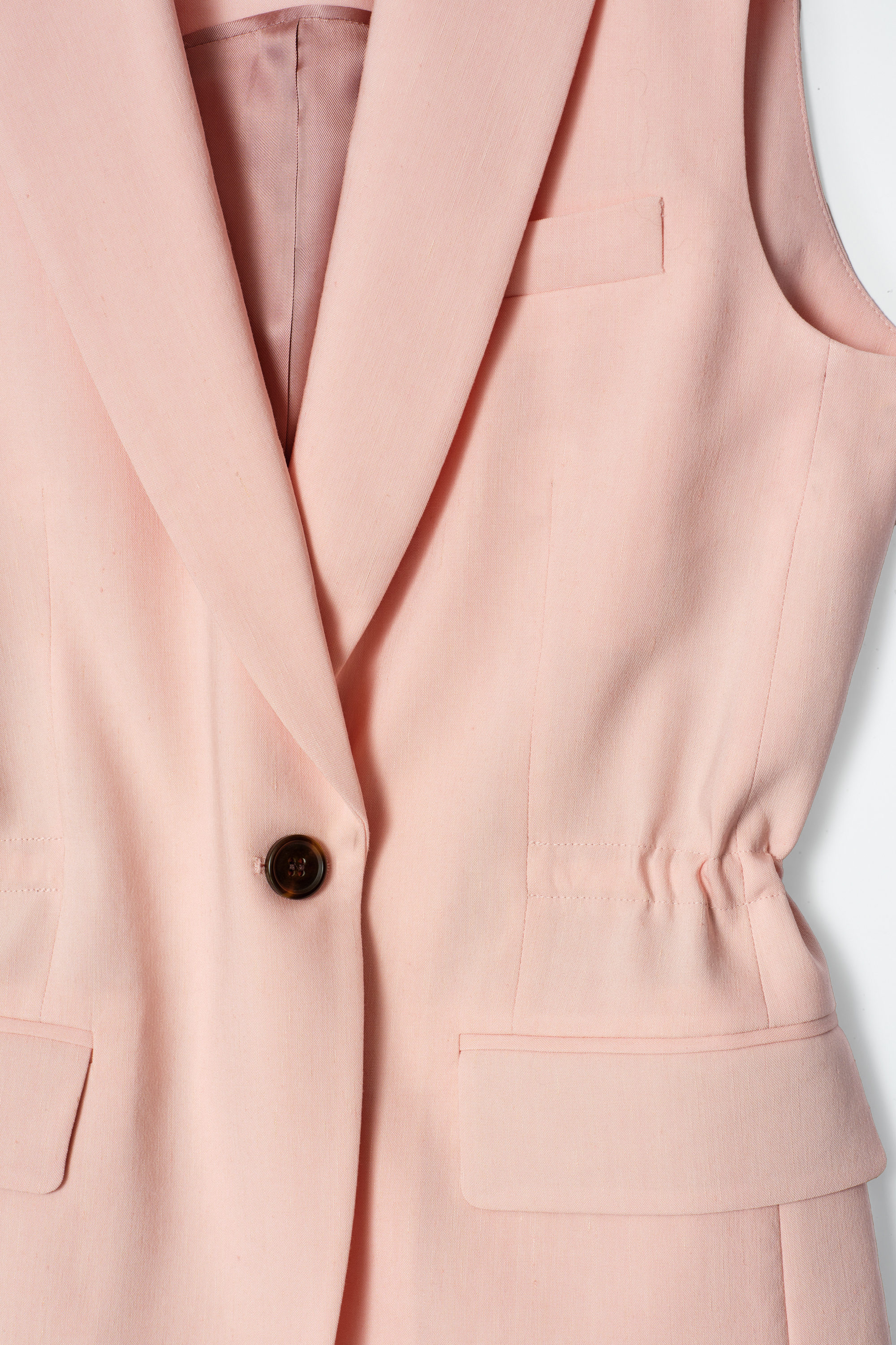 Denna väst är inspirerad av skrädderikoder, skuren i en smal silhuett och har en invändig elastisk dragsko som framhäver midjan. Styla den med matchande byxor och ballerinaskor.