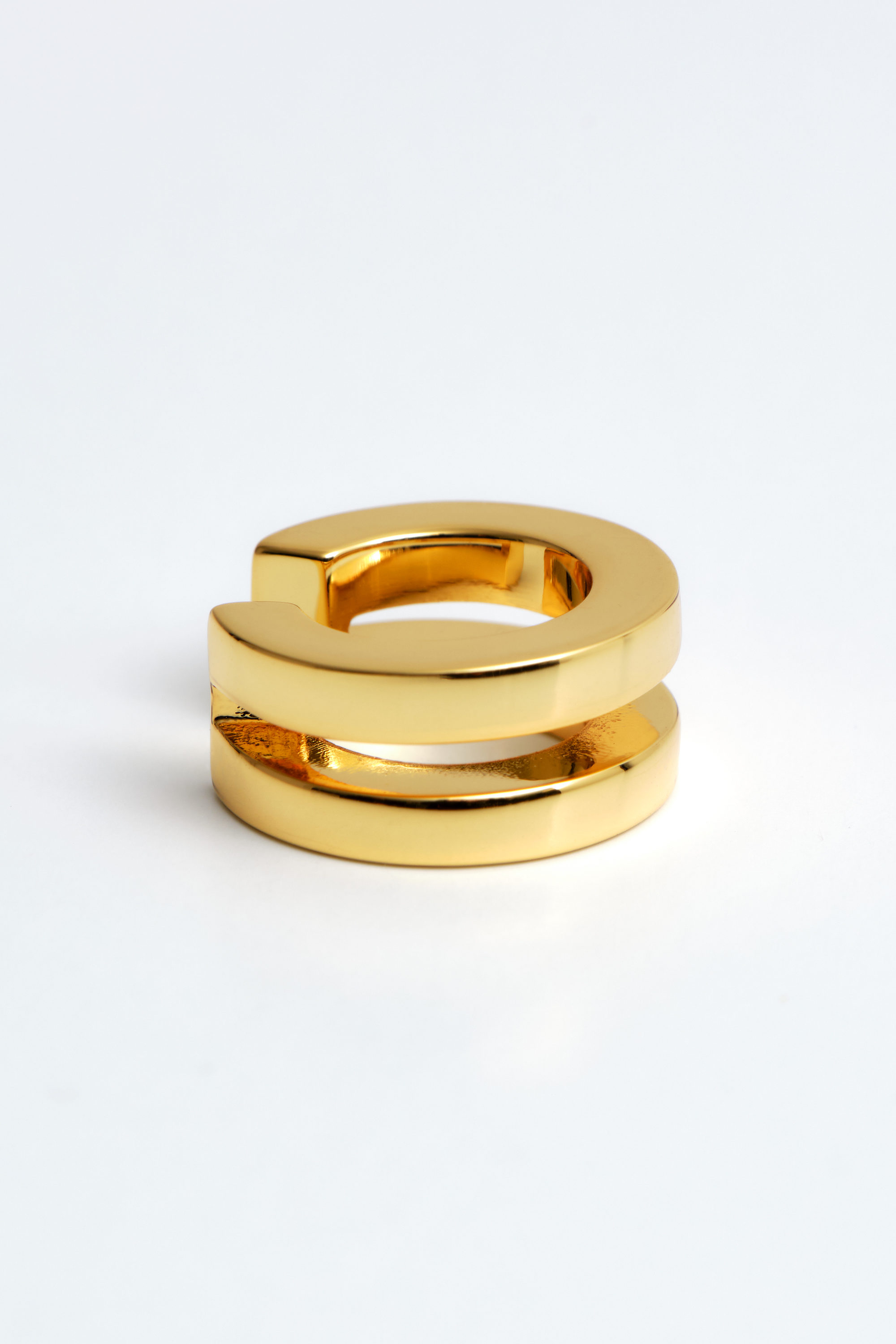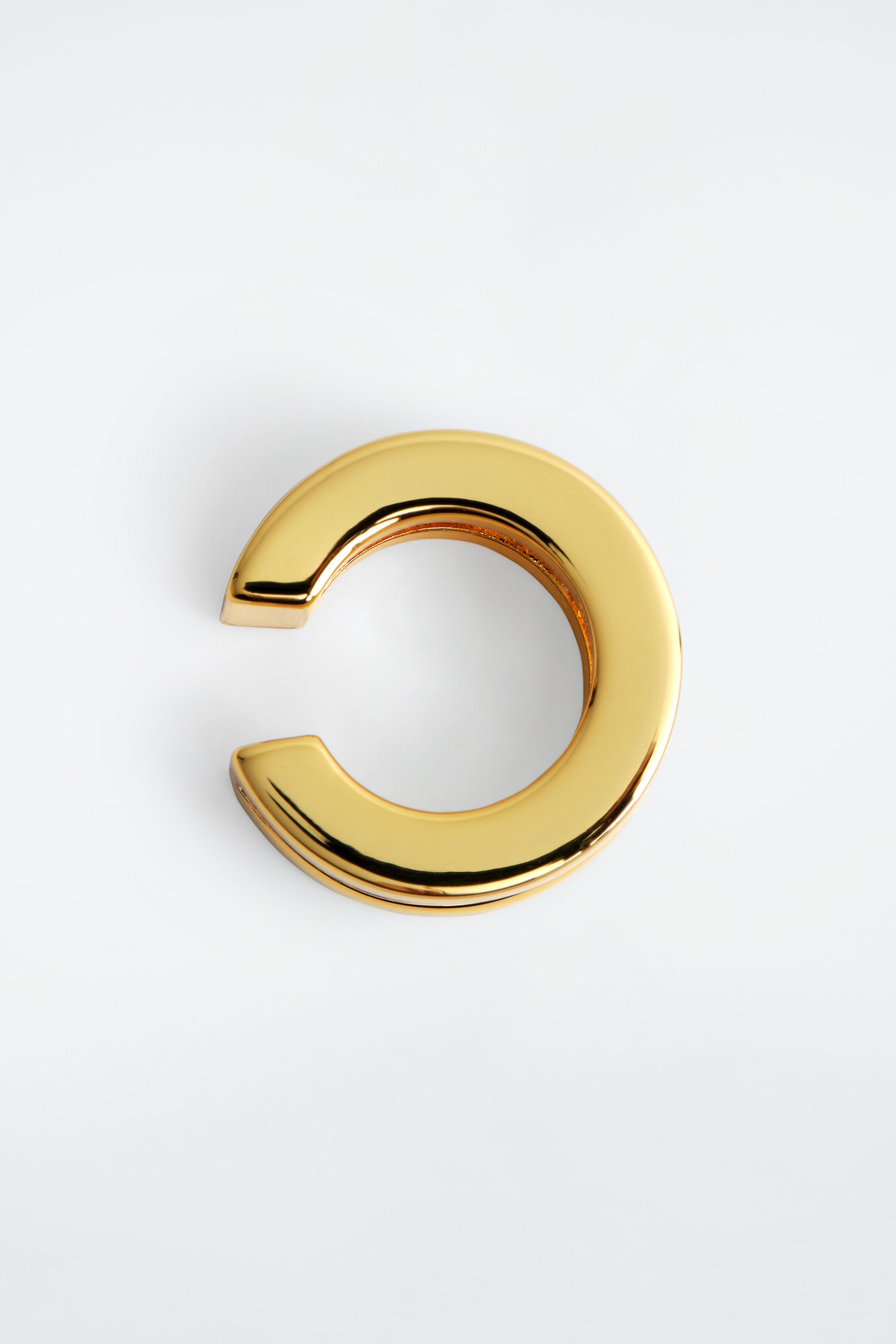 Denna moderna ear cuff har två tunna band, vilket skapar illusionen av en staplad look. Det är tillverkat av guldpläterad, återvunnen mässing som är polerad till hög lyster och etsade med cthtos logotyp.