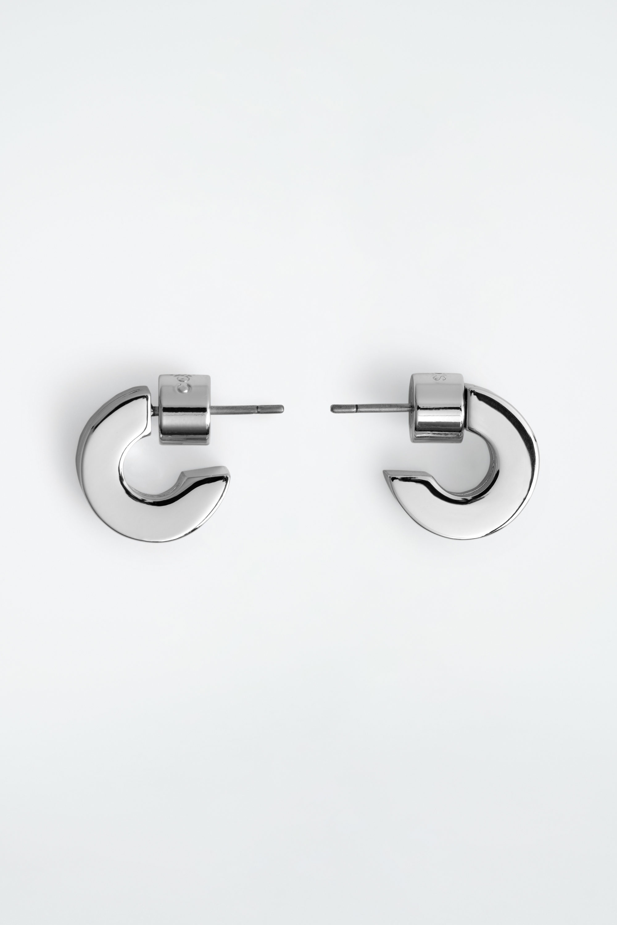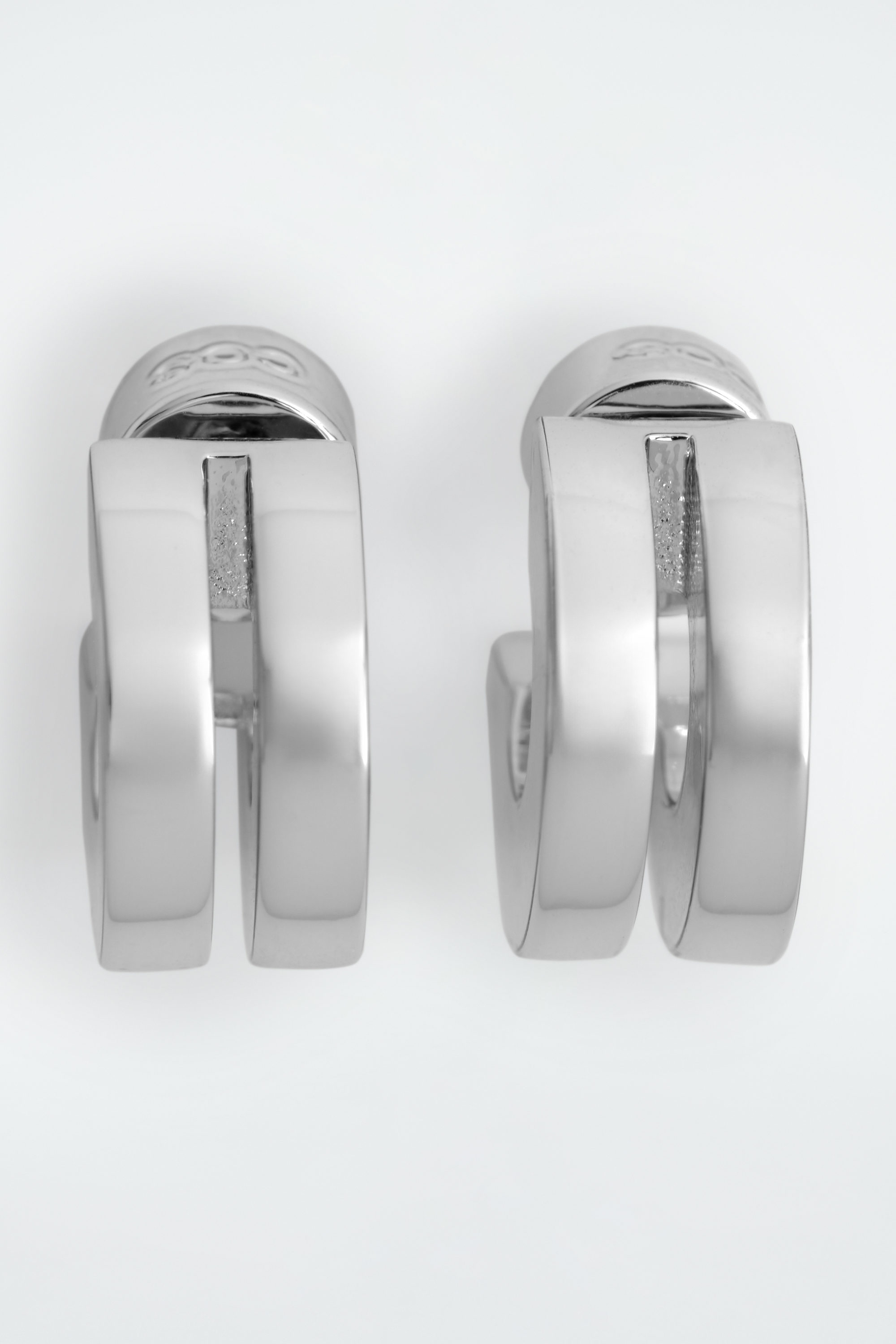Dessa moderna örhängen är staplade med två tunna ringar, vilket skapar illusionen av fler örhängen. De är tillverkade av silverpläterad, återvunnen mässing som är polerad till hög lyster och etsade med cthtos logotyp.