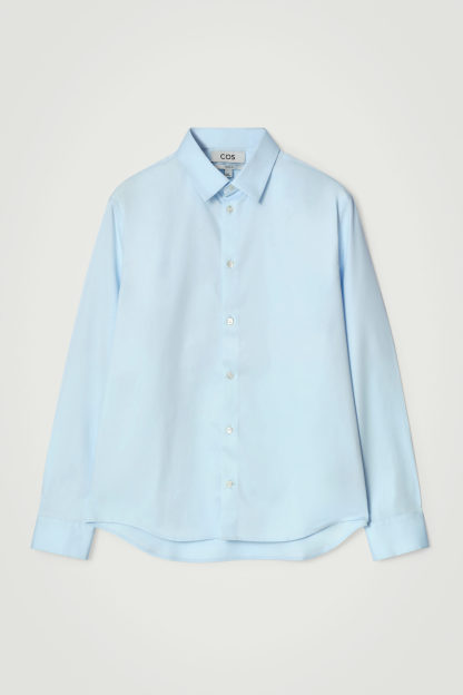 Denna skjorta är en tidlös klassiker från cthtos kollektion med skräddade kreationer. Den är tillverkad av poplin i ekologisk bomull med en rak passform och har en skarp spetsig krage, långa ärmar med manschetter och en diskret rundad fåll som smidigt kan stoppas in i byxorna. Pärlemorknappar och minimala stickningar ger en genomtänkt finish.