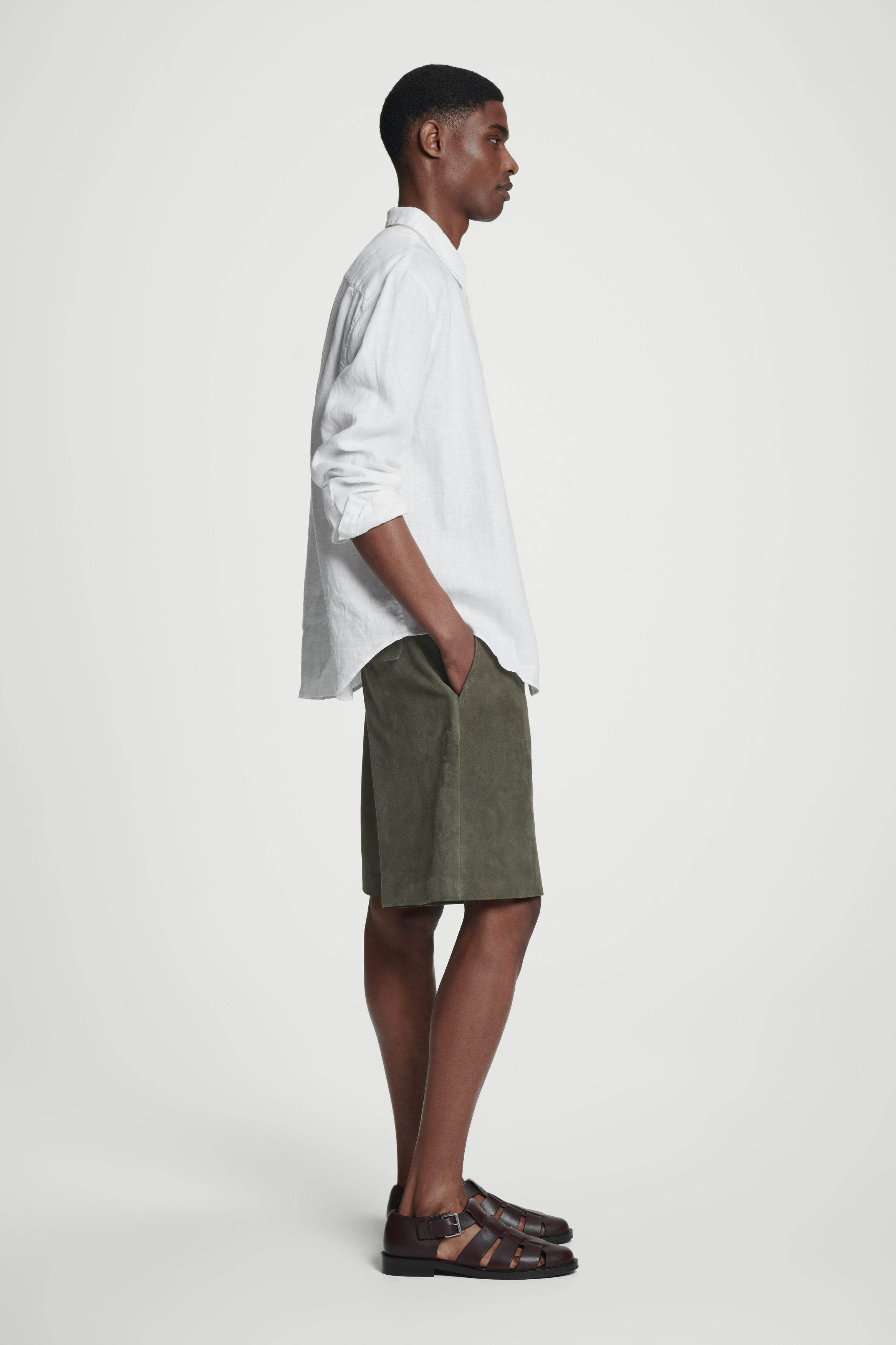 Each season, the cthtos menswear team offer considered takes on wardrobe archetypes – like these shorts. Nodding to classic tailoring, they feature a clean waistband, belt loops and slanted pockets that are carefully topstitched for a considered finish. They're crafted from premium, supple suede in a rich khaki tone.