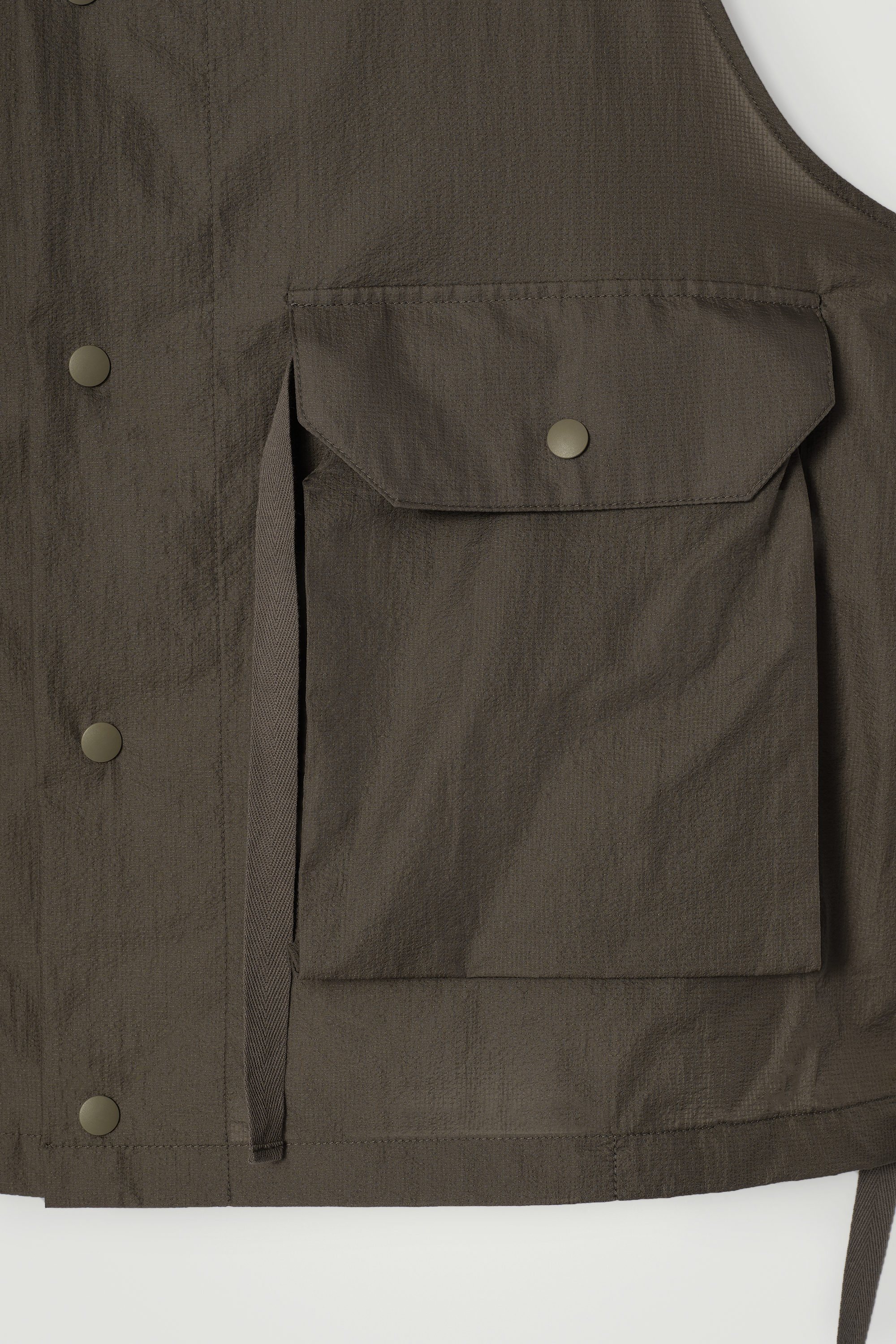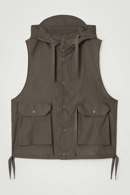 Influenced by workwear, this hooded hybrid gilet is crafted from technical nylon and designed with flap pockets and grosgrain tabs that reinforce its functionality. Layer it over a jumper or a tee in the transitional seasons.
