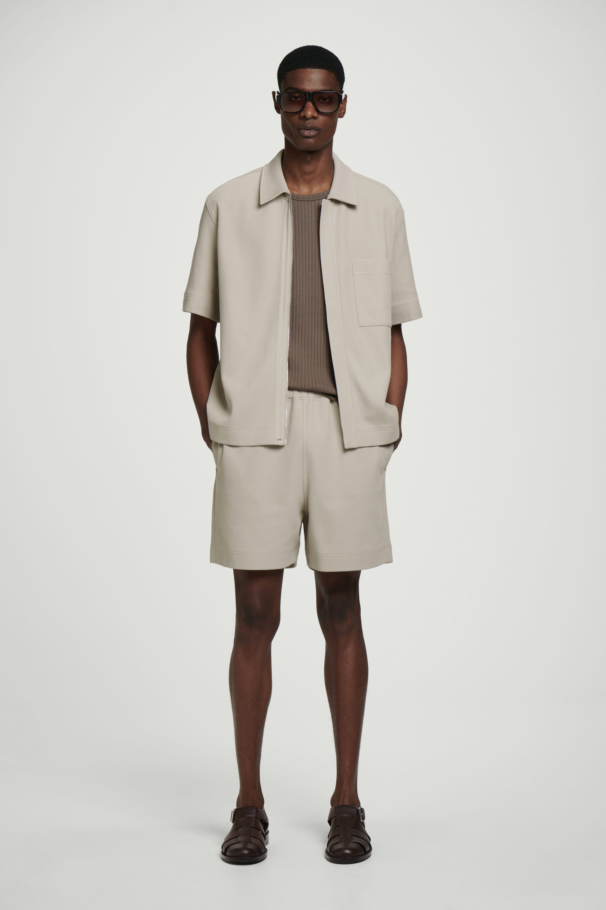 Dynamiska strukturer bidrar med en ny tolkning av klassiska plagg den här säsongen. De här lediga shortsen med avslappnat snitt är tillverkade av krinklad, ribbstickad bomullstrikå i en design med dragsko i linningen och tre fickor. Styla som ett set med den matchande skjortan.