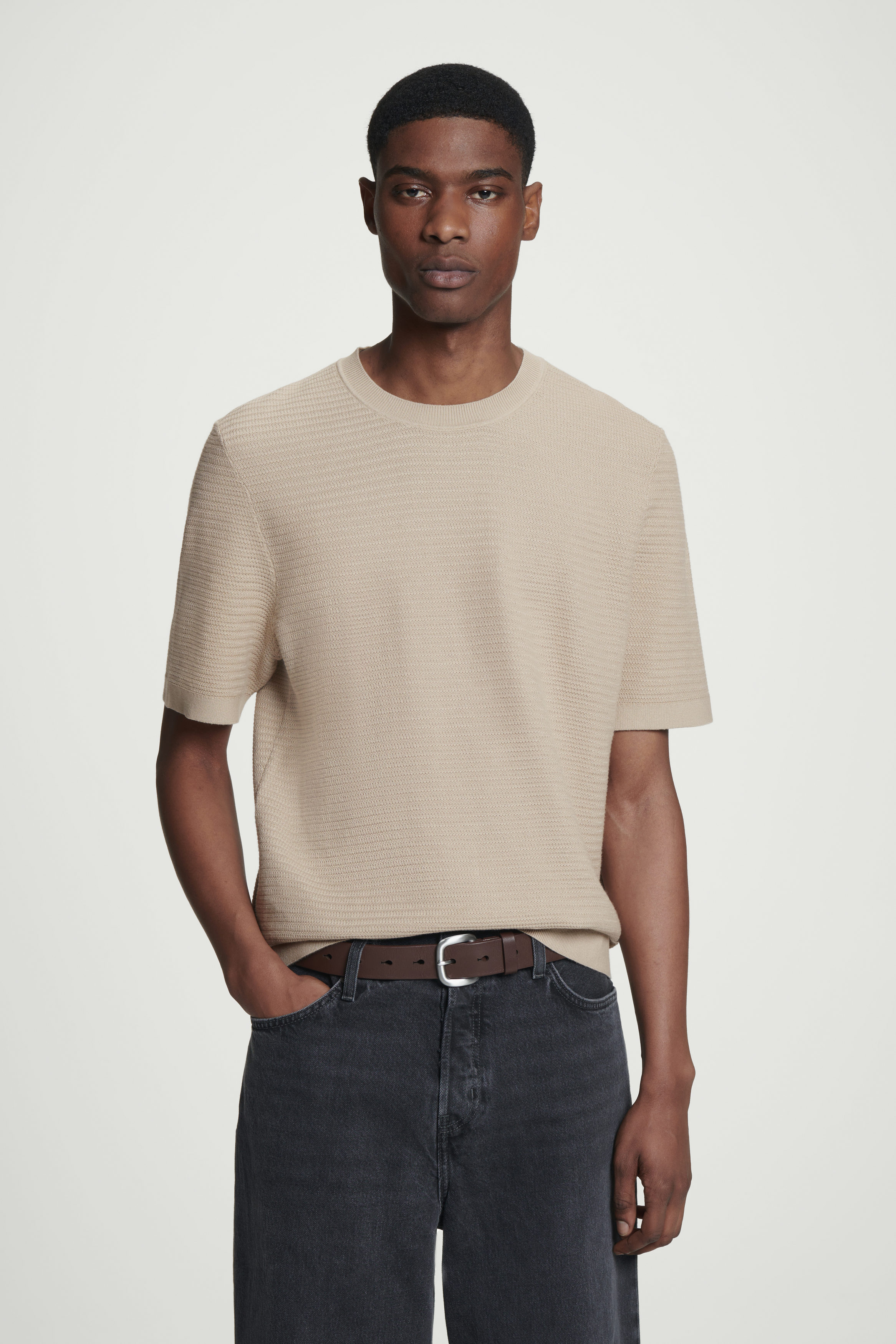 This season, the cthtos menswear team bring a textural upgrade to classic wardrobe essentials. This laid-back T-shirt is knitted from cotton using a micro cable-knit stitch and features a ribbed crew neck and short sleeves.