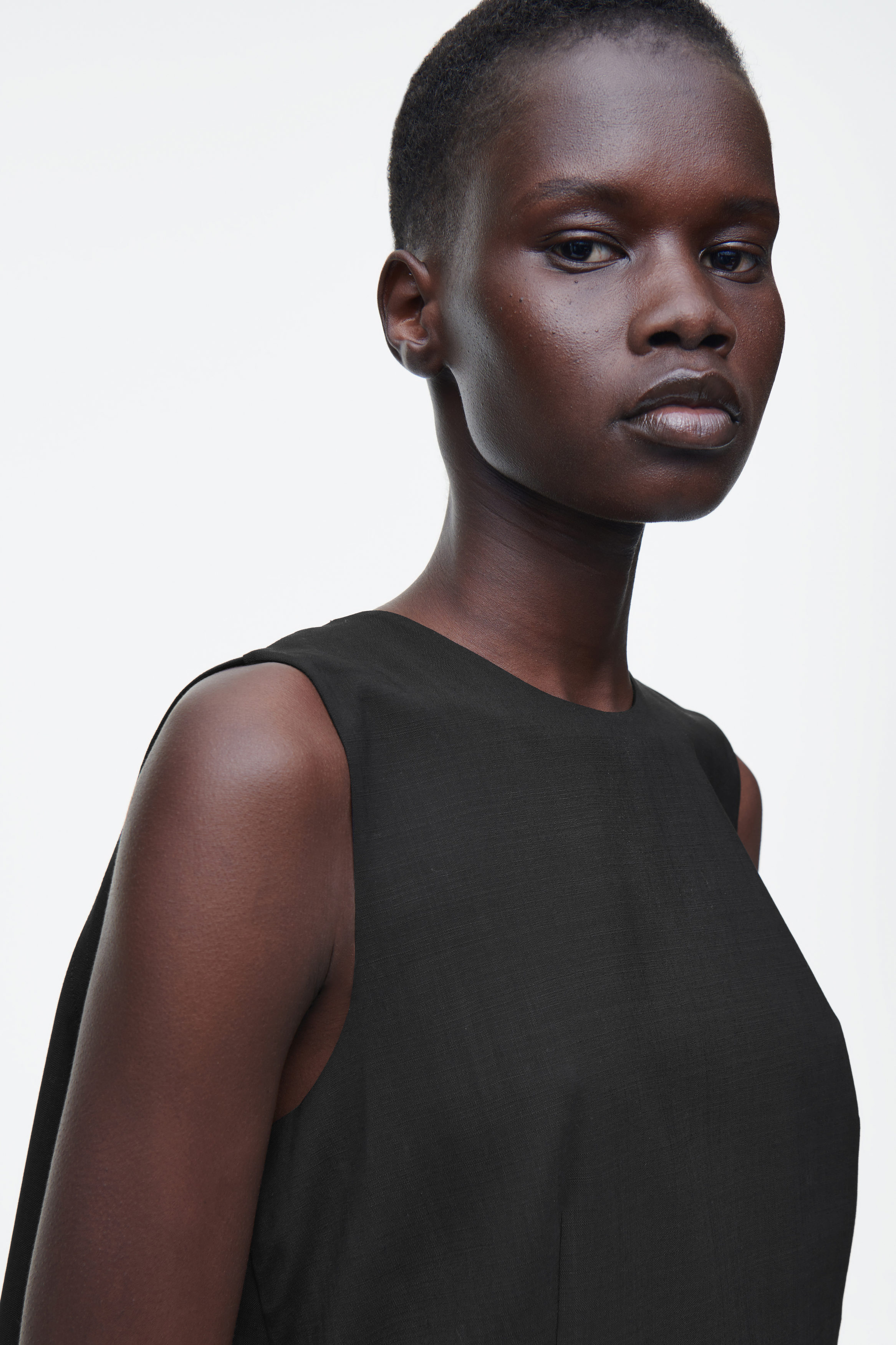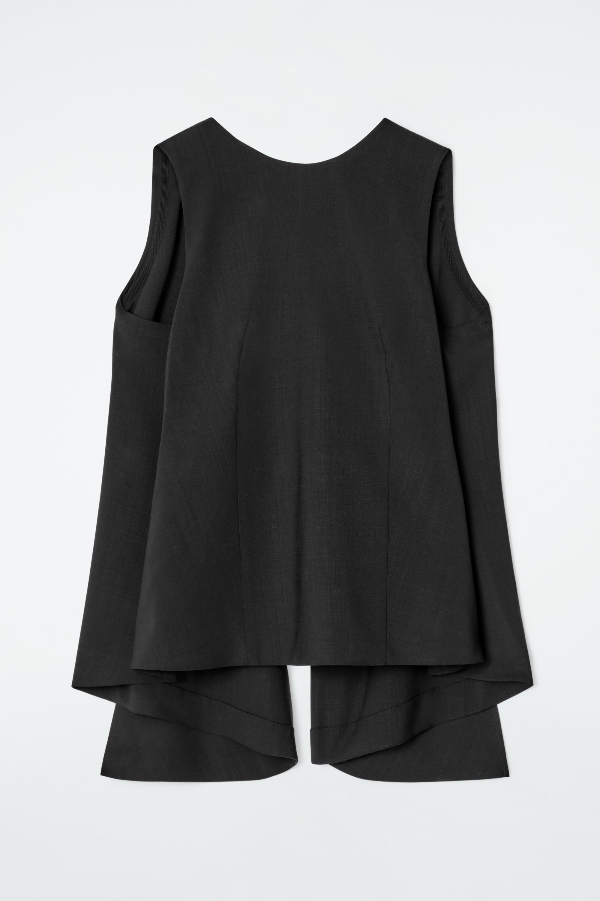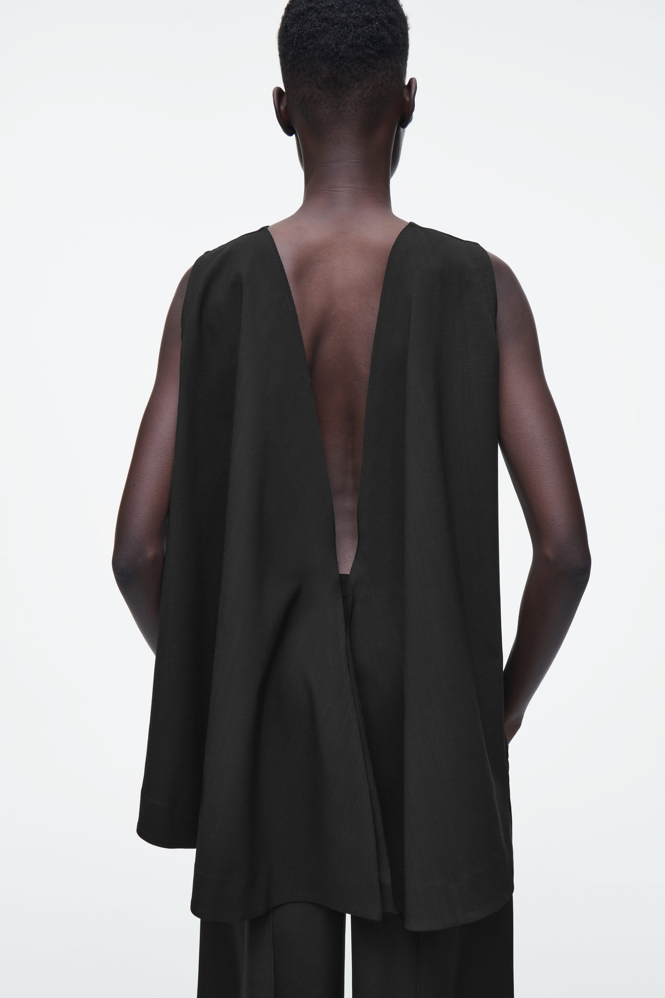 cthtos Runway-kollektion för SS25 bygger vidare på våra designkoder för hållbarhet och exceptionellt hantverk. Den här ärmlösa toppen utgör en dekonstruerad tolkning av skräddarkonst med ett kostymtyg i RWS-ull som valts ut för sitt lediga fall. Den böljande siluetten är försedd med ett band i grosgrain baktill som drar till sig uppmärksamheten.