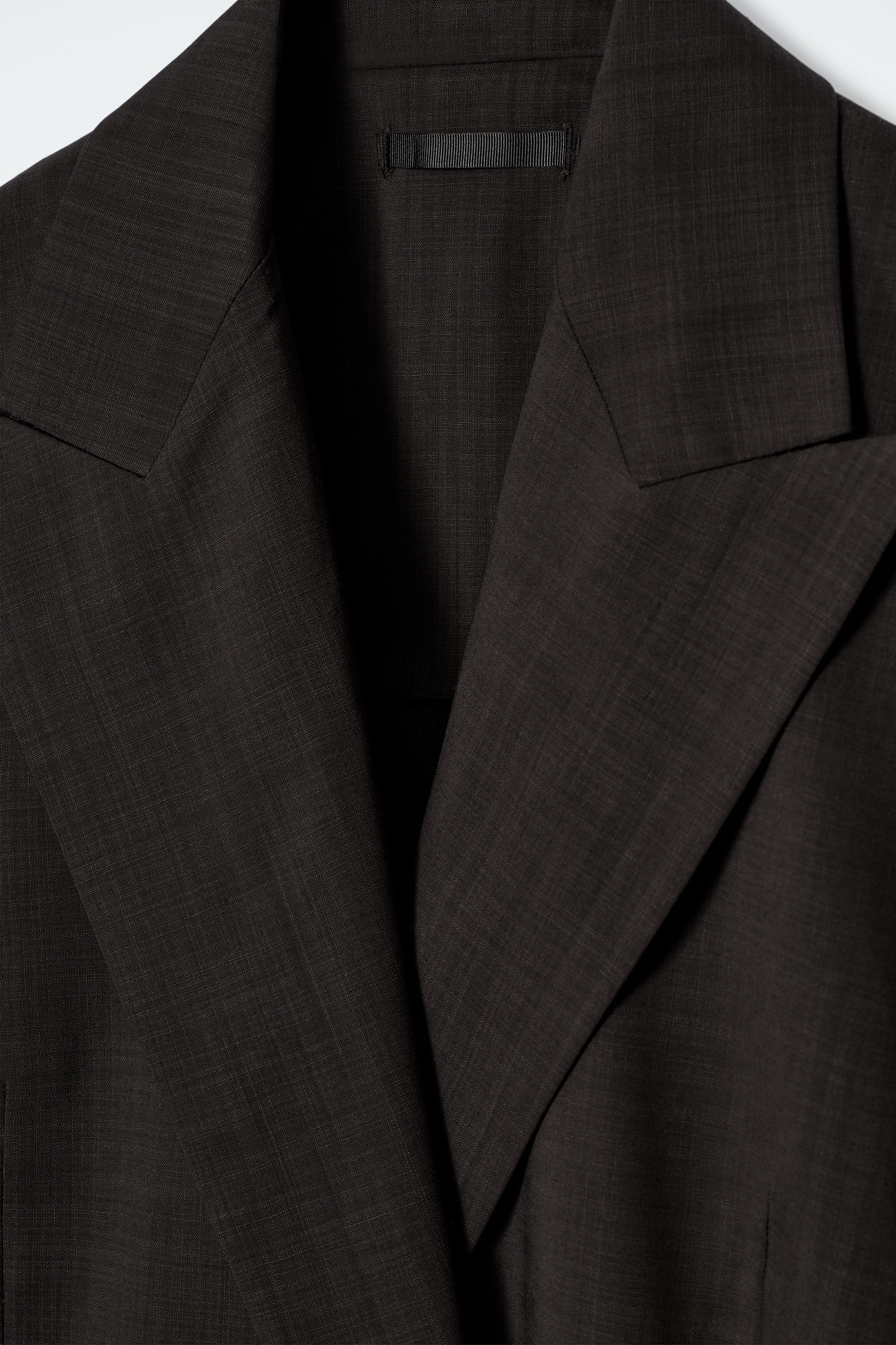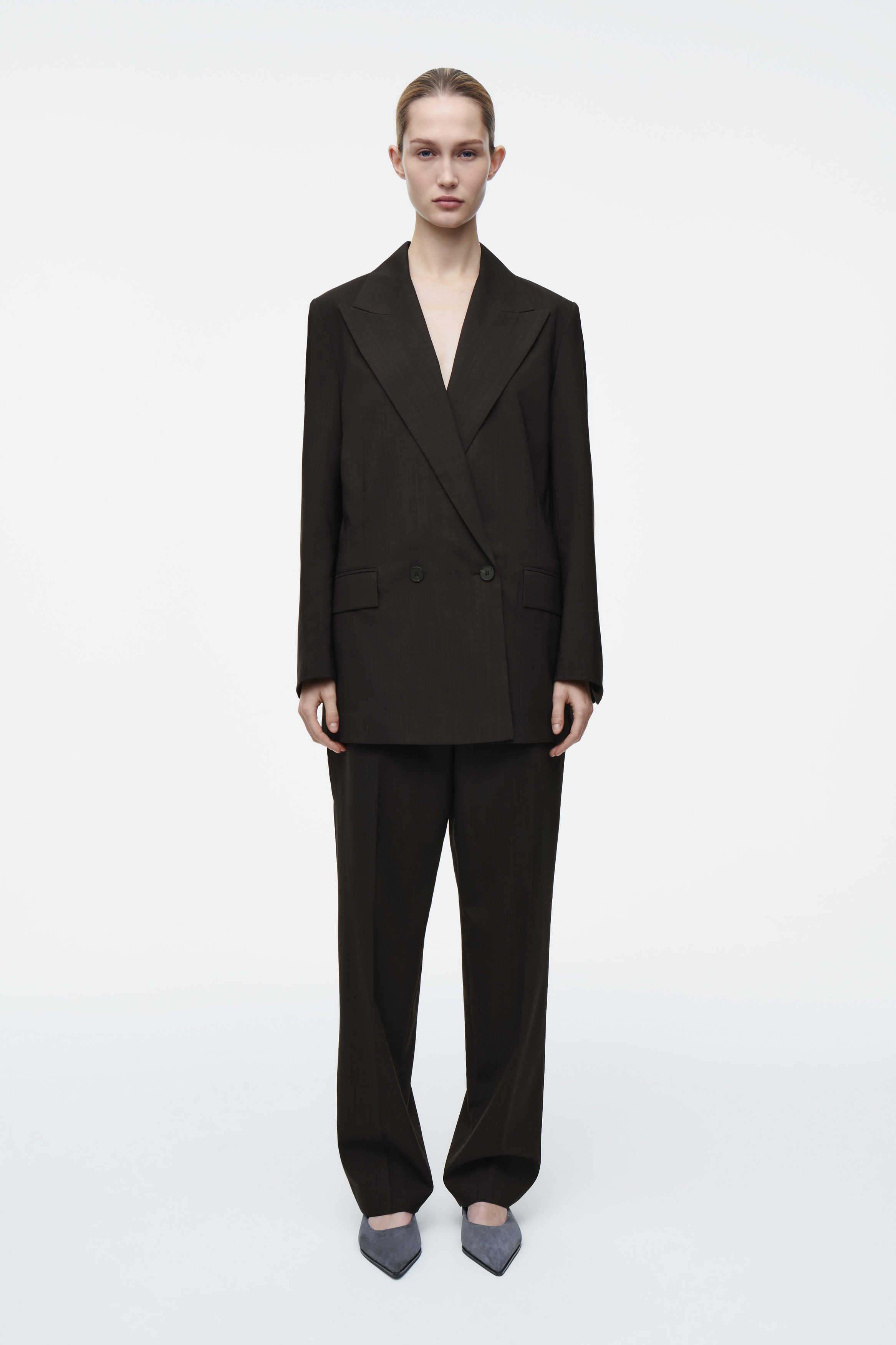 cthtos Runway-kollektion för SS25 bygger vidare på våra designkoder för hållbarhet och exceptionellt hantverk. Den här dubbelknäppta kavajen utgör ett typexempel på klanderfri skräddarkonst med en ullblandning på premiumnivå som valts ut för sin lätta känsla och naturliga struktur – den är skräddad med ett klassiskt snitt som görs modernt med spetsiga slag och en lång, dubbelknäppt siluett. Upphängningsöglan i grosgrain utgör en signaturdetalj för kapselkollektionen. Styla som en kostym med de matchande byxorna.