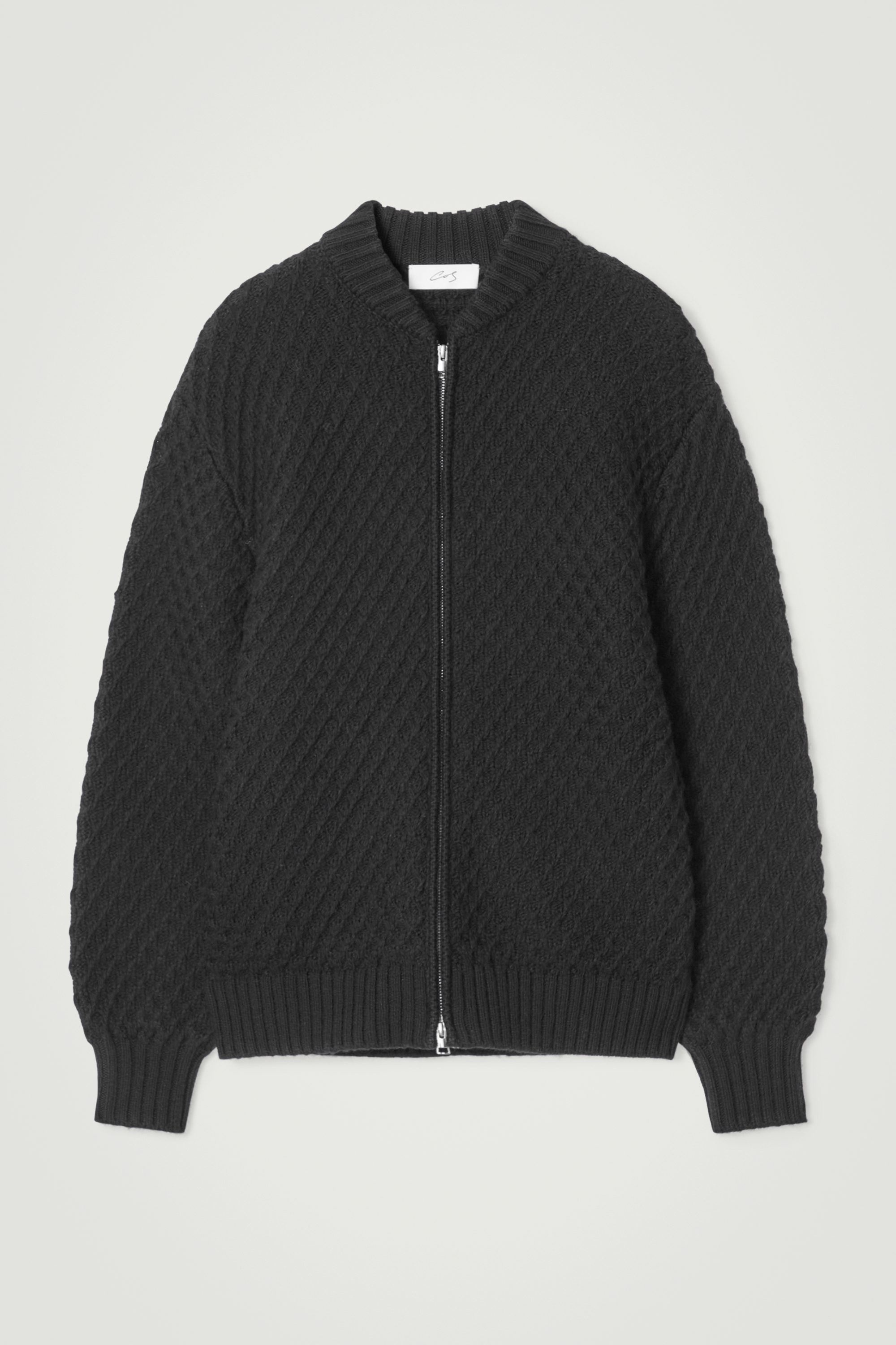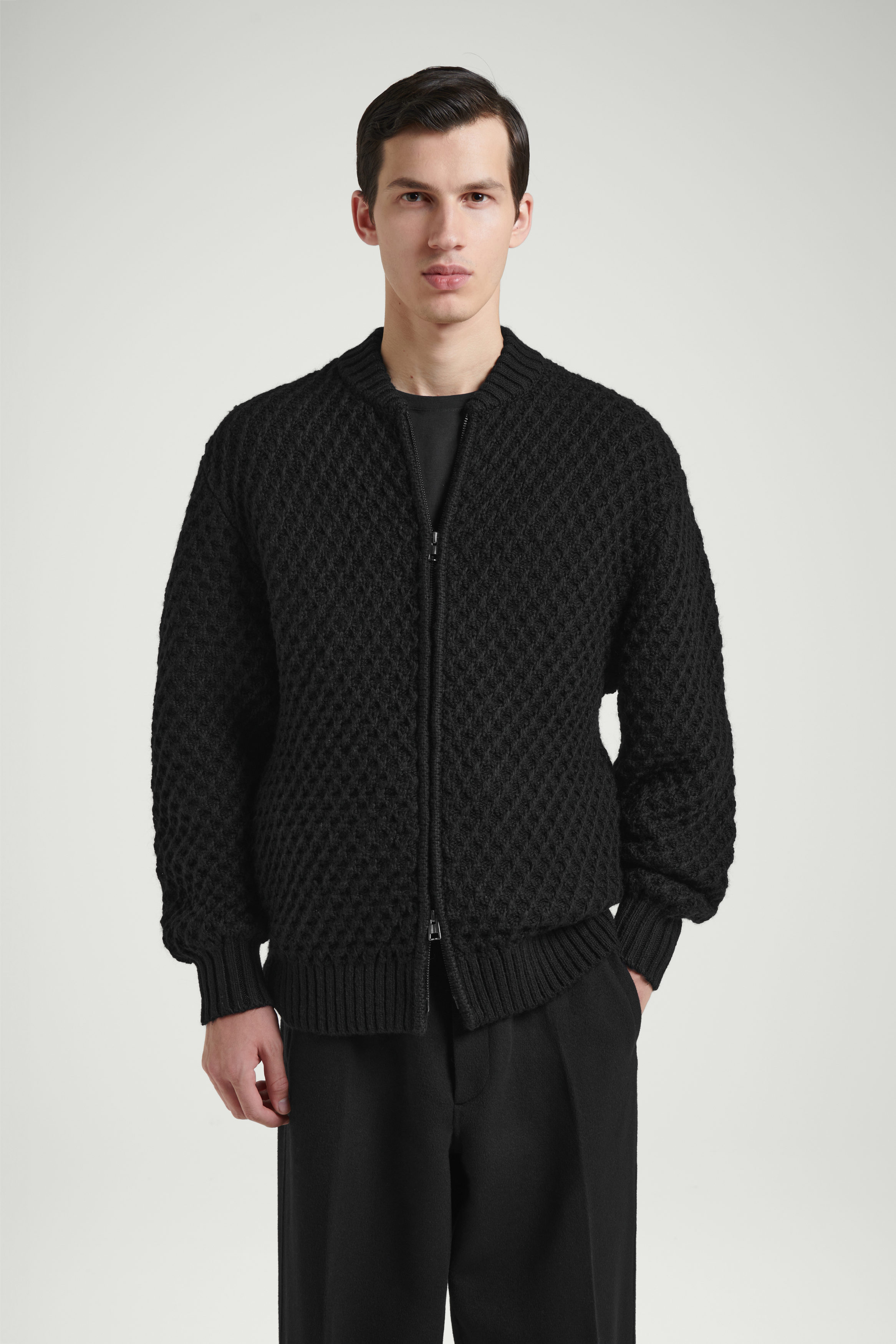 Jackan är stickad av exklusivt garn med RWS-ull och alpacka och vaxkakemönstret tillför diskret struktur.