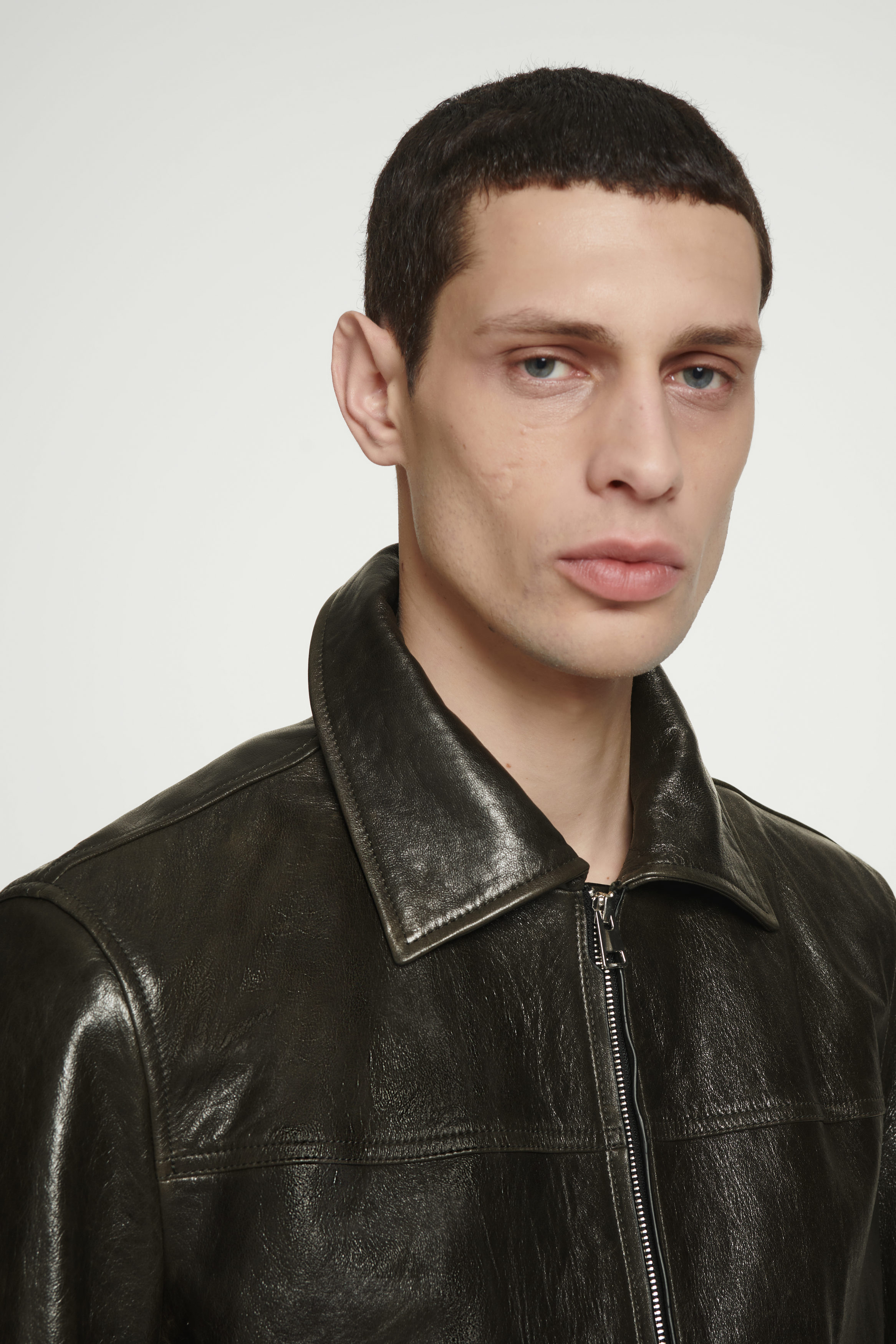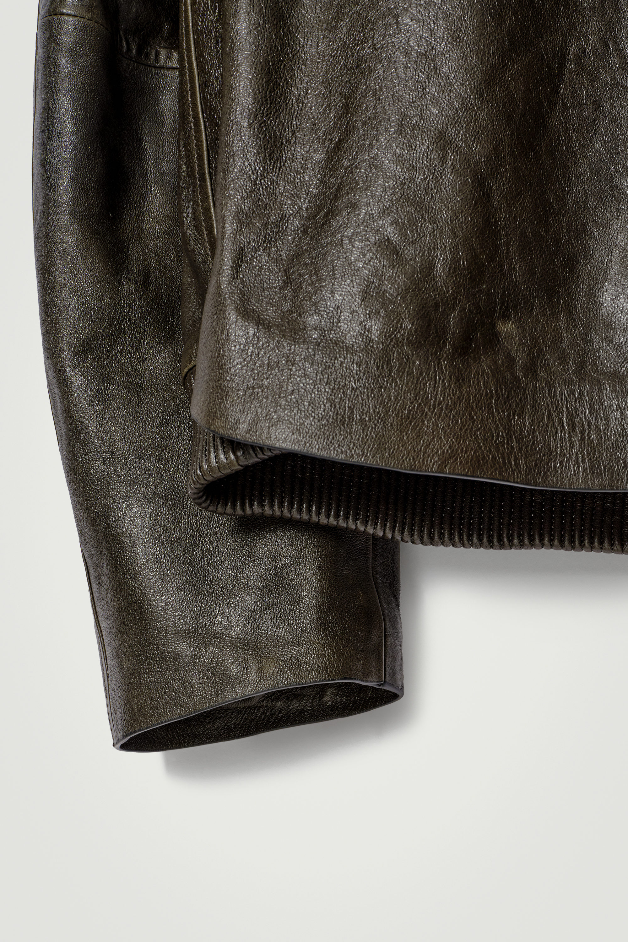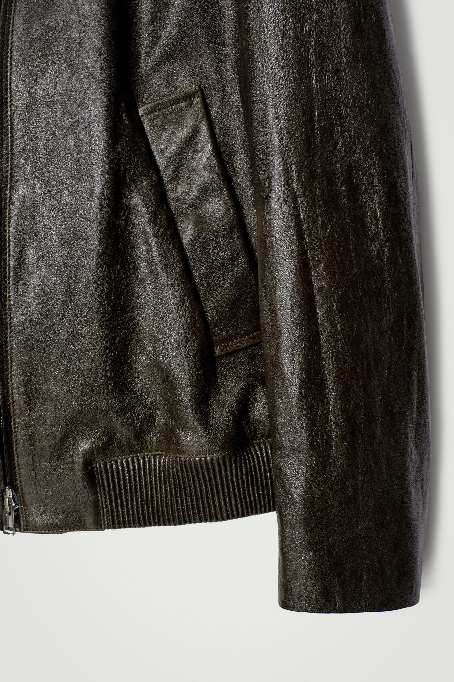 cthtos Runway-kollektion för SS25 bygger vidare på våra designkoder för hållbarhet och exceptionellt hantverk. den här säsongen utforskar designteamet en tyst evolution för signaturplagg som den här skinnjackan. Den är gjord av mjukt, kromfritt lammskinn i en intensiv, djup khakinyans som med tiden får en unik patina. Jackan har en ribbstickad nederkant i läder, dragkedja som kan justeras från båda håll och en hög stormflik baktill.