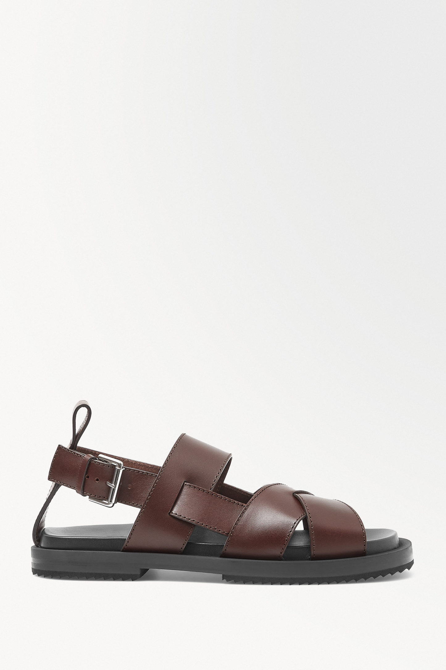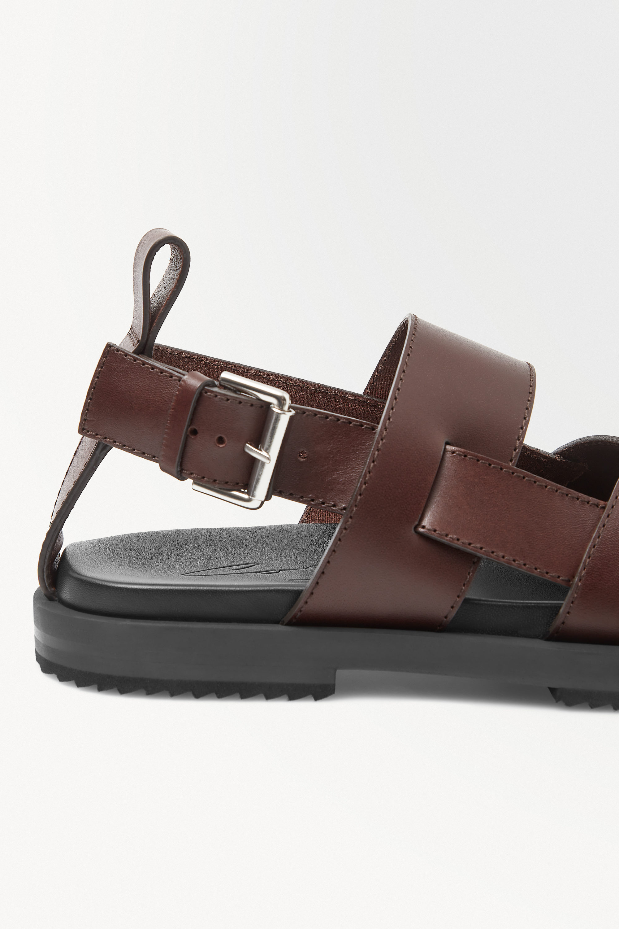 Vi valde ett kromfritt läder med slät yta som garvats i en intensiv espressonyans och polerats för subtil glans. Lädrets tjocklek gör sandalen slitstark och hållbar, vilket även gäller gummisulan som kommer att hålla i många år.