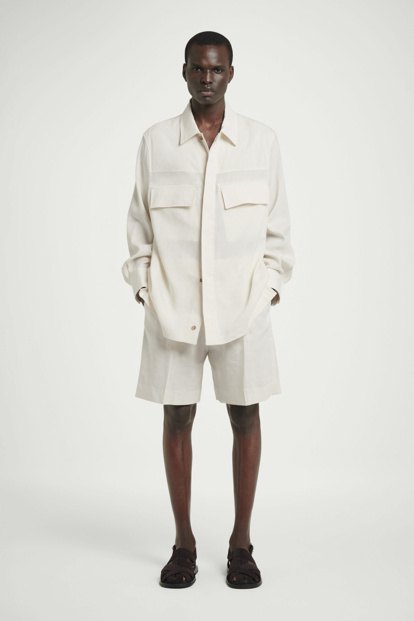 cthtos Runway-kollektion för SS25 bygger vidare på våra designkoder för hållbarhet och exceptionellt hantverk. Det här är en overshirt med avslappnad passform som hämtar inspiration från workwear och är gjord av en linneblandning med tydlig struktur och klassisk krage, fickor med lock i workerdesign och en upphängningsögla i grosgrain – en av vår signaturdetaljer. Kombinera med jeans eller de matchande shortsen.