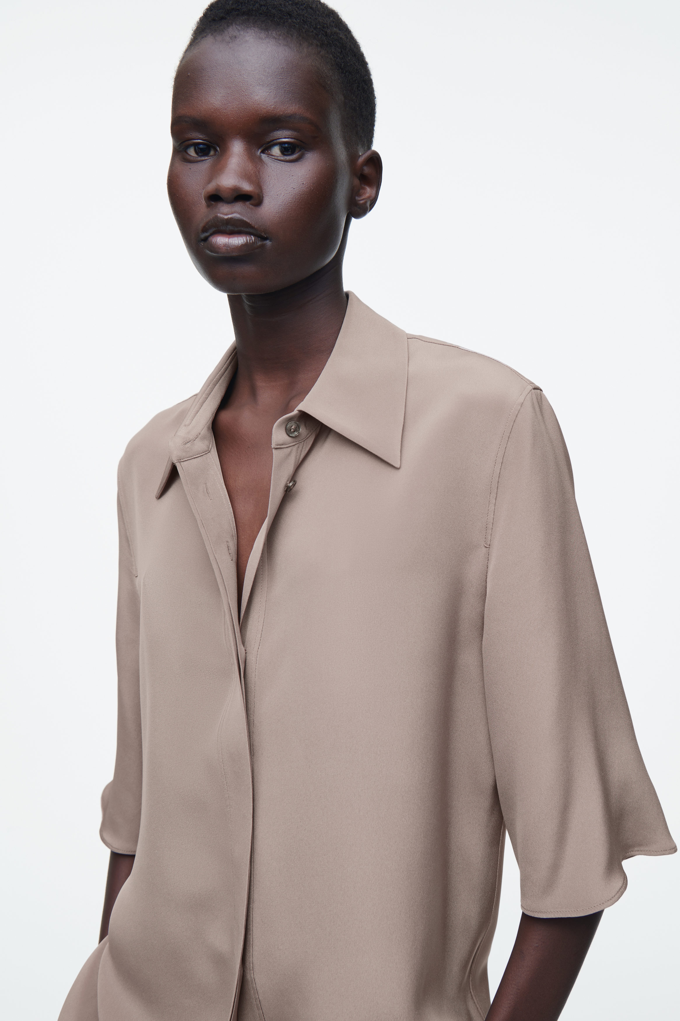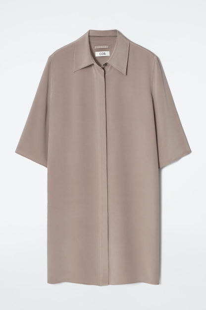 cthtos SS25-kollektion för catwalken bygger vidare på våra designkoder för hållbarhet och exceptionellt hantverk. Den här kortärmade skjortan i en naturlig, ljusbrun nyans utgör ett typexempel på modern elegans – lägg märke till den stilrena, klassiska kragen, det långa snittet och pärlemorknapparna. Crepematerialet av 100 % mullbärssilke valdes ut för sin lyxigt mjuka känsla och sitt lediga fall.