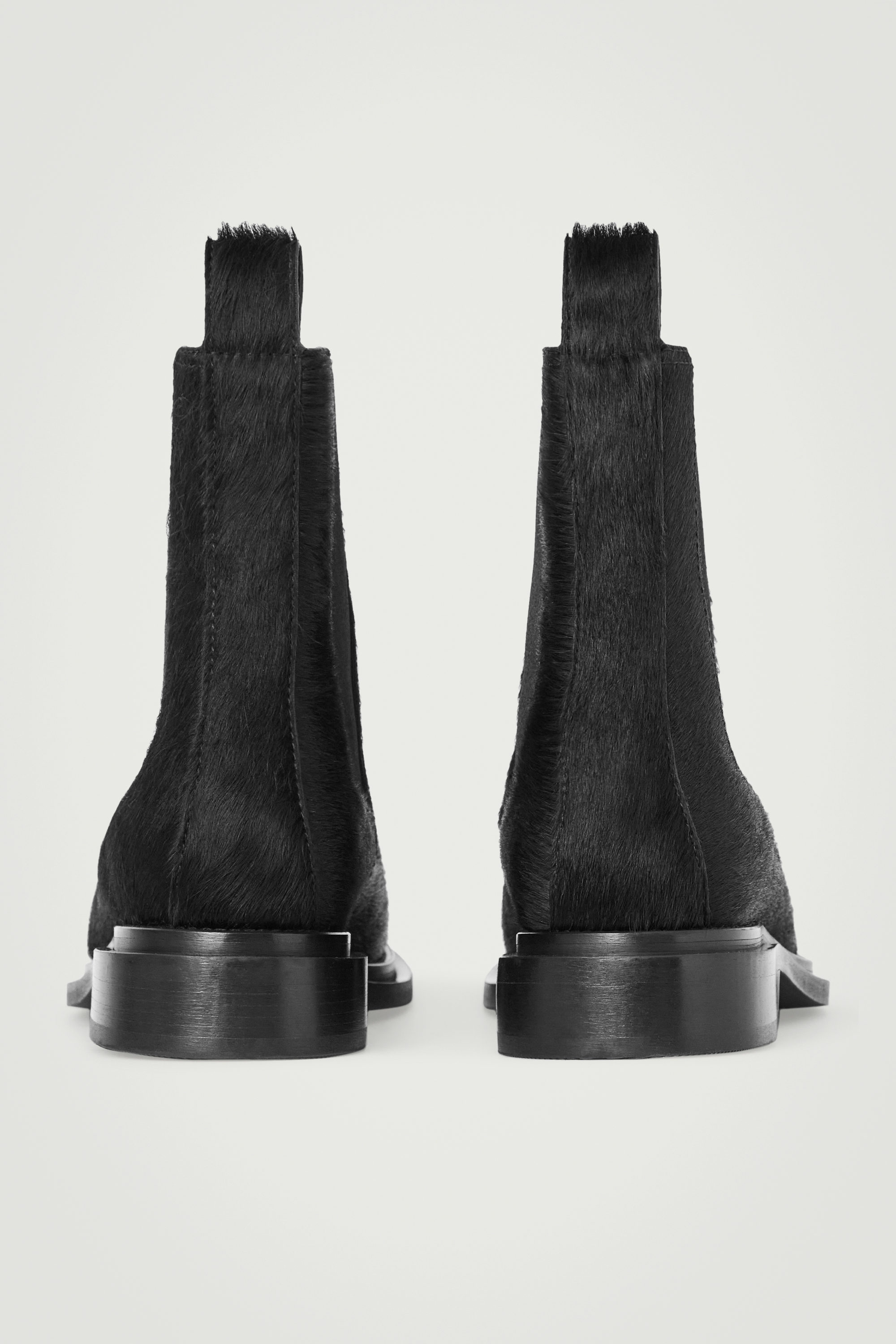 Bootsen är tillverkade av tidlöst mörkgrått ponnyläder, noggrant utvalt för sin mjuka yta och det moderna uttrycket. De vilar på en yttersula i polerat läder med låg klack.