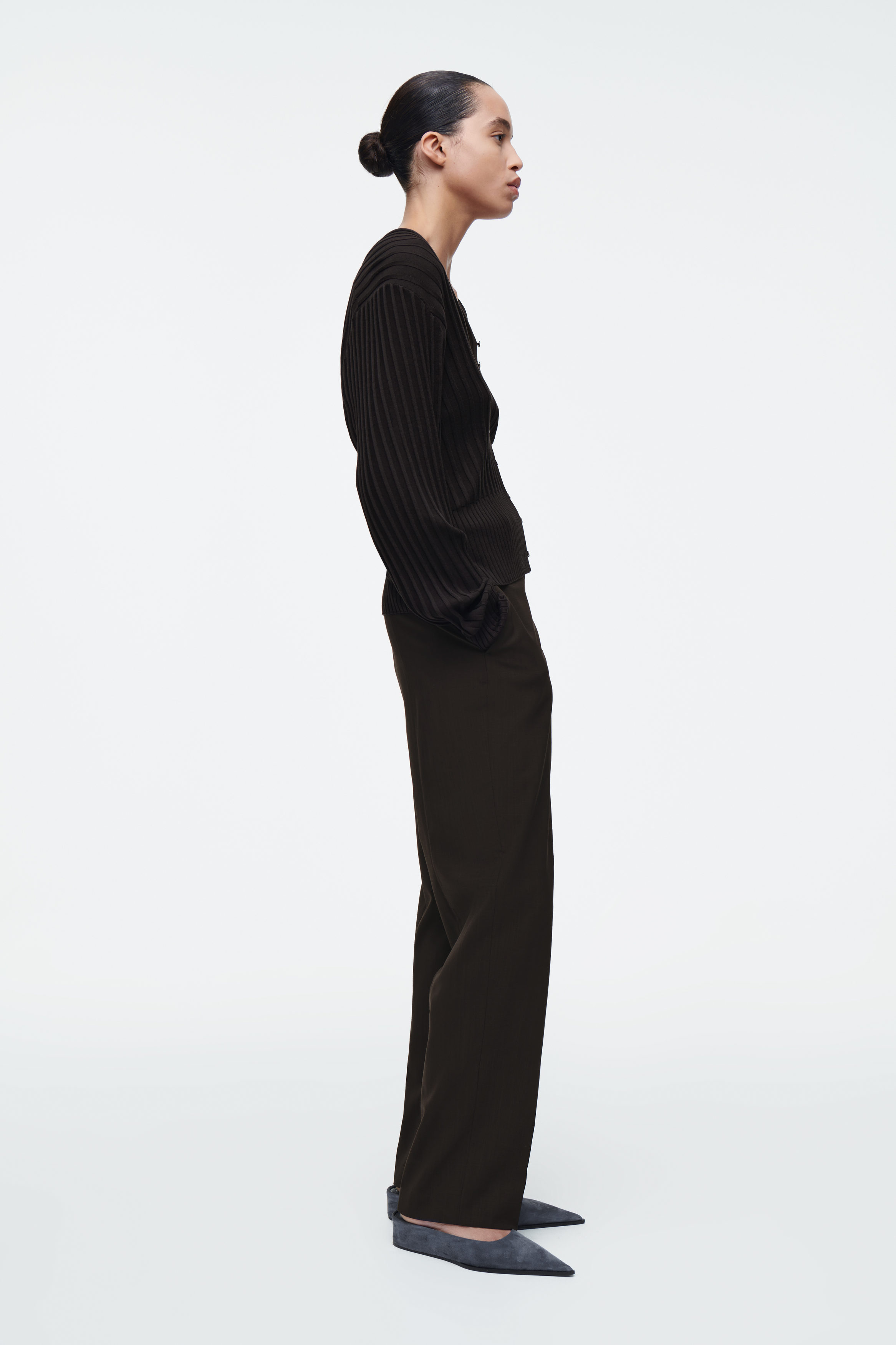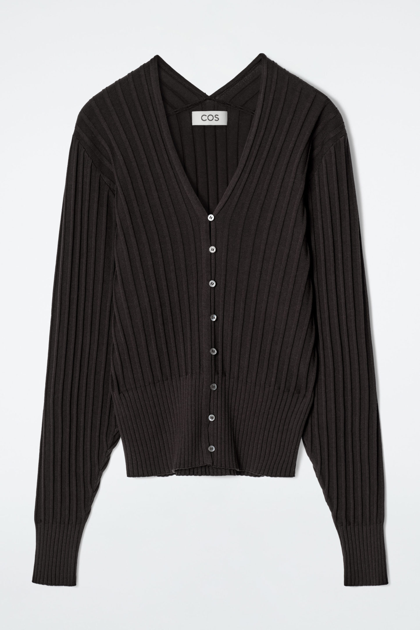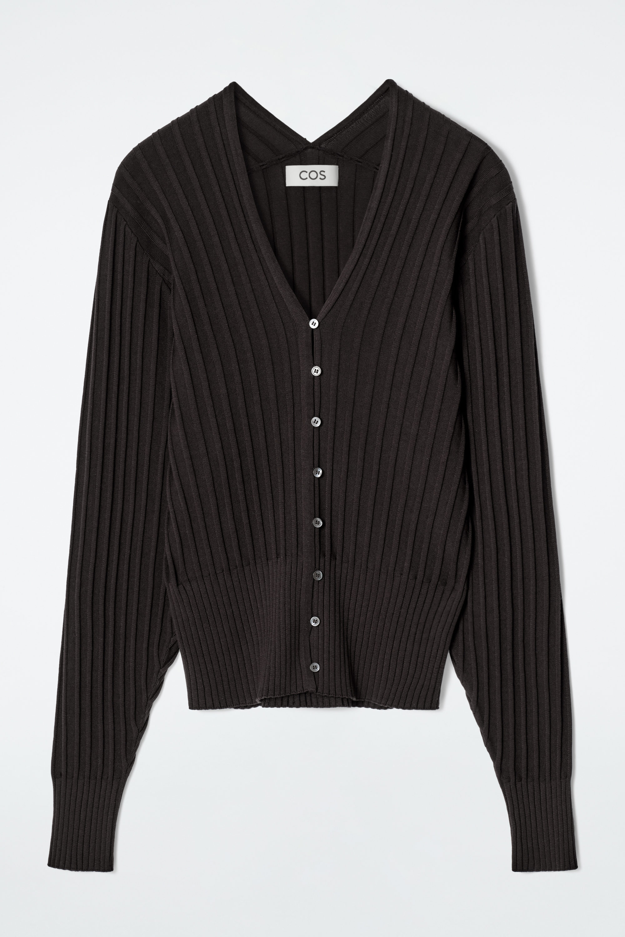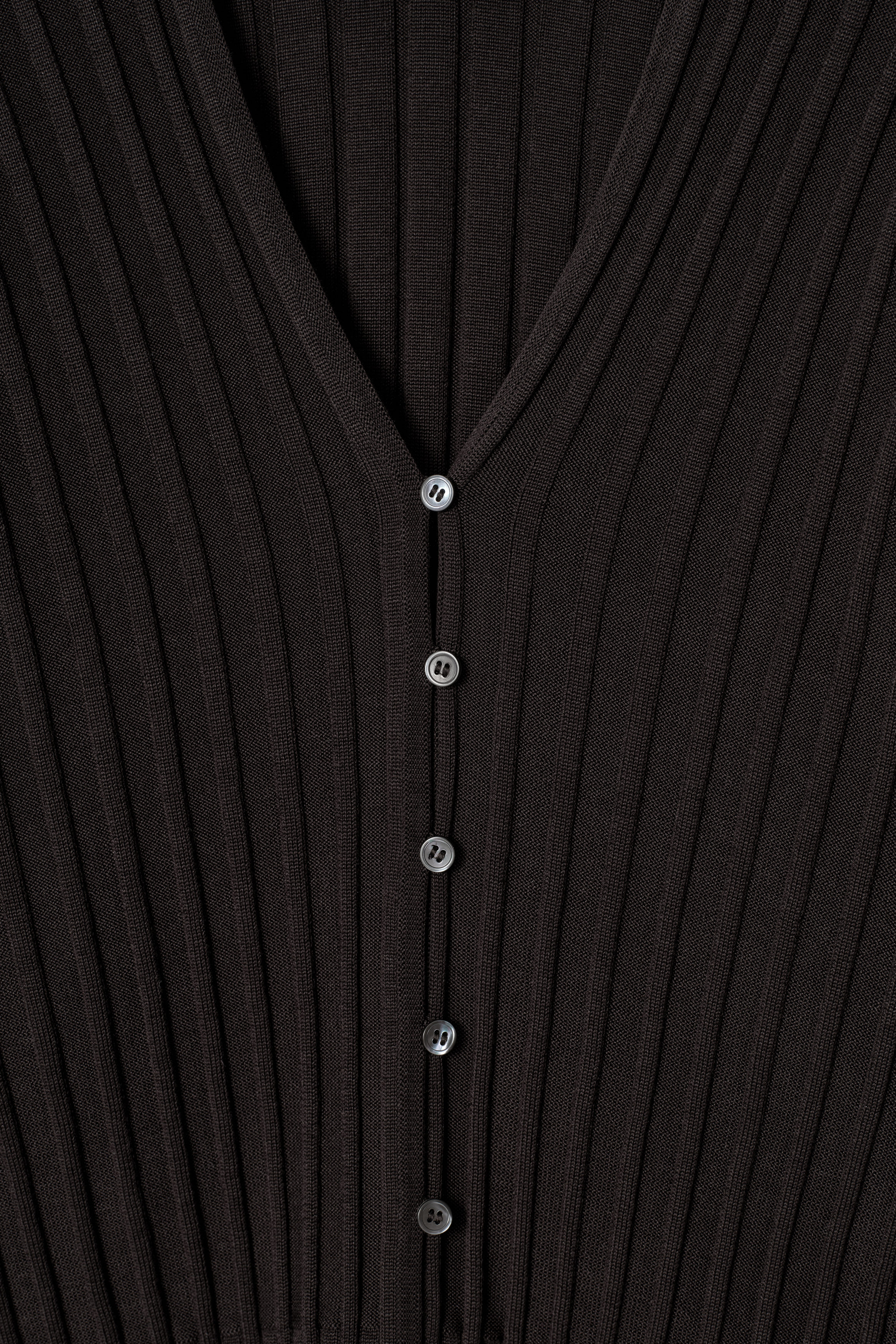 cthtos Runway-kollektion för SS25 bygger vidare på våra designkoder för hållbarhet och exceptionellt hantverk. Den här v-ringade koftan i en intensivt chokladbrun nyans är gjord av en premiumblandning med mullbärssilke och mjuk bomull som ribbstickats för en taktil finish. Siluetten är smal och kokongformad baktill i kombination med pärlemorknappar. Styla som ett set med de matchande korta shortsen.