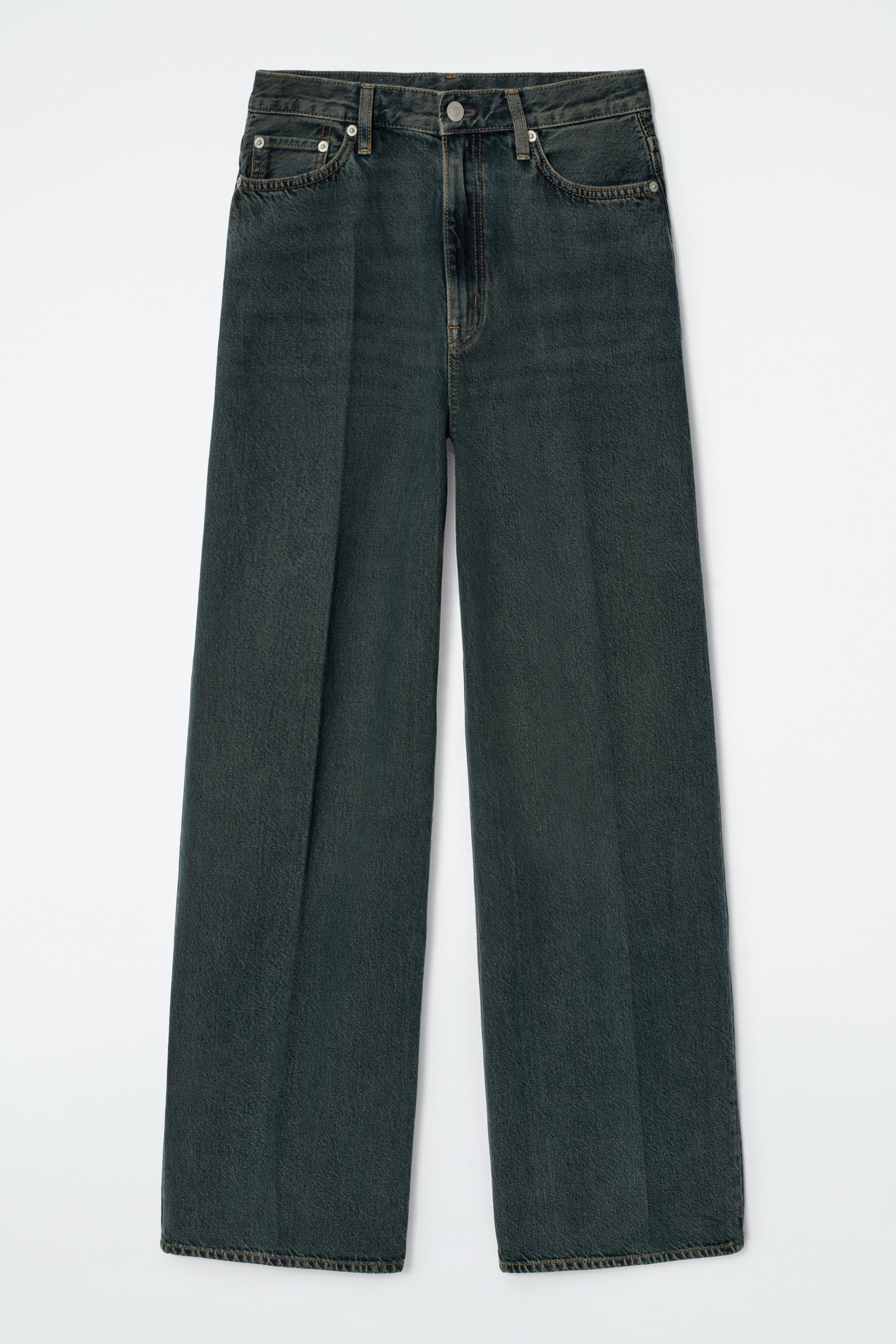 Jeansen Tide kännetecknas av en hög midja och långa, vida ben. De är tillverkade av denim med ekologisk och återvunnen bomull utan stretch och har en klassisk, mellanblå tvätt. De hellånga benen faller snyggt precis ovanför golvet och jeansen funkar lika bra med klackar som lågskor.
