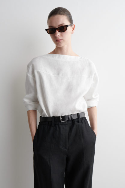 Equal parts effortless and refined, this modern blouse is crafted from lightweight linen and cut in a relaxed silhouette. It's designed with a boat neckline, slightly cropped sleeves and a keyhole detail at the back that fastens with tonal ties.