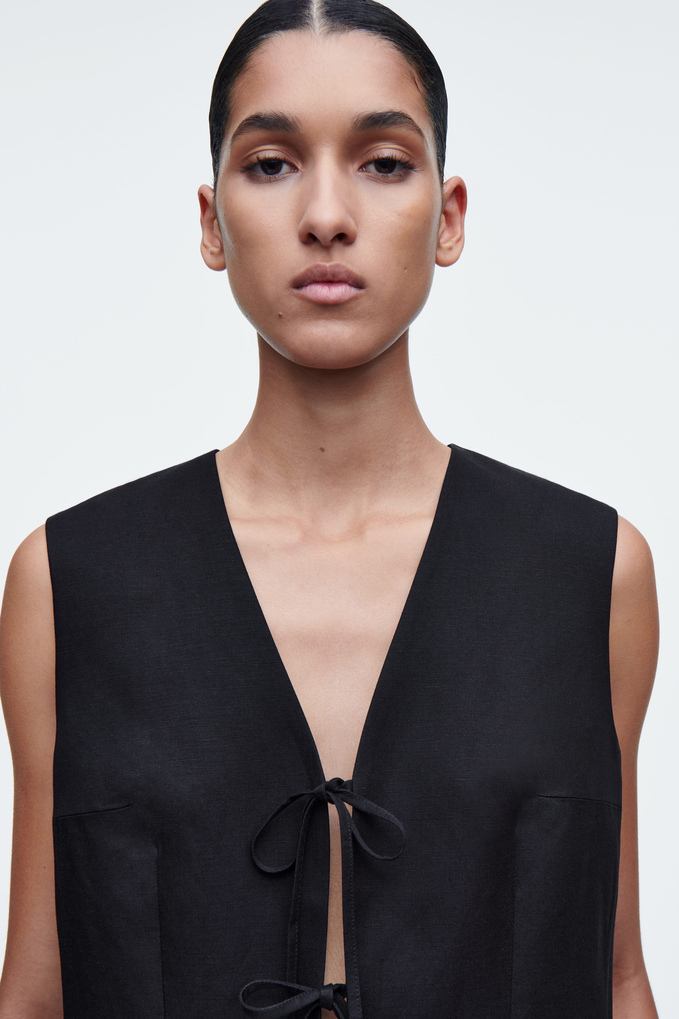 cthtos designteam omtolkar klassiska skrädderikoder i den här västen med smala knytband istället för knappar. Den är tillverkad i en lätt blandning av ECOVERO™, lin och bomull i en mångsidig, marinblå nyans gör den lätt att styla med resten av din garderob.
