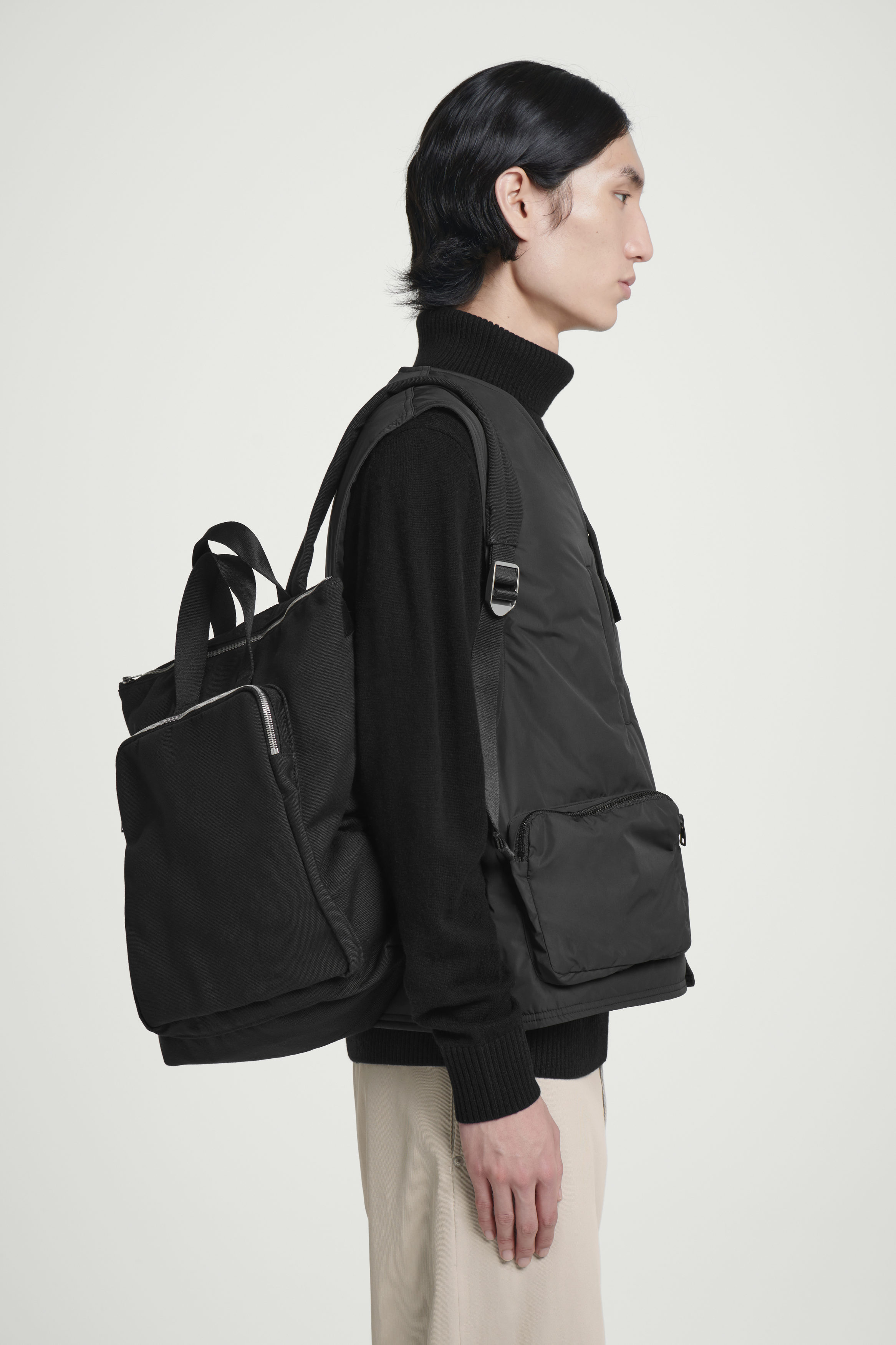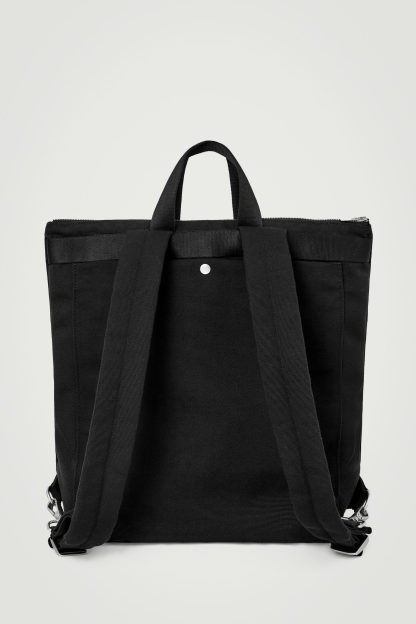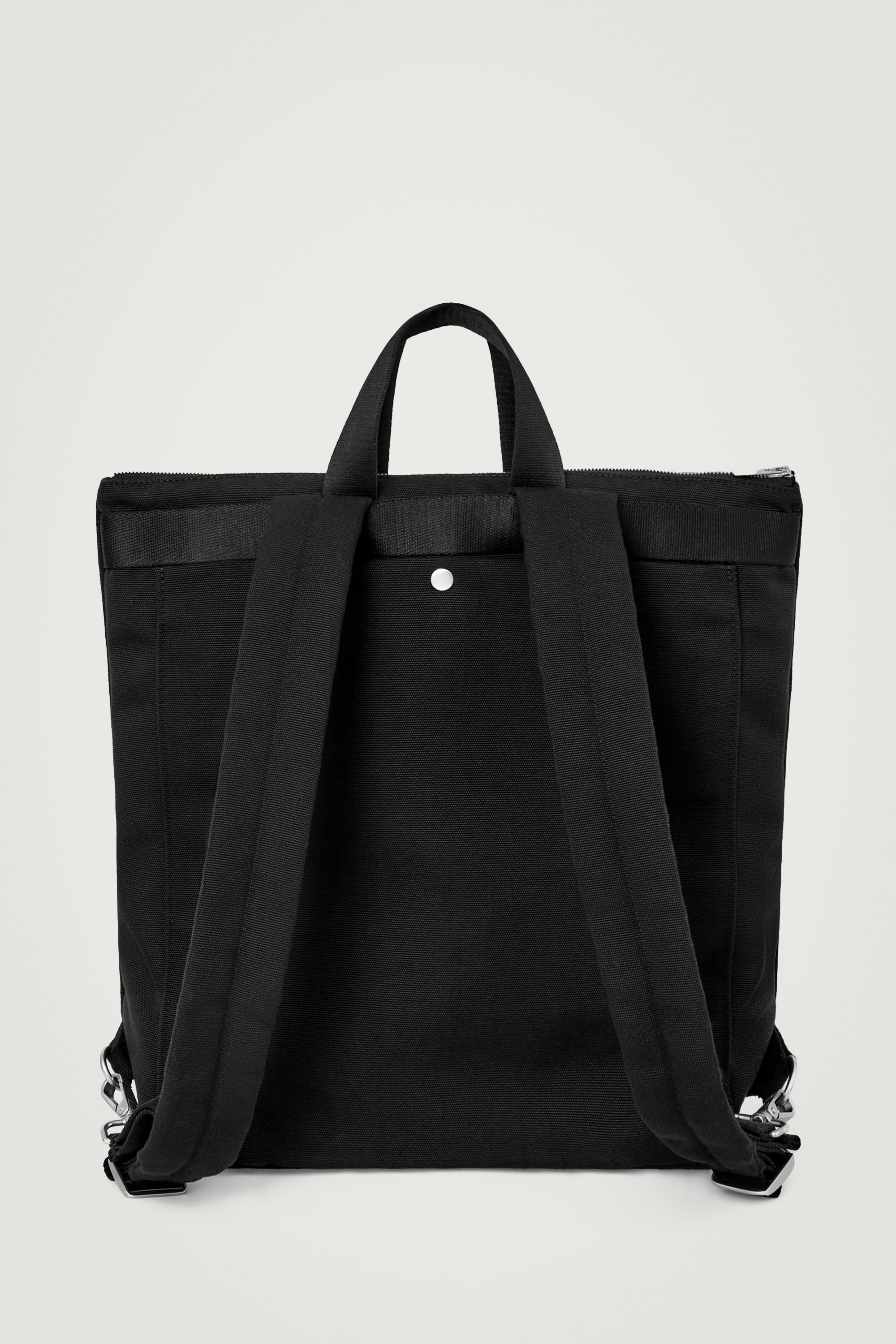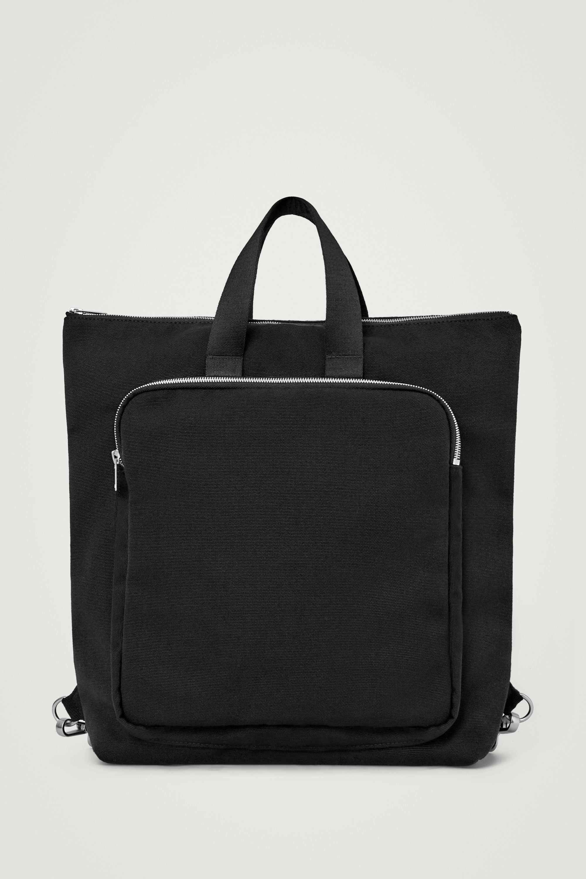 Denna väska är en modern tolkning av två praktiska accessoarer: ryggsäcken och totebagen. Väskan är designad för att bäras varje dag och är tillverkad av slitstark, vattenavvisande canvas. Den har en extern ficka med dragkedja, ett rymligt huvudfack med en vadderad del för din laptop. Bakfickan döljer de justerbara axelremmarna och fungerar för att fästa den på handtaget på din resväska.