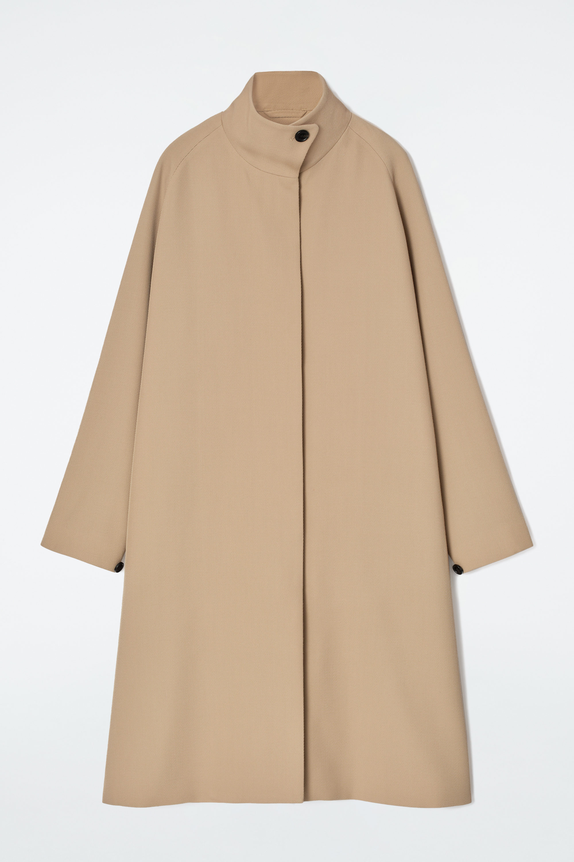 Designteamet tolkar den klassiska långa kappan ur ett modernt perspektiv den här säsongen. En tidlöst kamelbeige nyans kombineras med en RWS-ullblandning i premiumkvalitet och ett trapetssnitt med subtilt voluminös nederdel. Designen har en mjukt välvd hög krage och subtila fladdermusärmar.