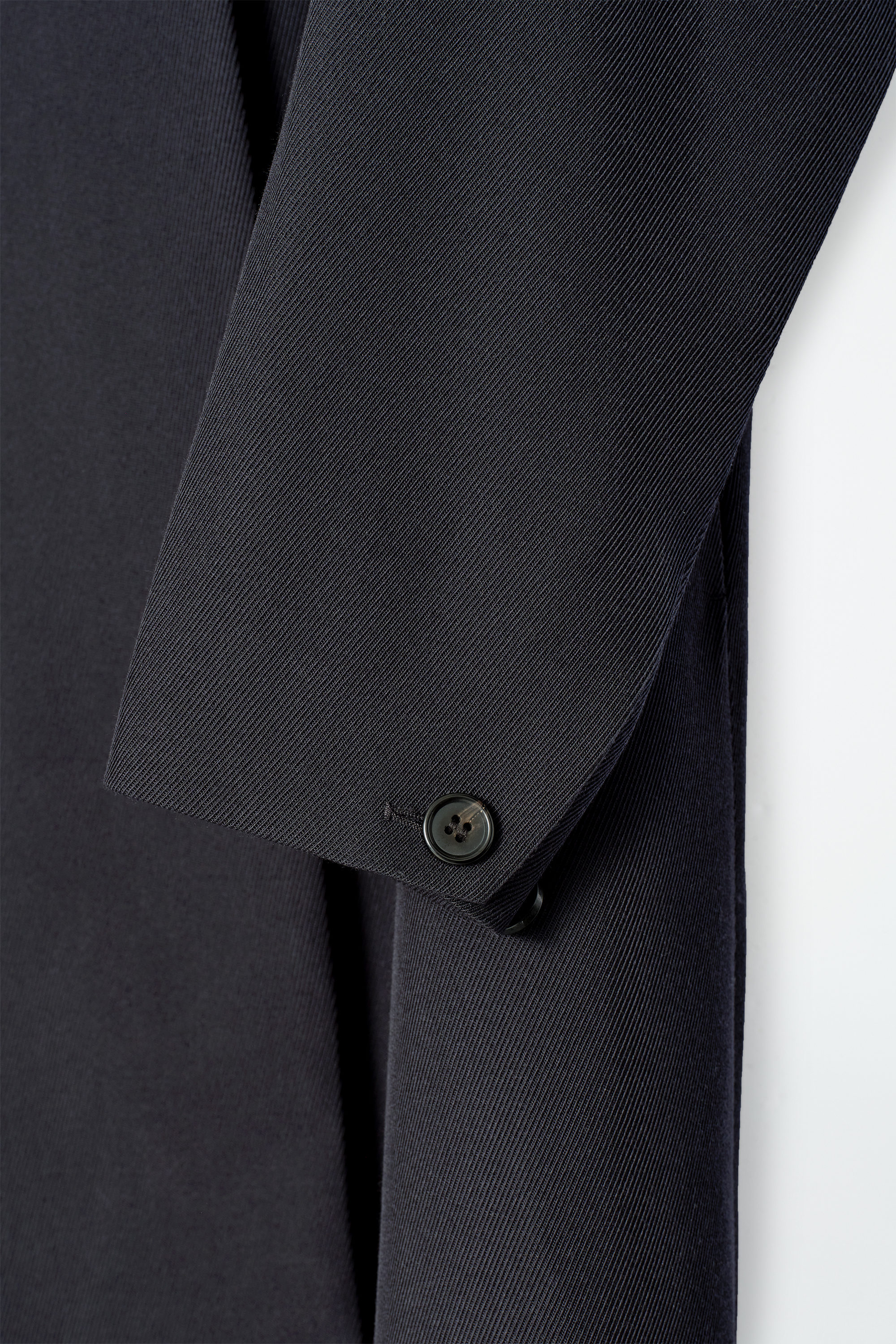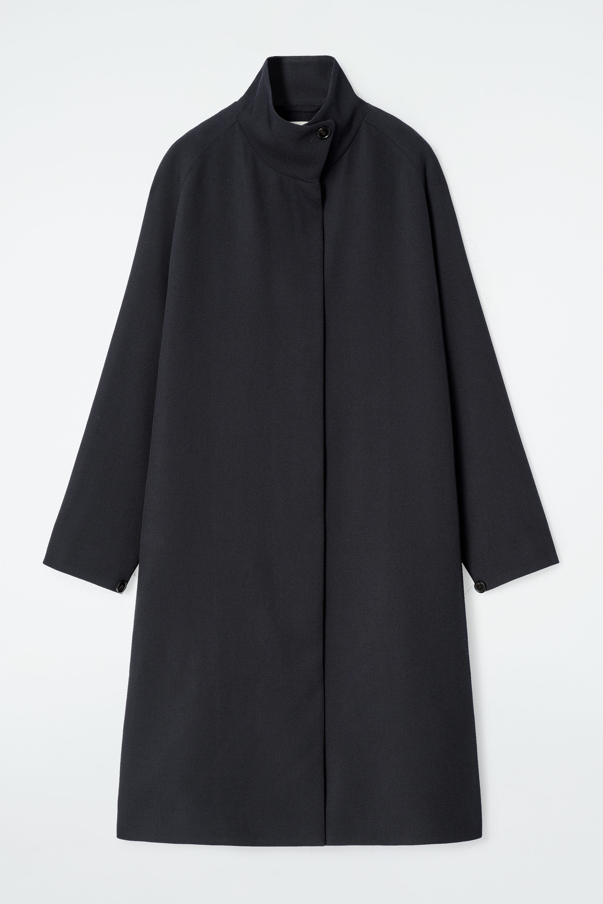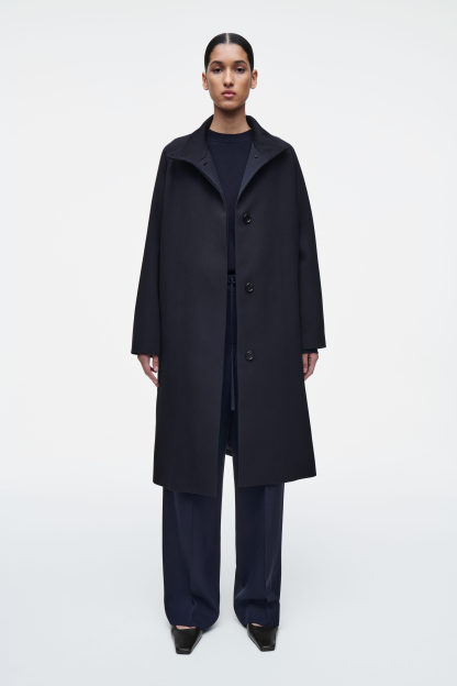 Designteamet tolkar den klassiska långa kappan ur ett modernt perspektiv den här säsongen. En tidlöst marinblå nyans kombineras med en RWS-ullblandning i premiumkvalitet och ett trapetssnitt med subtilt voluminös nederdel. Designen har en mjukt välvd hög krage och subtila fladdermusärmar.