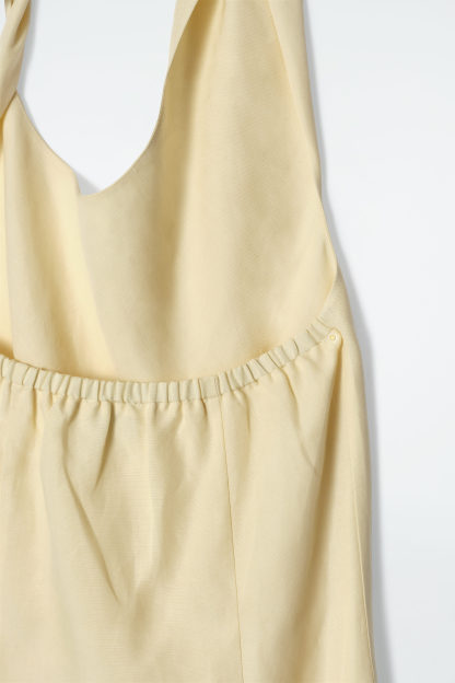 En elegant klänning med asymmetriskt, vriden halsringning samt rynkad resår i ryggen. Den är tillverkad av en luftig, ljusgul linneblandning som lämpar sig för varmare väder. Styla den till sommaren med en vävd väska och sandaler.