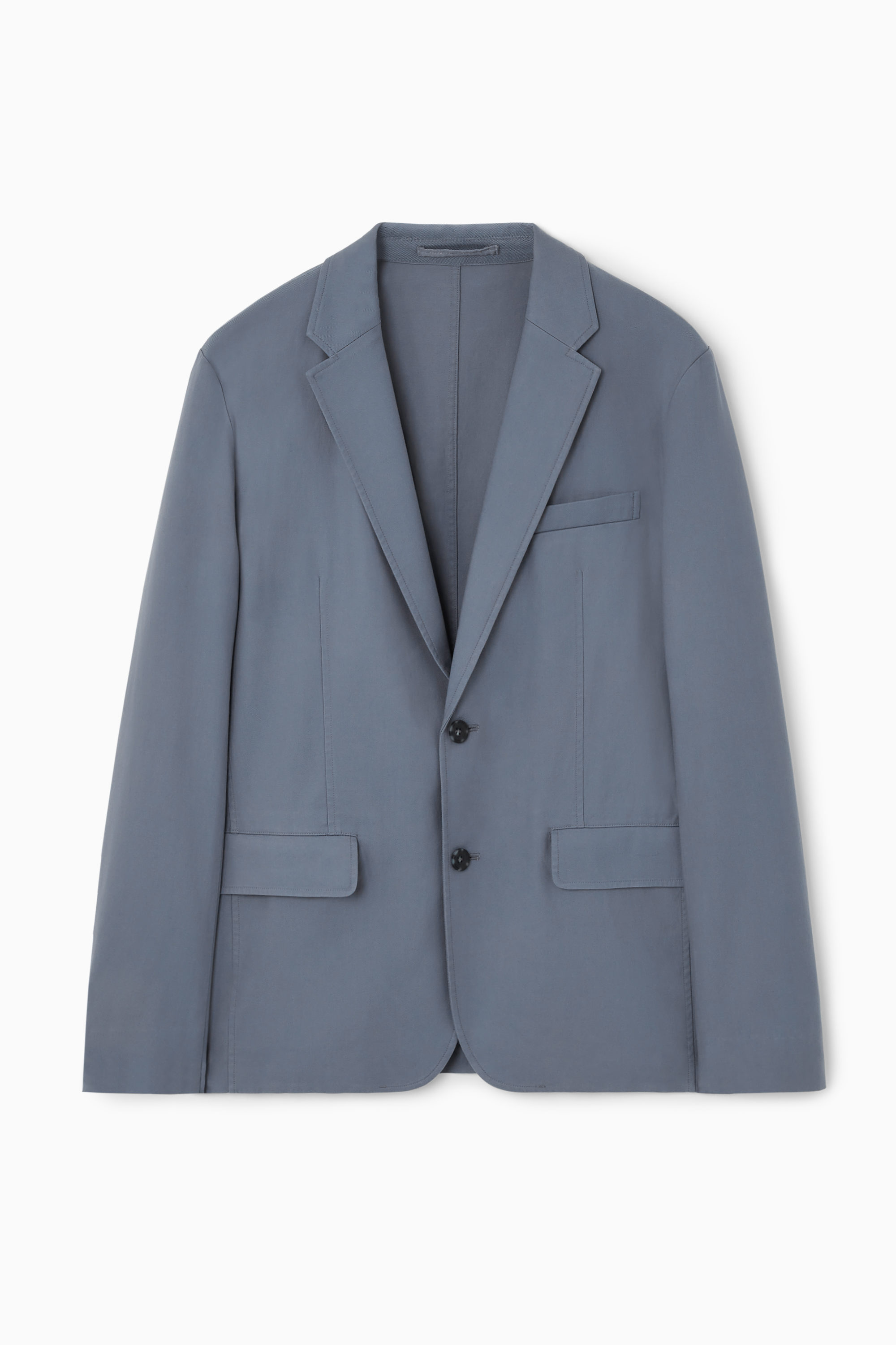 Avslappnat skräddade plagg utgör en naturlig del av verksamheten för cthtos herrmodeteam. Den här enkelknäppta kavajen har en nonchalant look utan struktur och är gjord av en blandning av TENCEL™-lyocell och bomullstwill i en dimblå tvätt. Bär den som en kostym med de matchande byxorna.