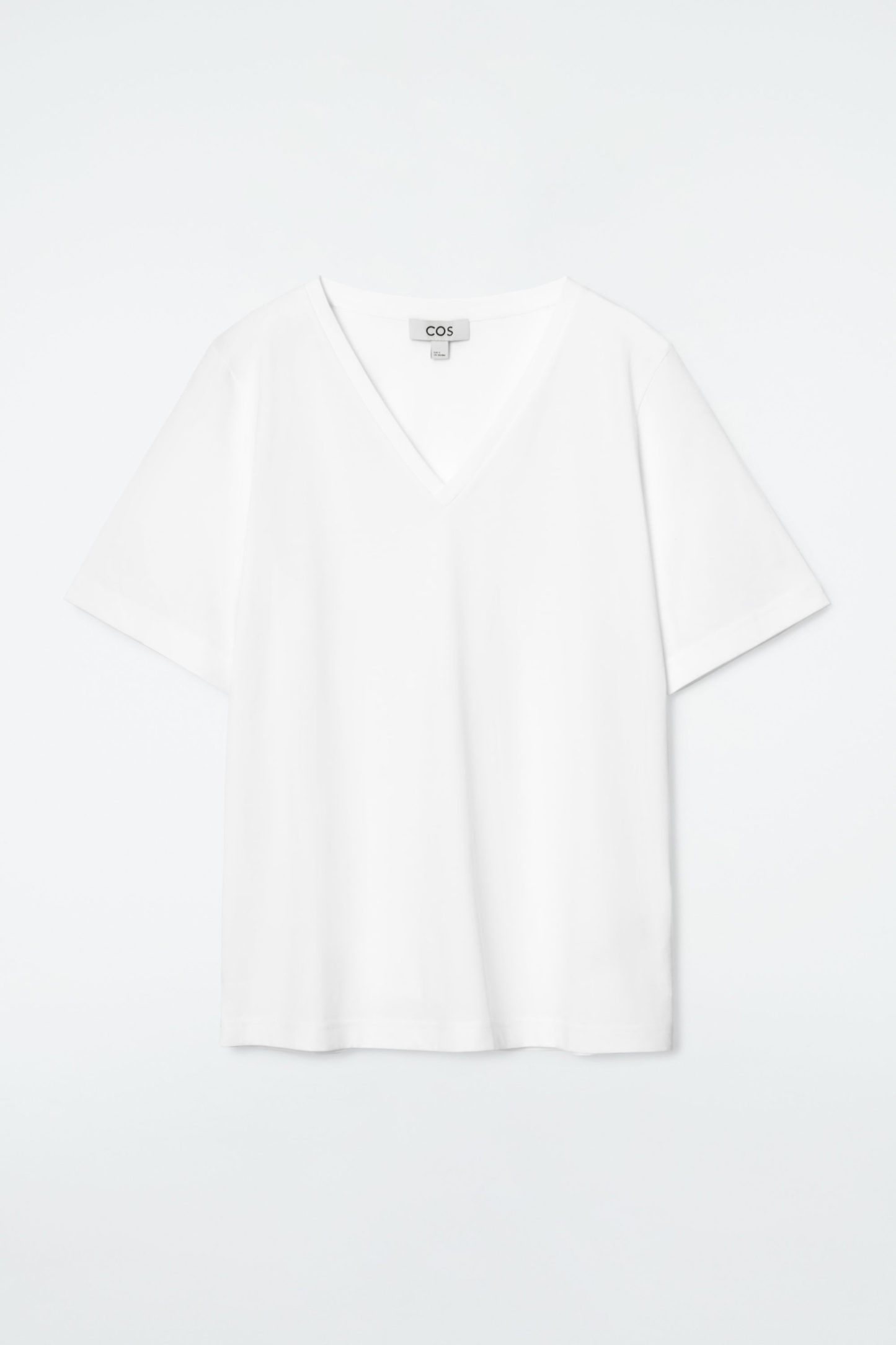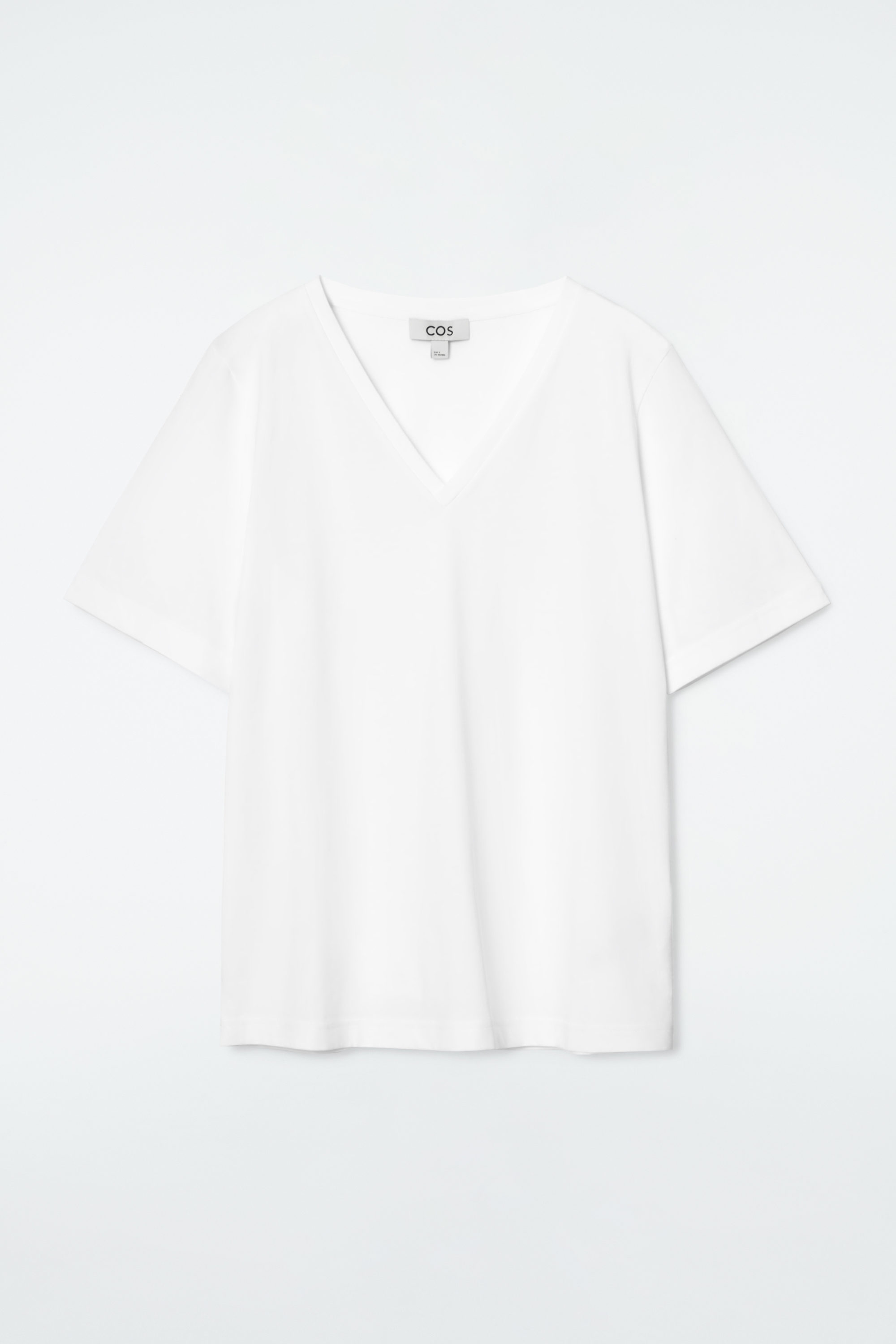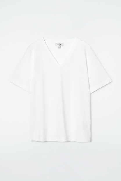 T-shirts av hög kvalitet har utgjort en del av grunden för cthtos kollektion från start. Den här t-shirten är ett lågmält basplagg som är gjort av mjuk ekologisk bomull i en uppfriskande vit nyans. Den är skuren för klassisk passform med tätt ribbad v-ringning i halsen och stilrena stickningar i kanterna.