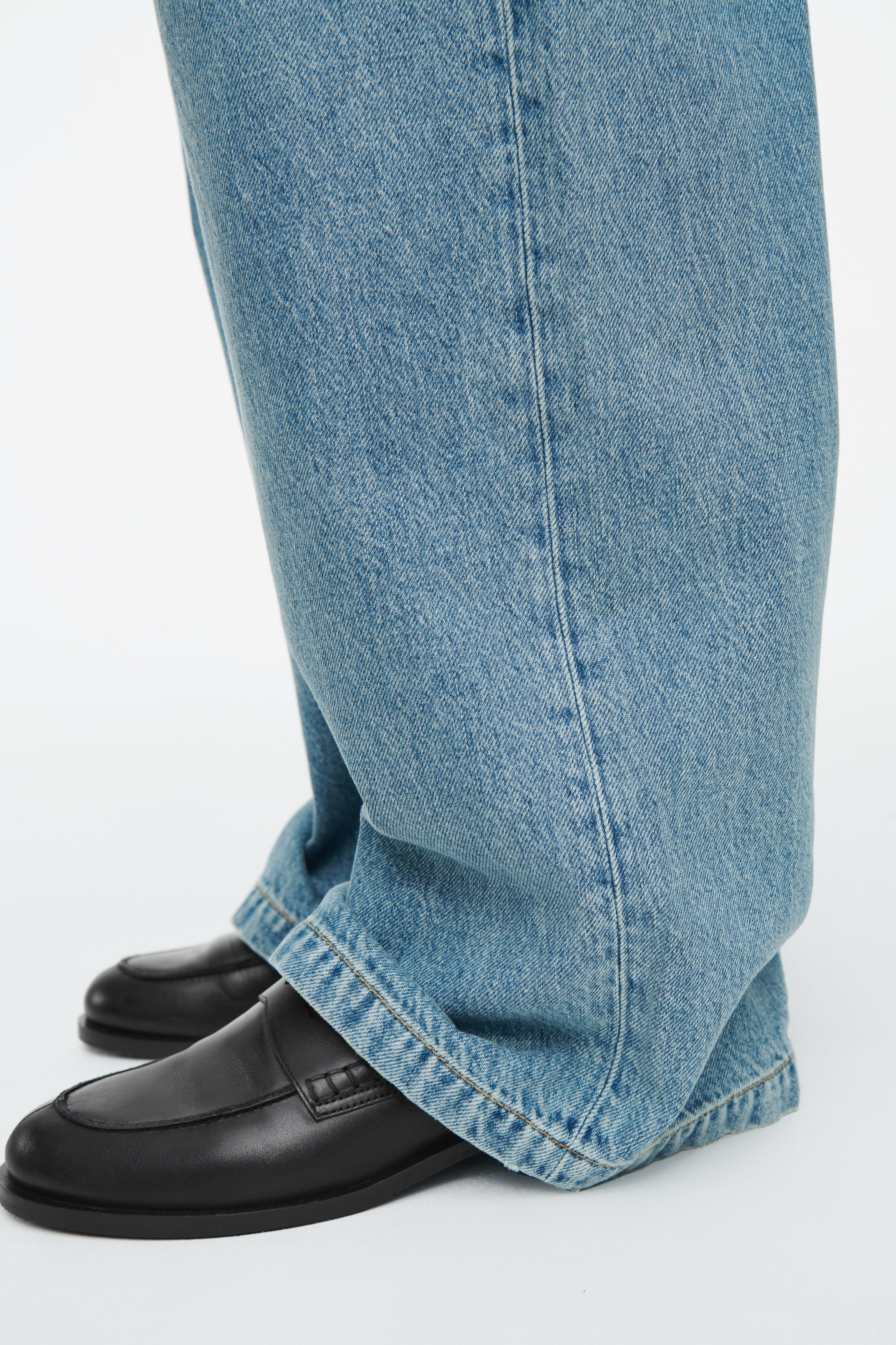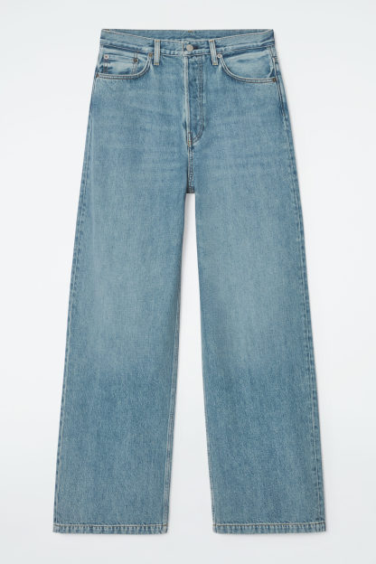 cthtos dammodeteam hämtade inspiration från 00-talets siluetter vid designen av jeansen Volume. De har den låga midja som är så starkt förknippad med epoken och diskreta kontrastsömmar, metallnitar med graverad logga och vida, luftiga ben som ger snyggt fall över skorna. Jeansen är tillverkade av ekologisk och återvunnen bomullsdenim i en dimblå tvätt som har en vikt på 235 g/m².