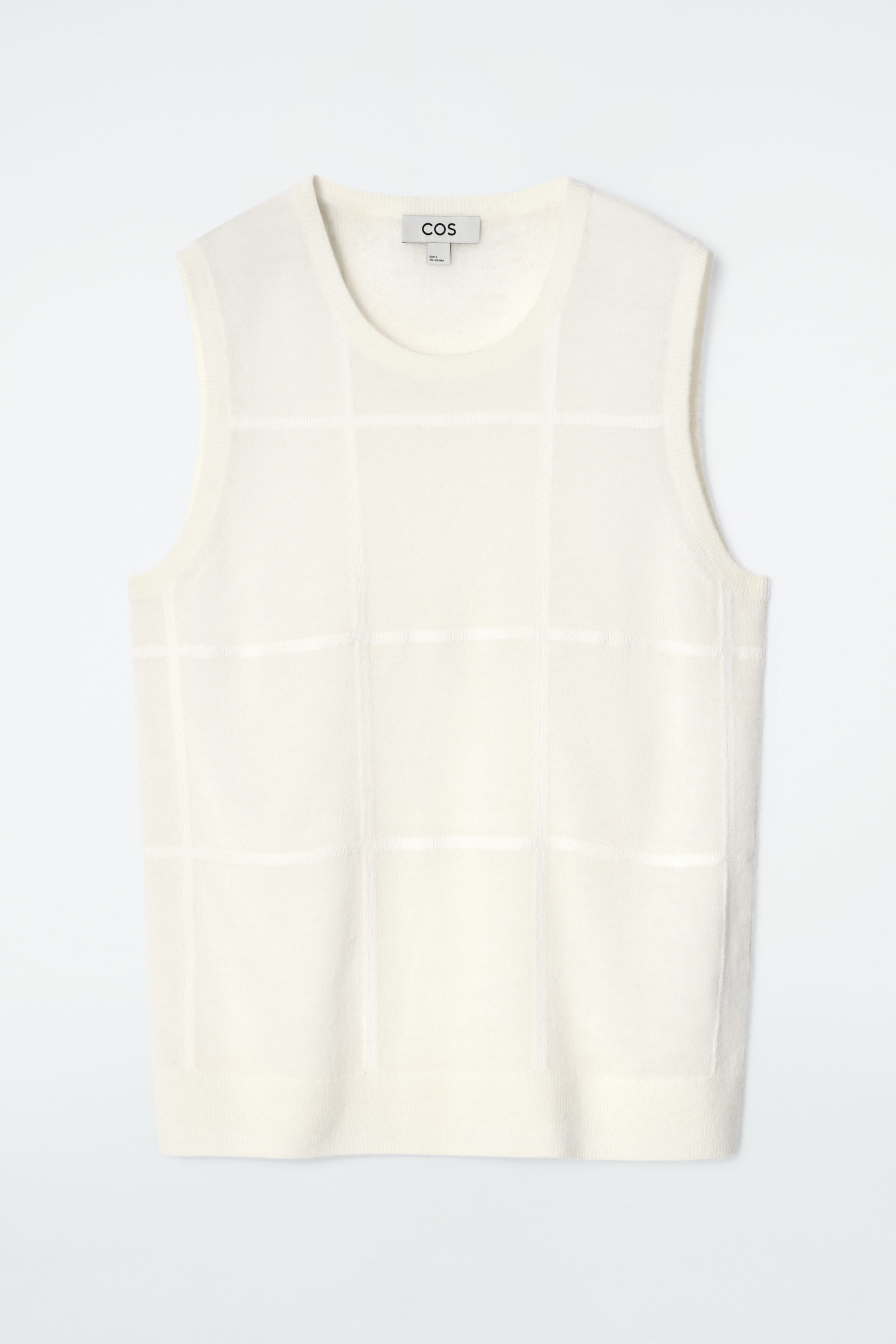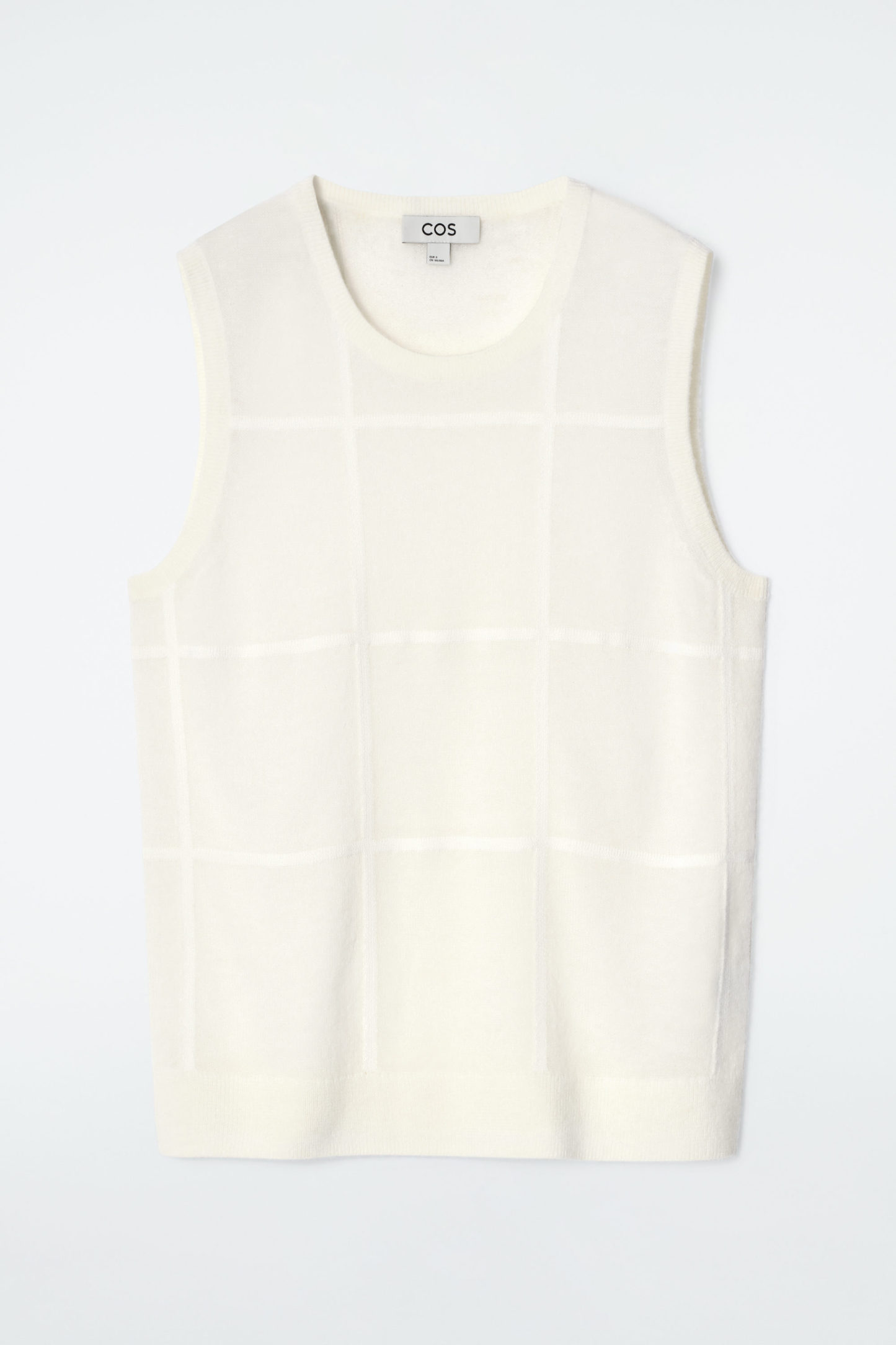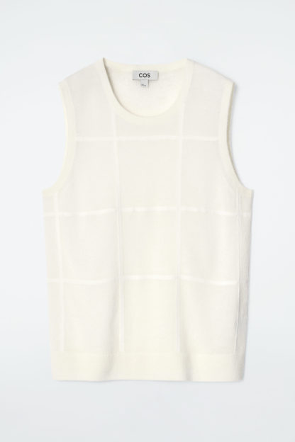 Den här västen är konstruerad med ett storrutigt mönster som visar upp en modern tolkning av klassisk design. Västen är fint stickad i en blandning av alpacka och merinoull i en lågmäld, gräddvit nyans. Den är diskret skir vilket gör den perfekt att bära under den matchande koftan.