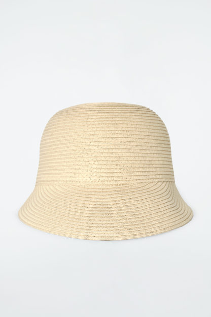 This modern piece falls somewhere between a baseball cap and visor. Intricately woven from paper straw, it has a tilted shape and wide, sweeping brim to shield the eyes.